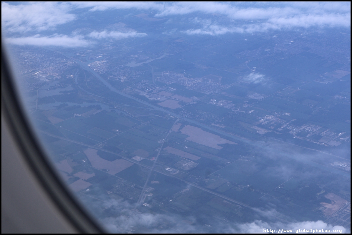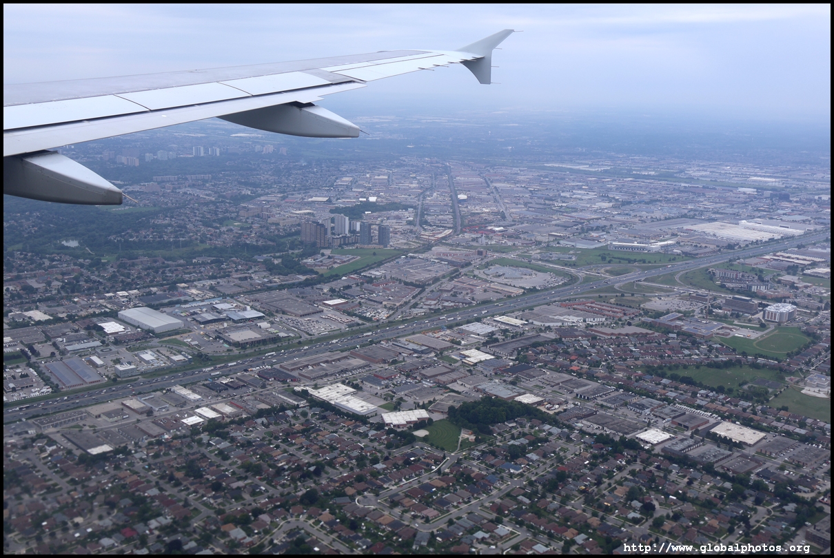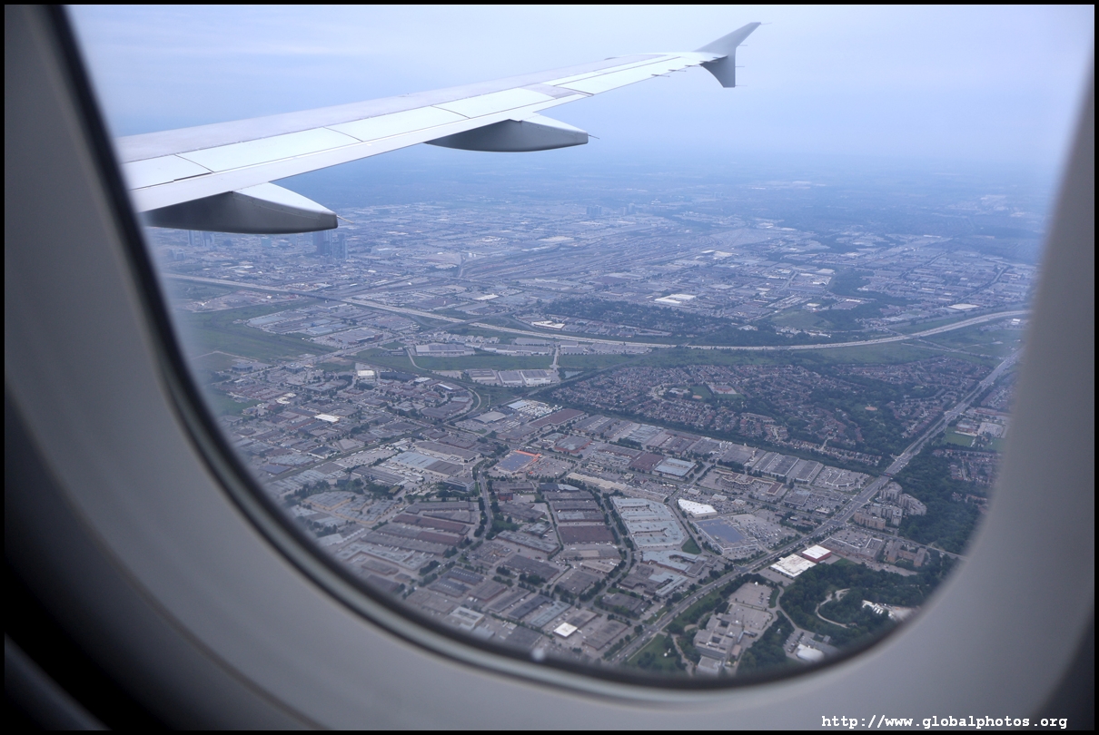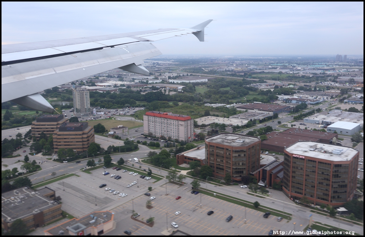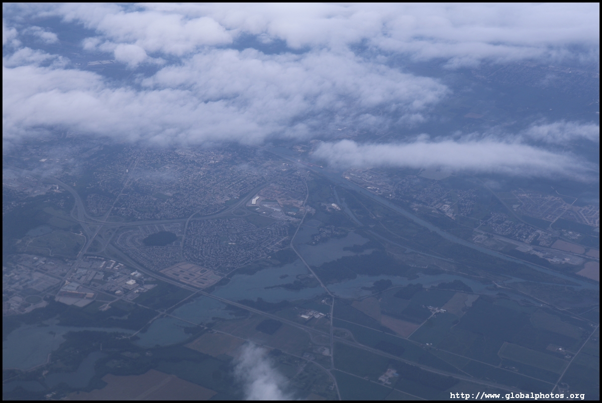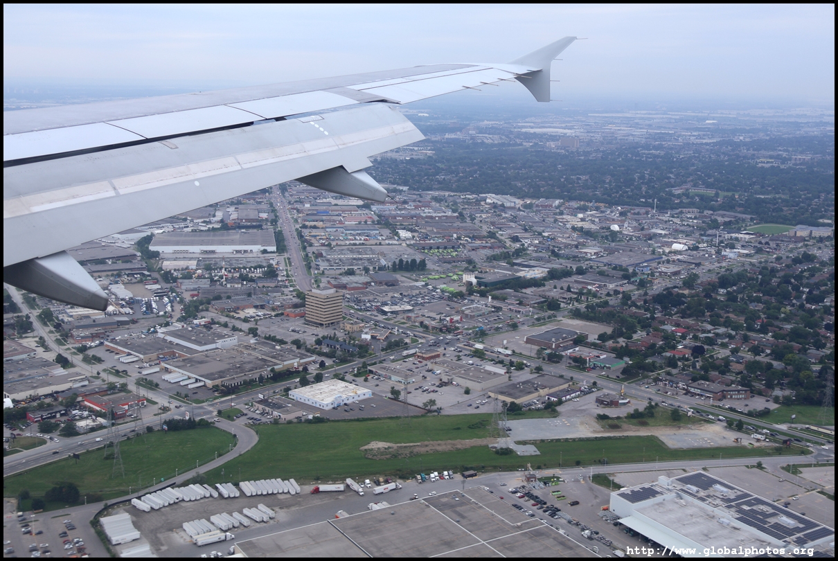 The crew came around with biscuits and a free drink and the flight passed by uneventfully. There were some breaks in the clouds as we started our descent and I could see the Welland Canal and its Lake Ontario exit.