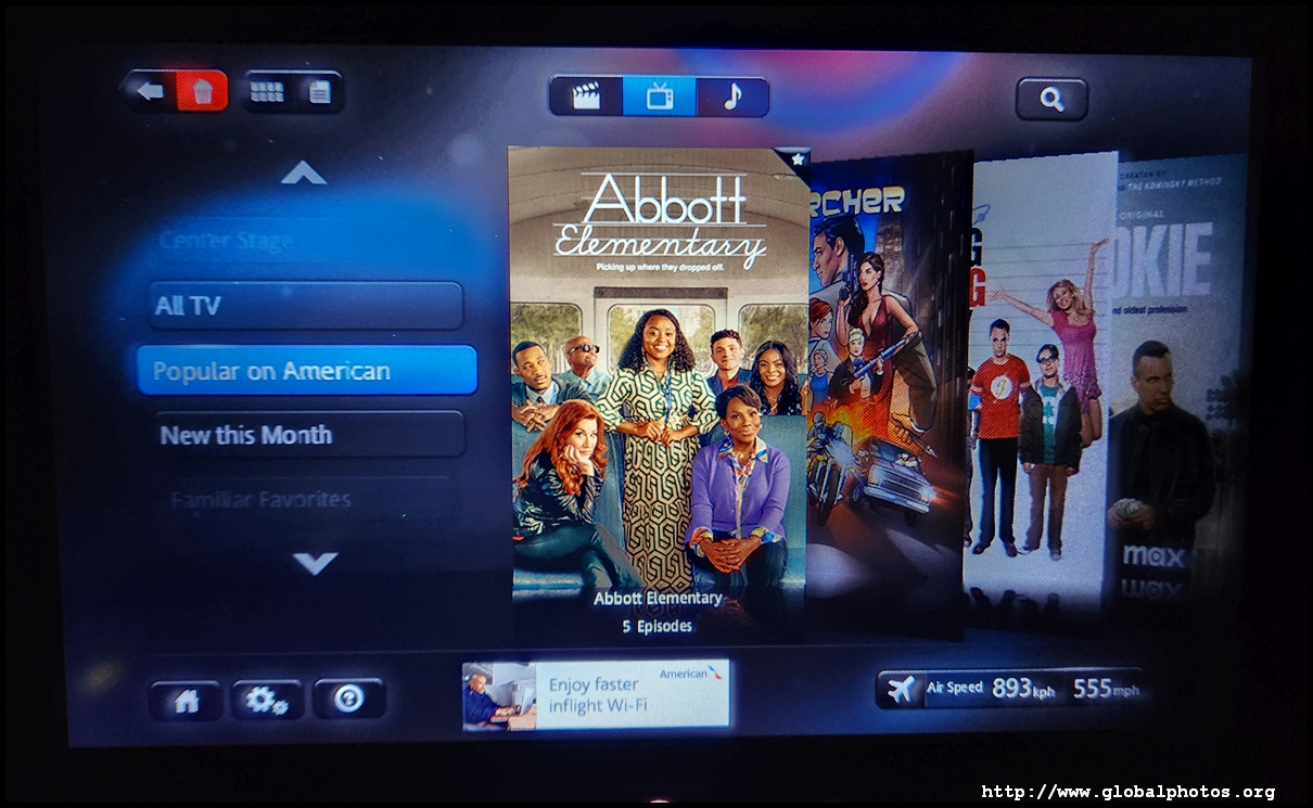 Each seat has its own PTV and the IFE system can be managed by a very responsive touch screen. There is quite a lot of selection available with many episodes of Big Bang Theory. The map has many viewing angles to my satisfaction.