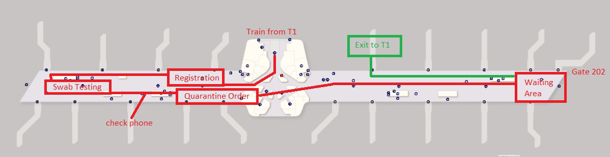 After browsing the net and not even depleting the battery, staff came to distribute back my quarantine order. It was stamped "checked" on it, and I could pack up and leave. By now it was 11:52am. The 2 hour wait was very reasonable and we then proceeded to gate 210, where staff scanned our quarantine order and we descended down the jetbridge back to the arrivals level to take the train to the main terminal. Walking down the bridge made me feel like I'm boarding the plane again.