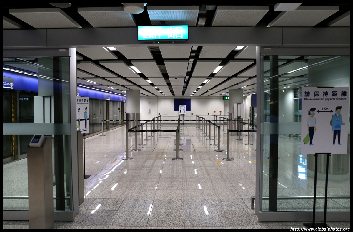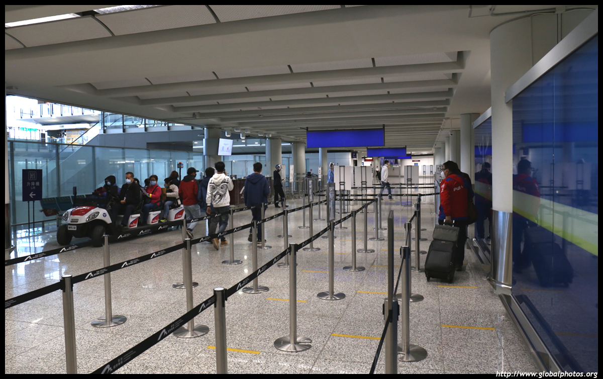 After exiting customs, staff checked and directed quarantine order passengers to exit left for shuttle bus registration. Airport workers would exit into freedom to the right. At the registration counter, they stuck a label onto my green card for the bus line. They would release the line to the elevators for boarding at street level.