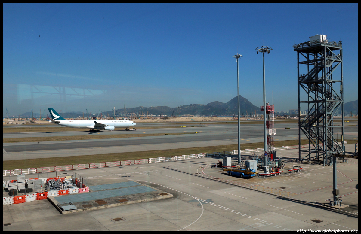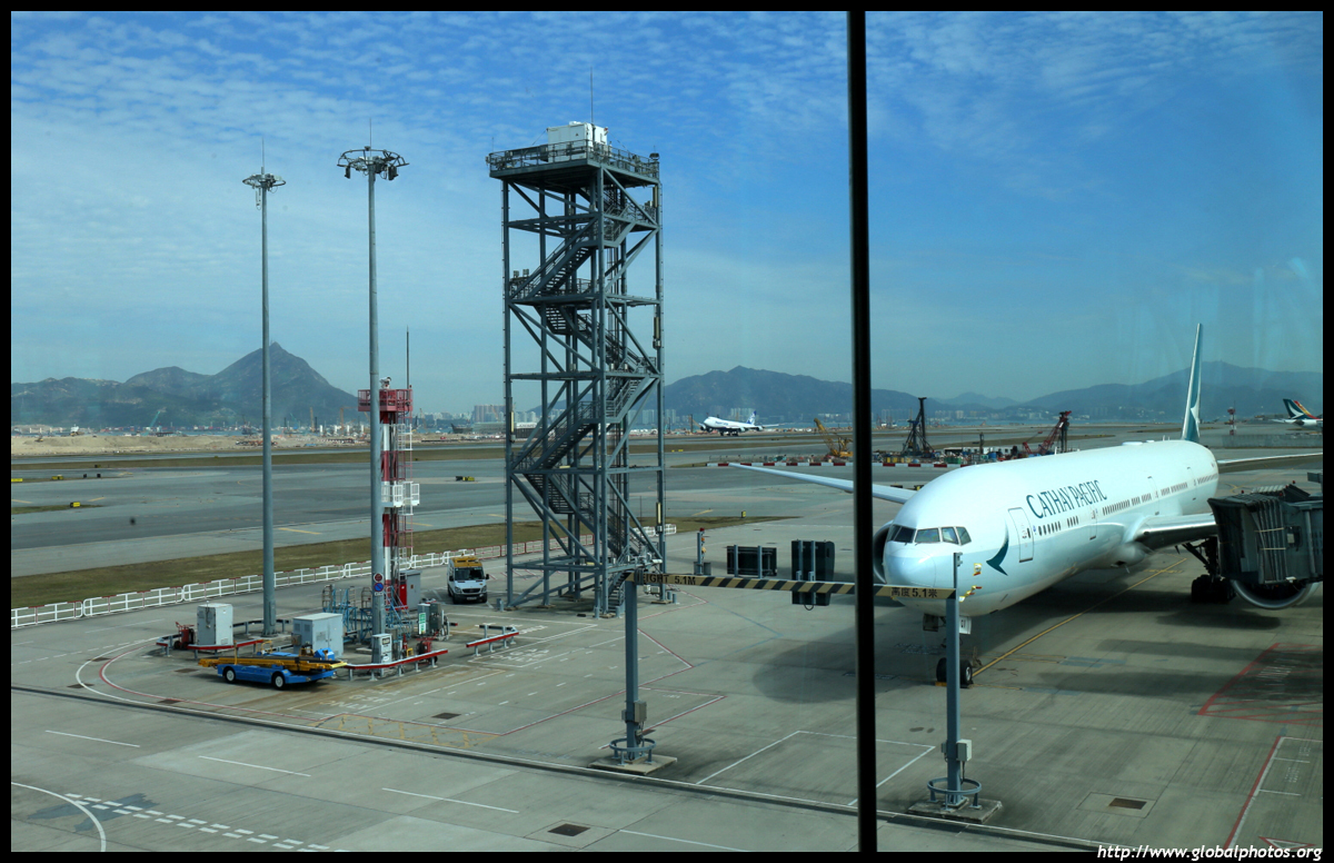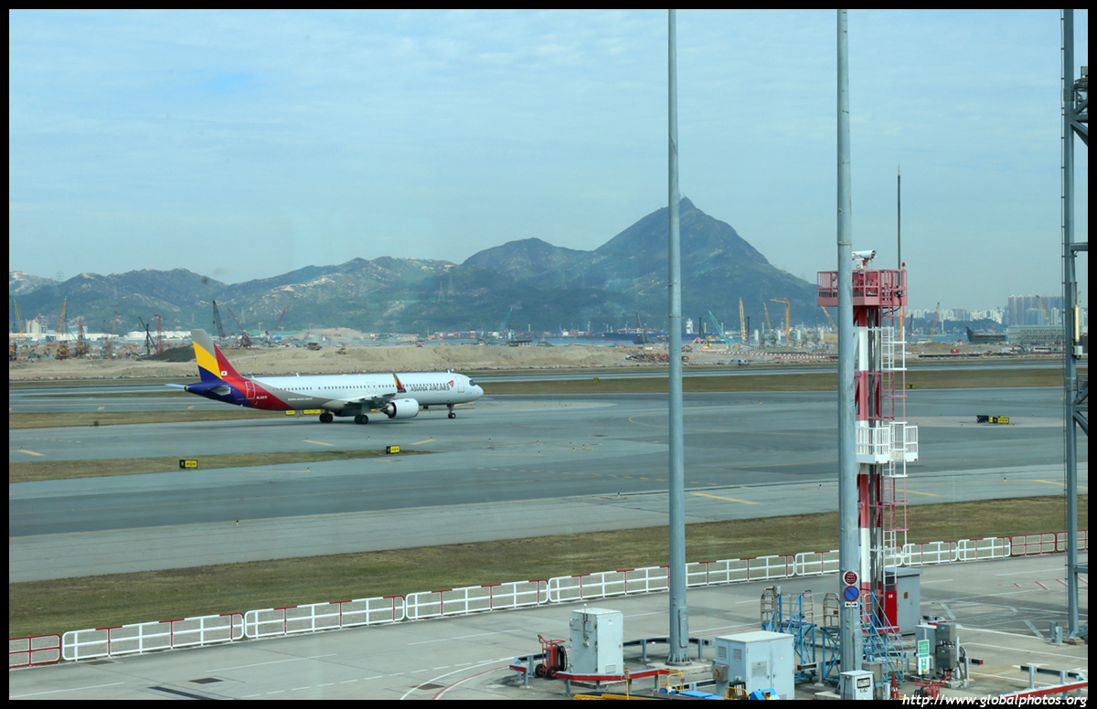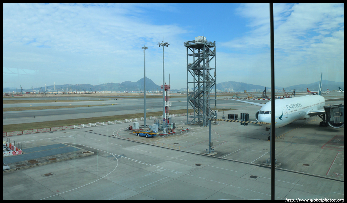 By now it was 9:45am, about an hour and a half since landing. I was happy I got a window seat that looked to the north runway and Tuen Mun in the distance. The landing runway switched direction by the time I sat down so I could see planes coming in and taxiing to the gate. There wasn't a lot of activity but that kept me busy for a while.
