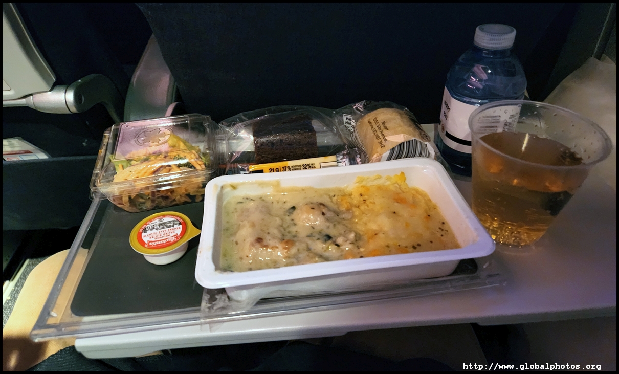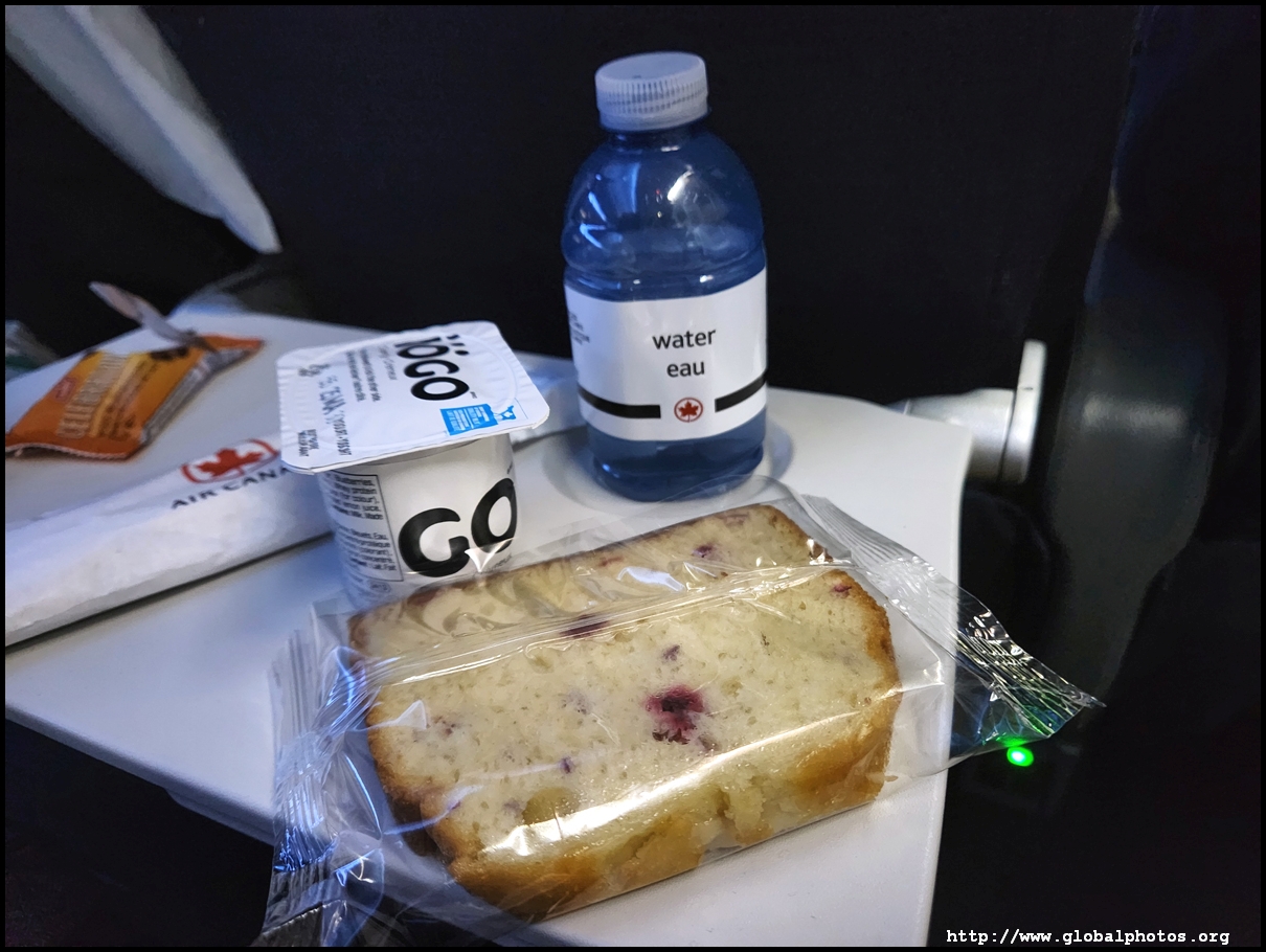 Transatlantic meals are free and despite being at the back, I was still given the 2 dinner choices by the time the cart reached me. Tonight's choices are chicken with mashed potatoes and a vegetarian pasta. Learning from experience, Air Canada's catering isn't good so I never have high expectations. Having had dinner already before leaving for the airport, I didn't feel too bad about the very salty chicken as there was a bread roll and cheese to offset.