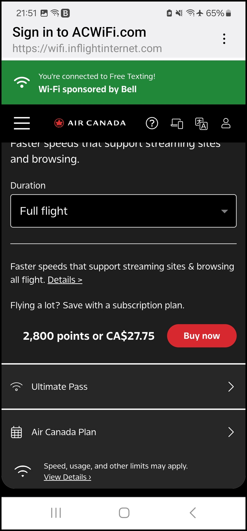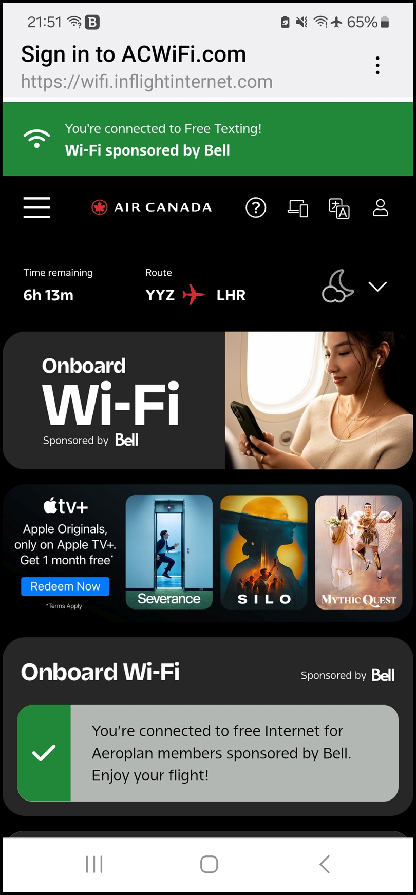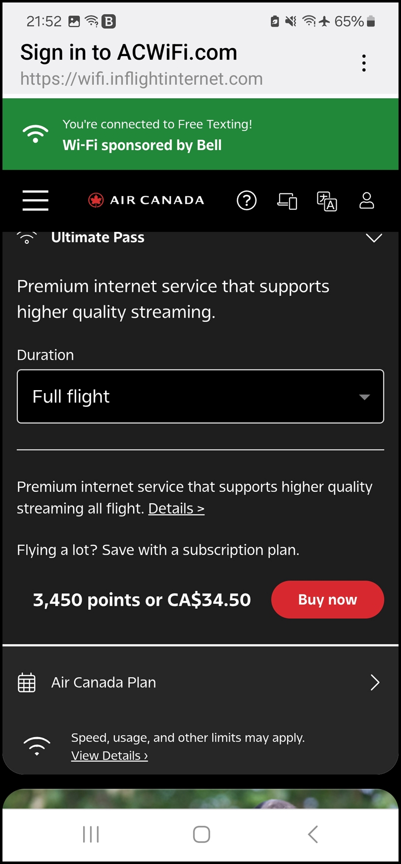 Free wifi messaging is offered for Aeroplan members and during online check-in, it gave a reminder to log your membership number so you can get this perk. This is a fairly standard feature amongst many legacy airlines I fly nowadays. BA offers the same for its members as well. Both airlines offer paid packages for better access such as streaming, with Air Canada a little ahead since you can redeem your points for it.