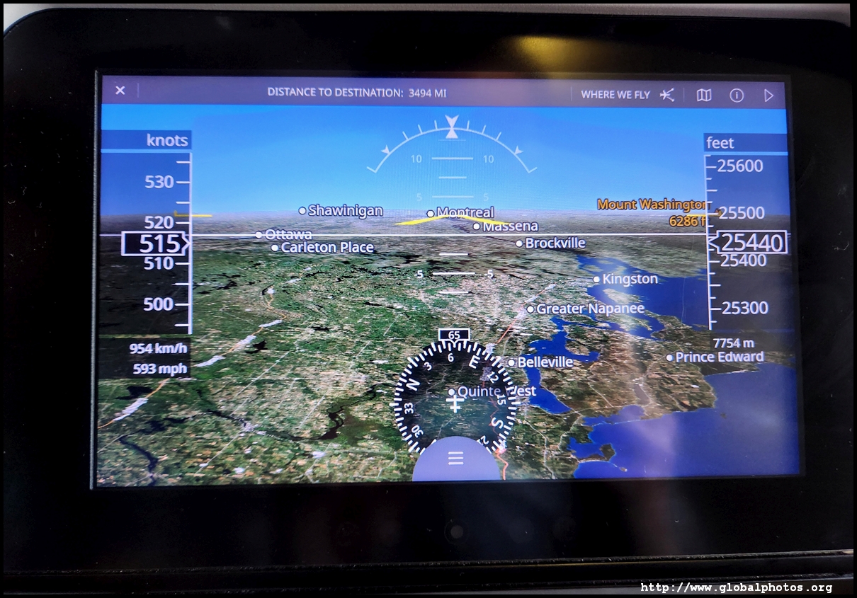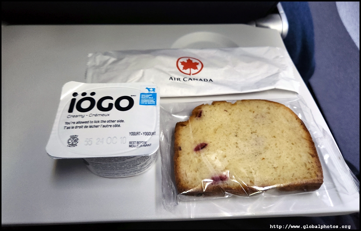 As we reached the mouth of the St. Lawrence River, the skies got a bit more choppy. I've just finished my dinner by now and decided to doze off a bit. 1.5 hours before landing, we got a simple breakfast with a bread and yogurt. They didn't even bother putting them on a tray and just handed them out to everyone.