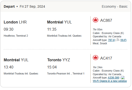 Researching an early autumn transatlantic trip, there really isn't a lot choice if flying direct from London to Toronto. It's pretty much Air Canada, British Airways, or Air Transat for a low-cost option. Westjet no longer flies to Toronto from Heathrow in their great European retreat. Having transited in the US during the summer on the way to Canada, I didn't want to try that again and would prefer to transit at a Canadian airport instead.Wary of Air Canada's high-density 777 as well, I was pleasantly surprised a cheap option came up connecting in Montreal. It's a relatively smaller airport and the Dreamliner flies the route with a short connection and multiple flights to Toronto to choose from. The return flight would be direct from Toronto back to Europe. At about 430 pounds all inclusive for basic economy, it's a decent deal. The Day Before Air Canada's website is fairly easy to navigate 24 hours before departure. Check-in was seamless and it didn't ask for endless information about my passport. I was able to pick a seat on the map for free if I didn't want an extra legroom row. Luckily, the last row was available, where the row of 3 becomes a row of 2, my usual travel hack to win a little more stretching space. The next leg to Toronto was also open to check in and I easily found a window seat on the A330 for that as well. With a 9:30am departure, I didn't need to lose too much sleep to get to Heathrow.