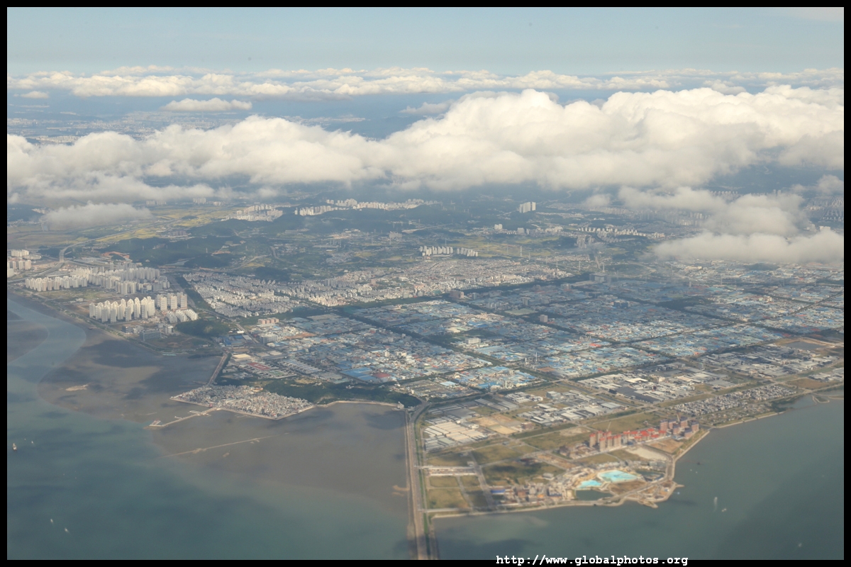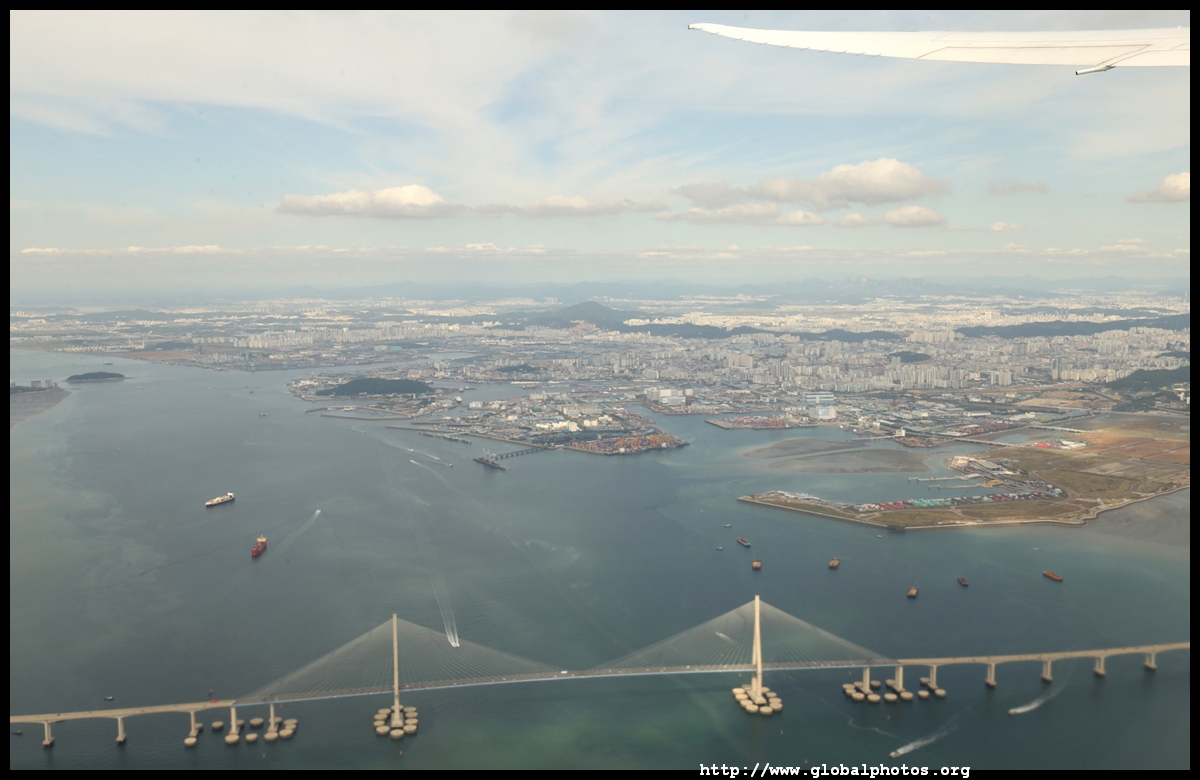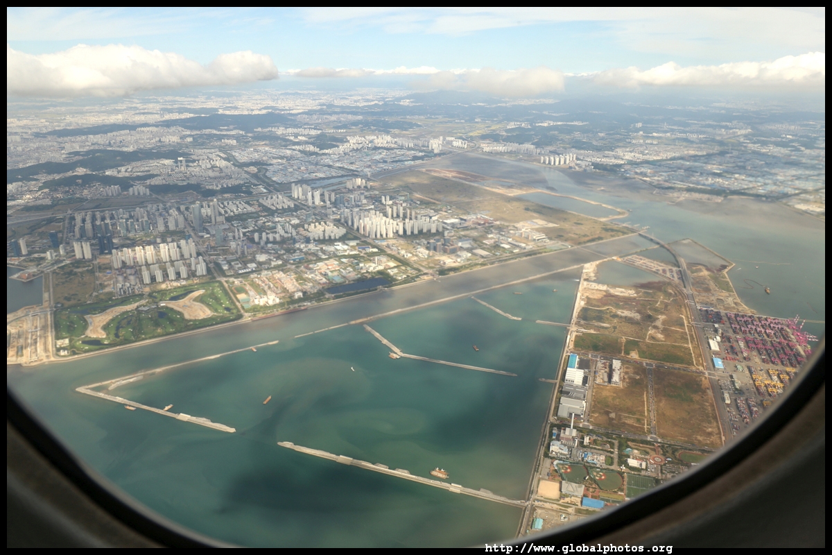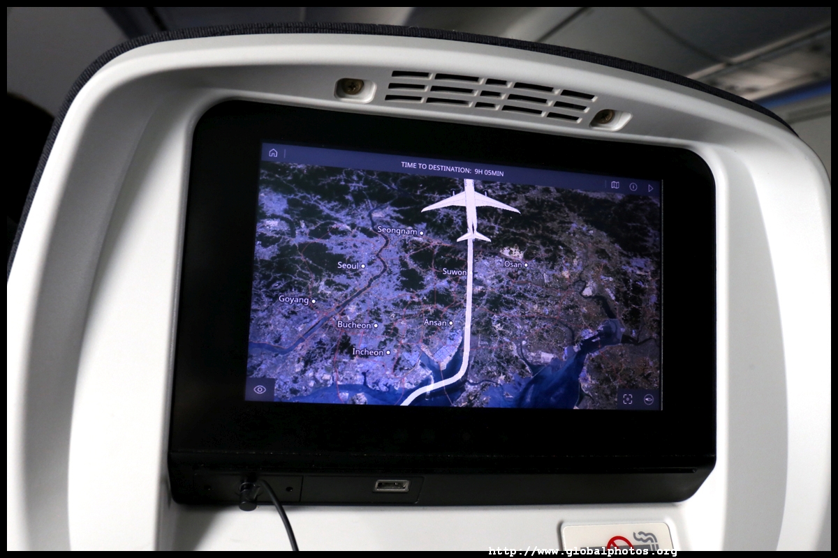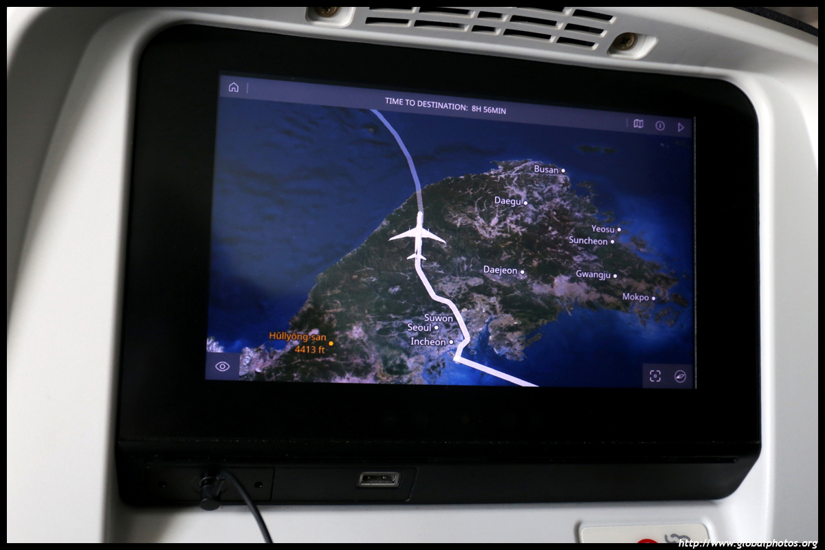 We took off towards the south at 2:35pm for the 9 and a bit hour flight across the Pacific. My left window seat was a wise choice with plenty of city views across Incheon and Seoul. The weather was quite good so there should be some decent aerials to take.