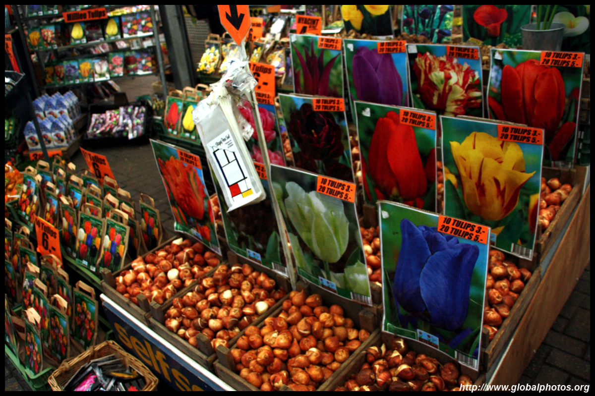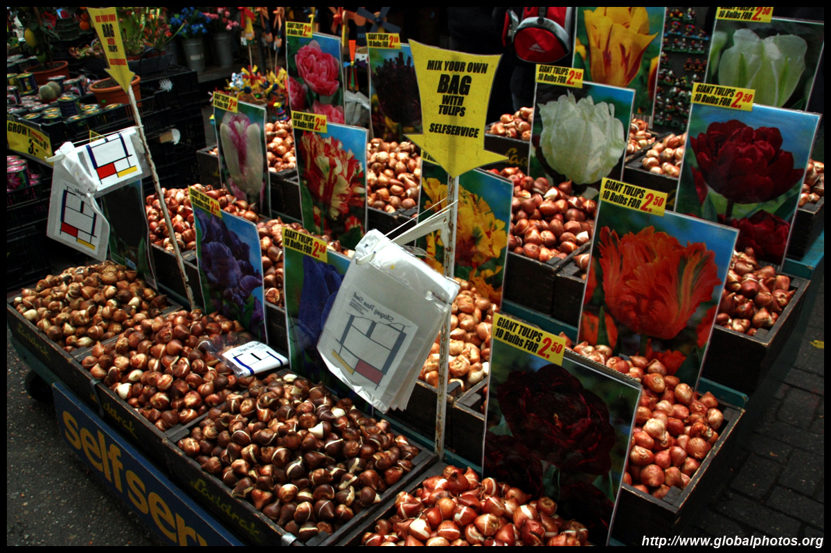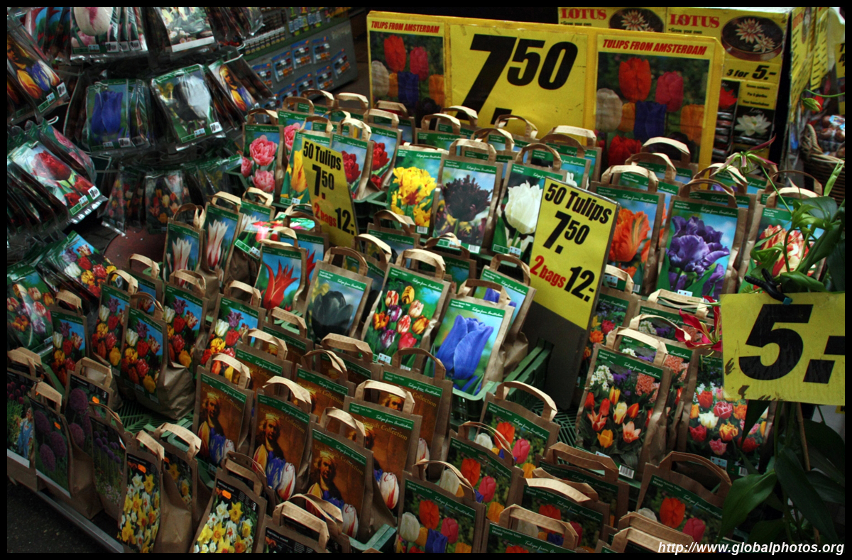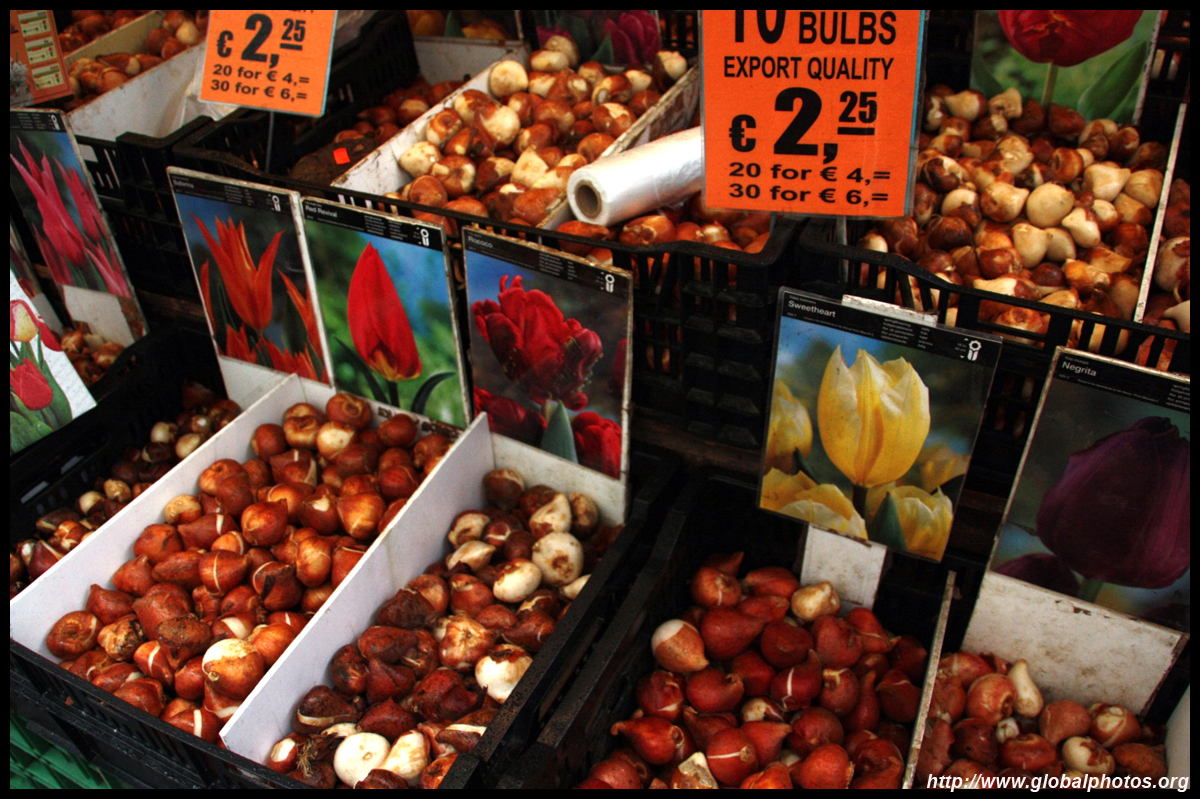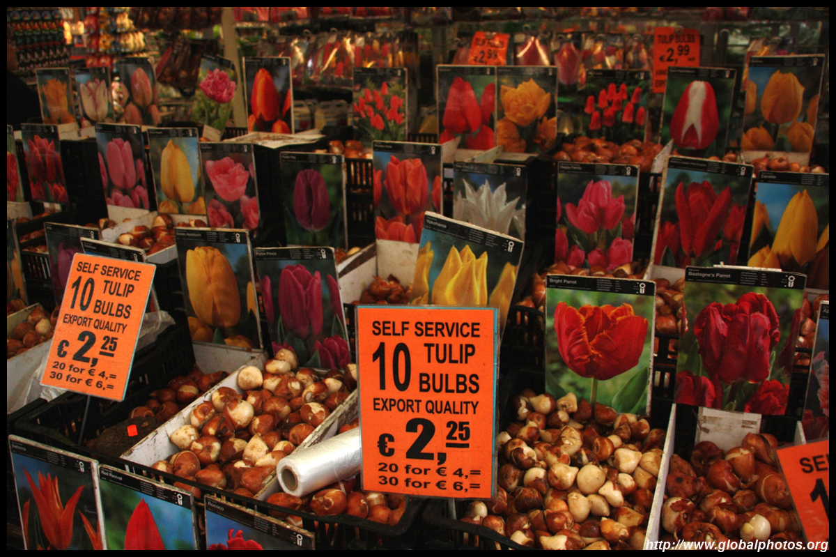The tulip came from Turkey via Vienna and flourished in the Netherlands' sandy soil. It became a huge speculative commodity in the mid-1630s when a few rare bulbs costed as much as a house. This get rich quick frenzy came to a crashing end in 1637 when prices fell to just 10% of its previous value in 3 months. However, the tulip's importance as a flower and association with the country continued.