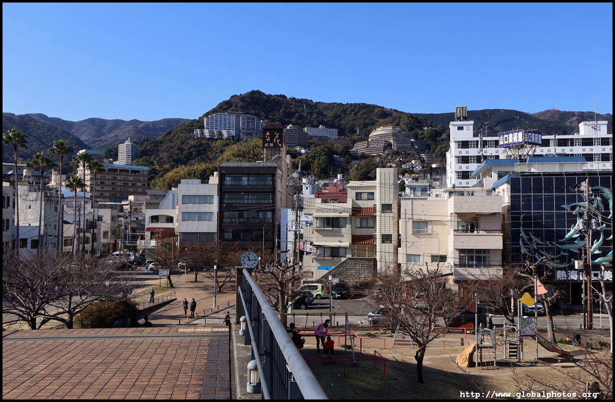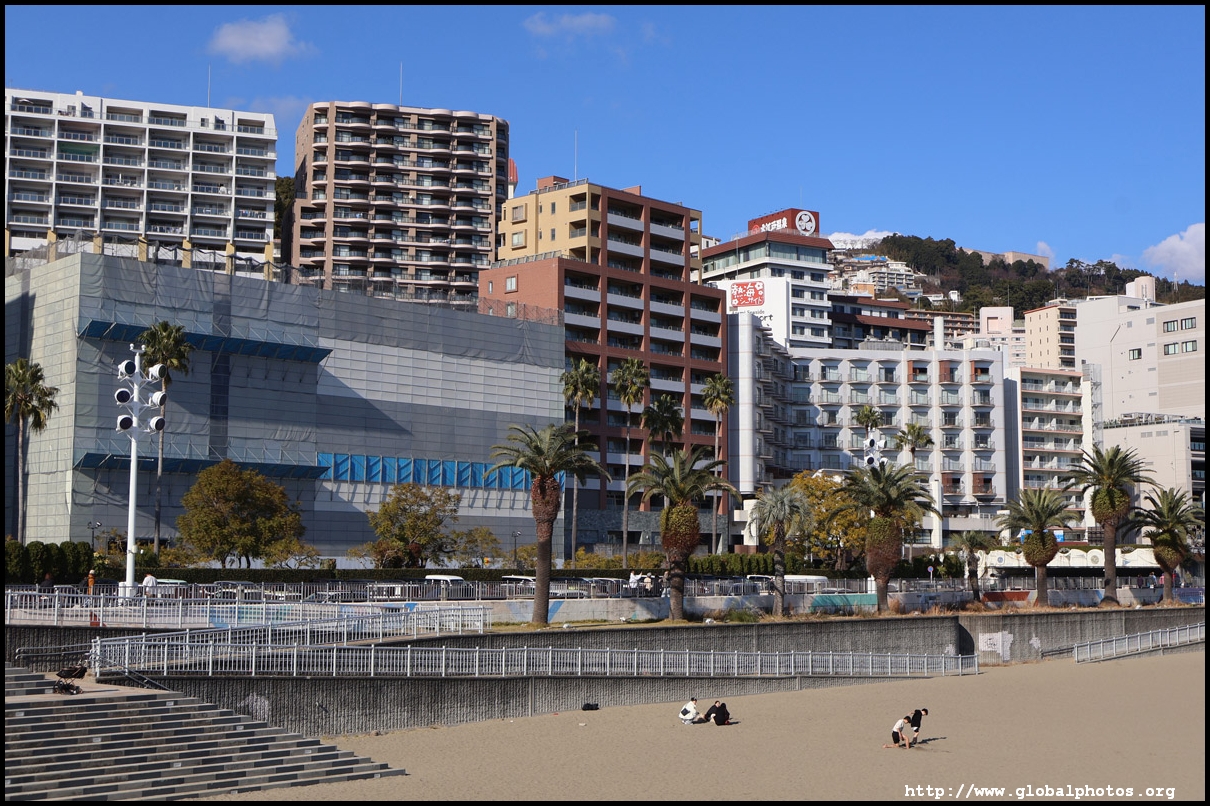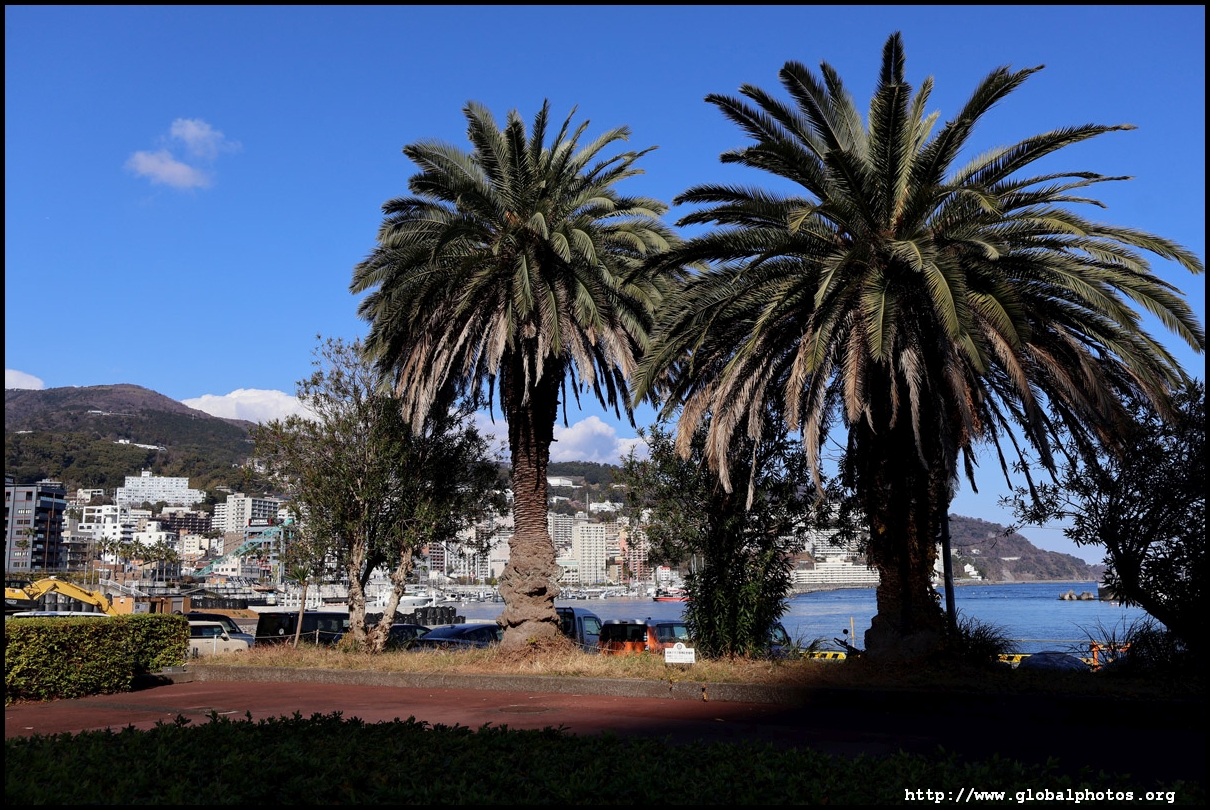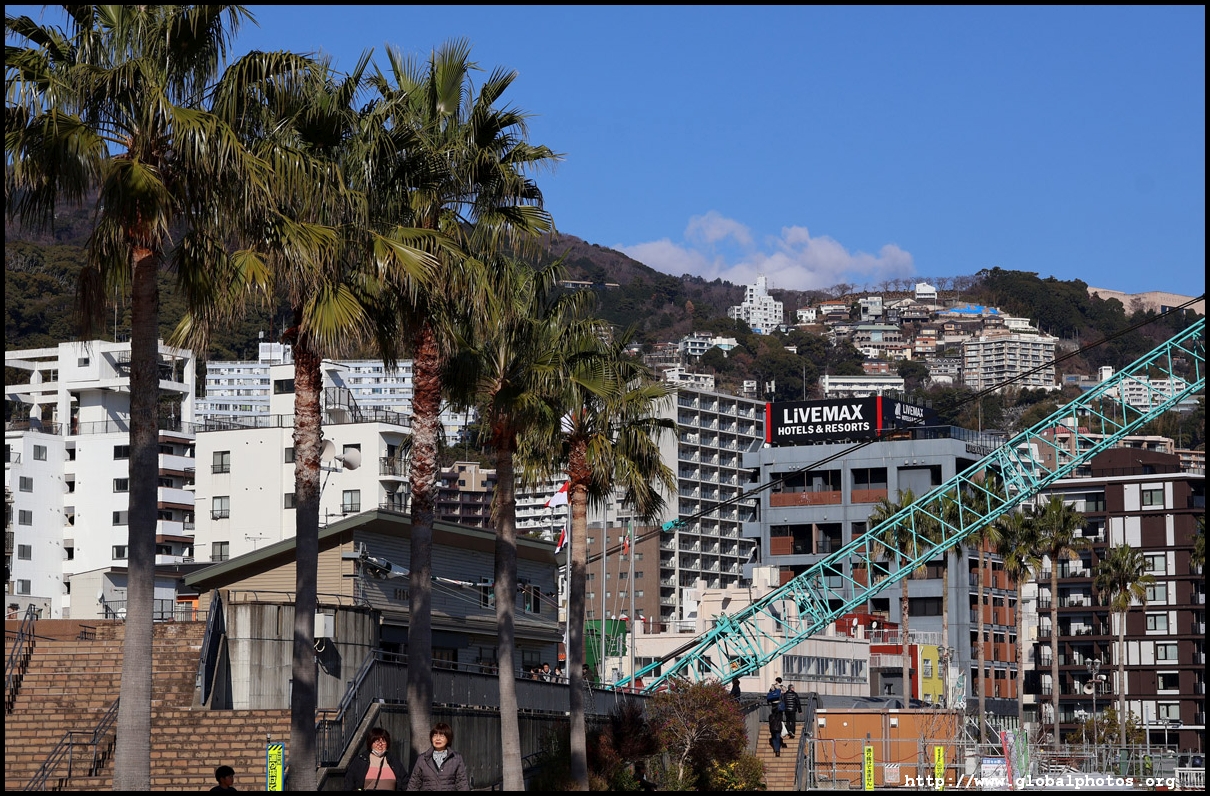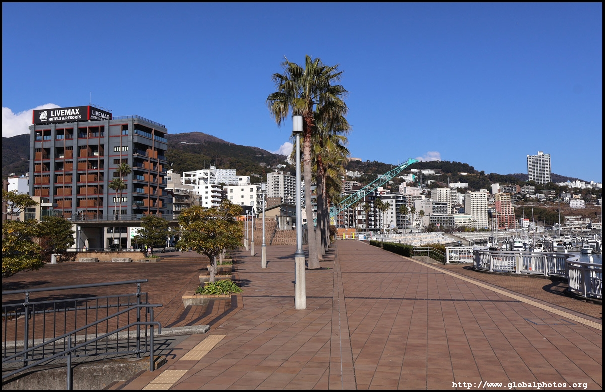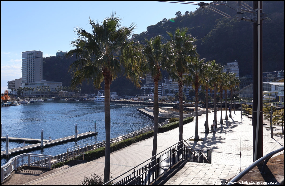 Today's Atami sits on the crater of an extinct volcano, with a beach in the city centre and a long waterfront promenade around it. It is nicely manicured, clean as usual because it is Japan, with a line of palm trees to give you a tropical resort feel.