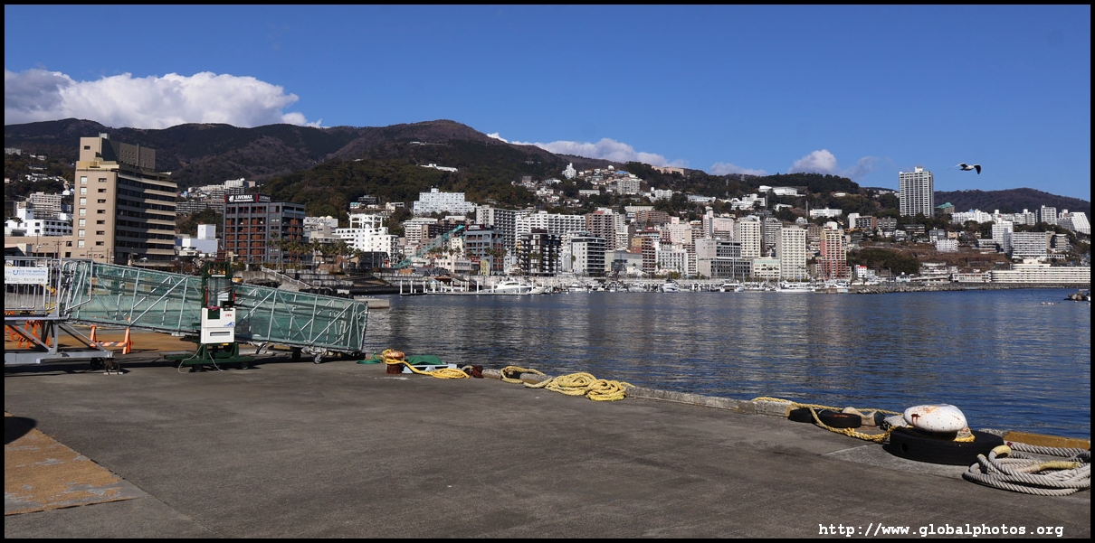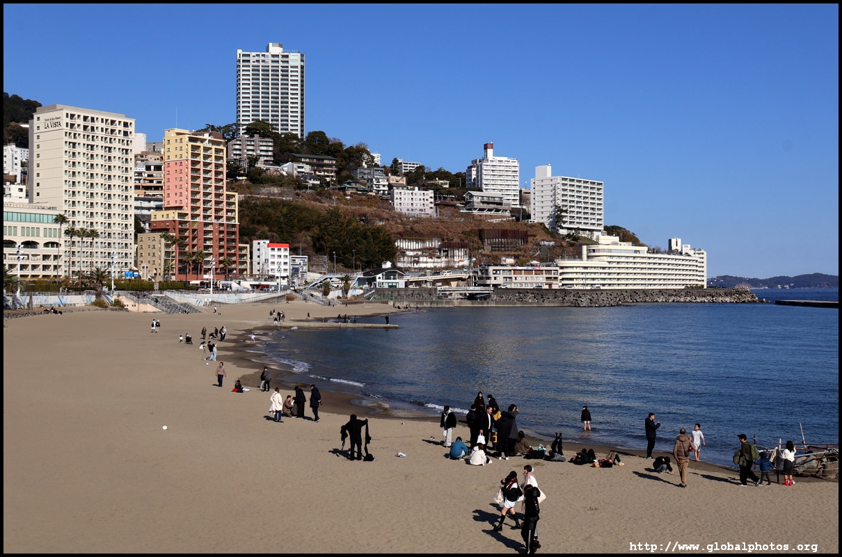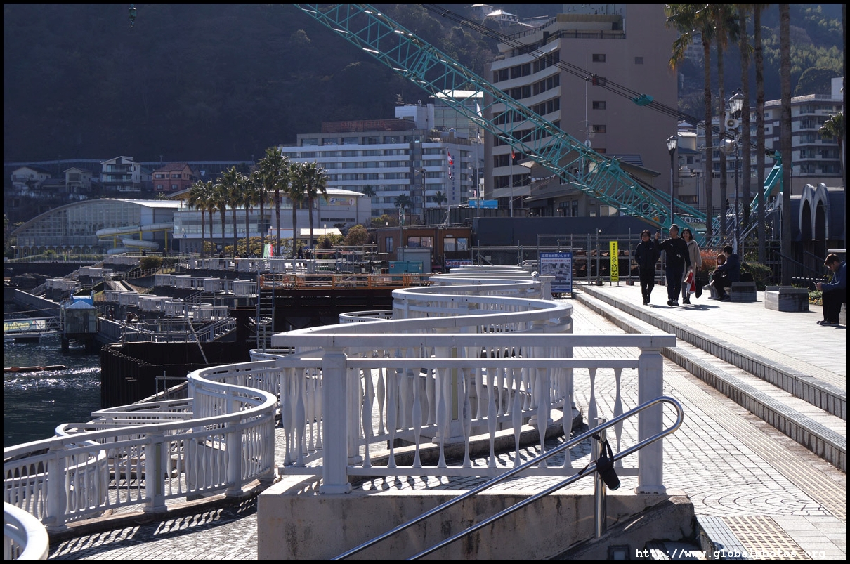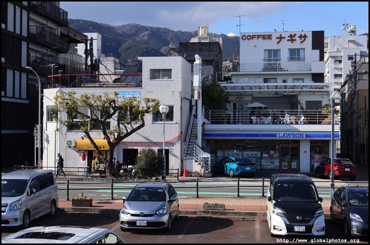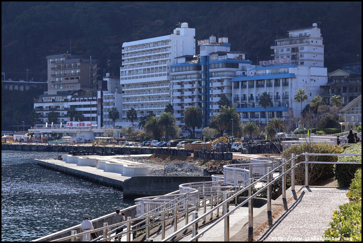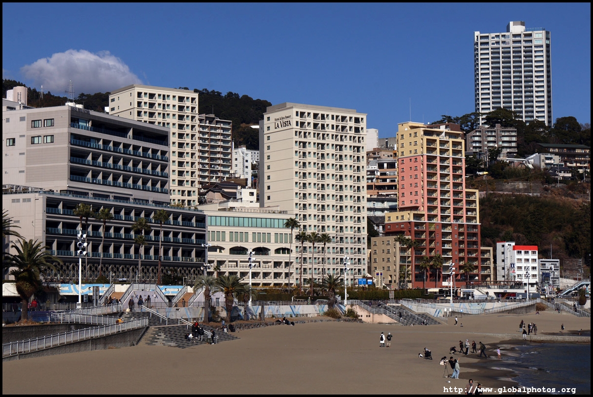 Today's Atami sits on the crater of an extinct volcano, with a beach in the city centre and a long waterfront promenade around it. It is nicely manicured, clean as usual because it is Japan, with a line of palm trees to give you a tropical resort feel.