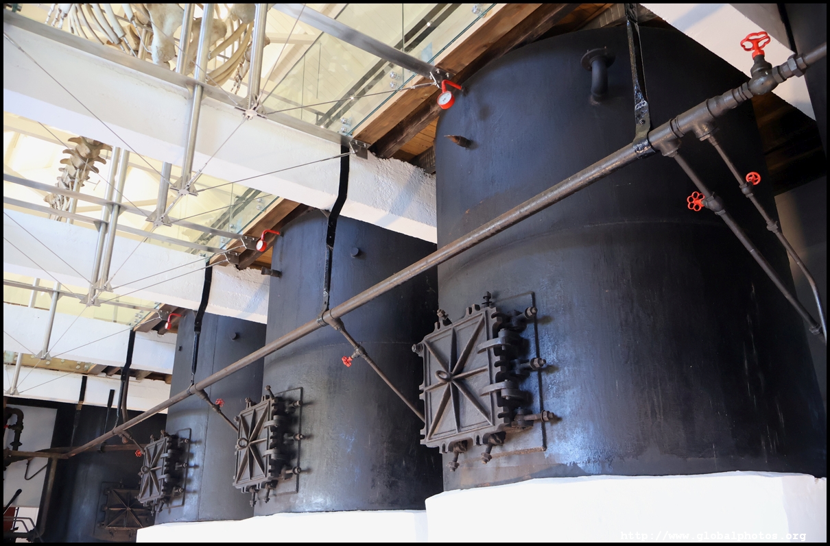 4 cookers were used to extract oil from the blubber, a process that takes about 8 hours. The melted oil goes into a storage tank underneath.