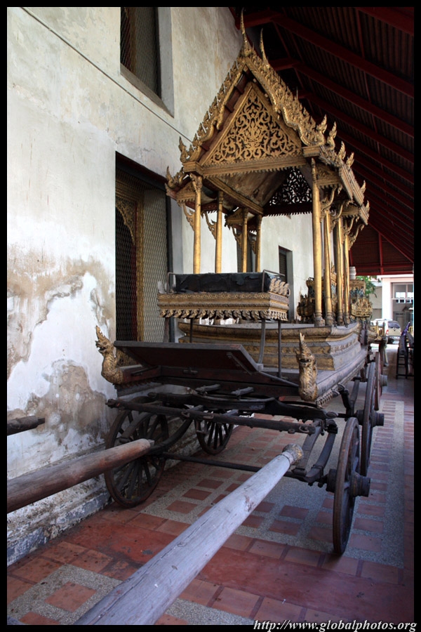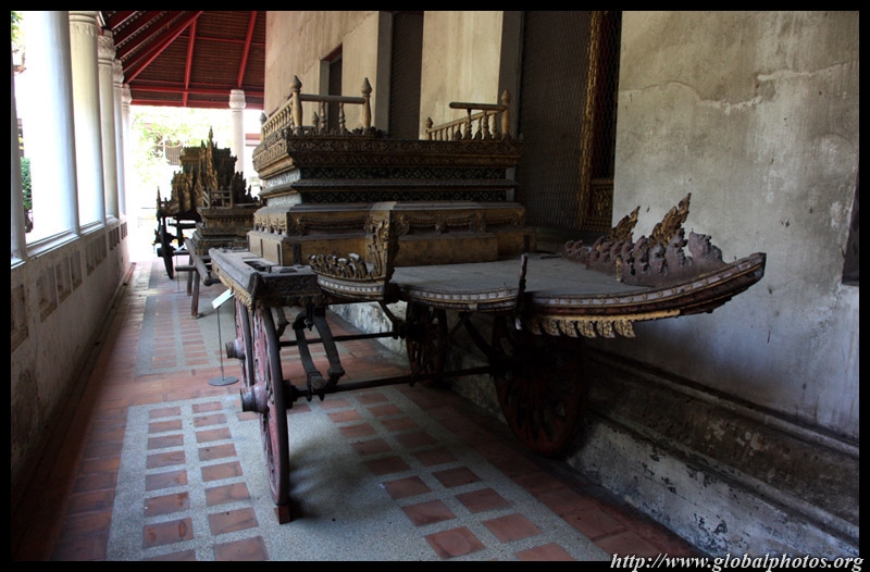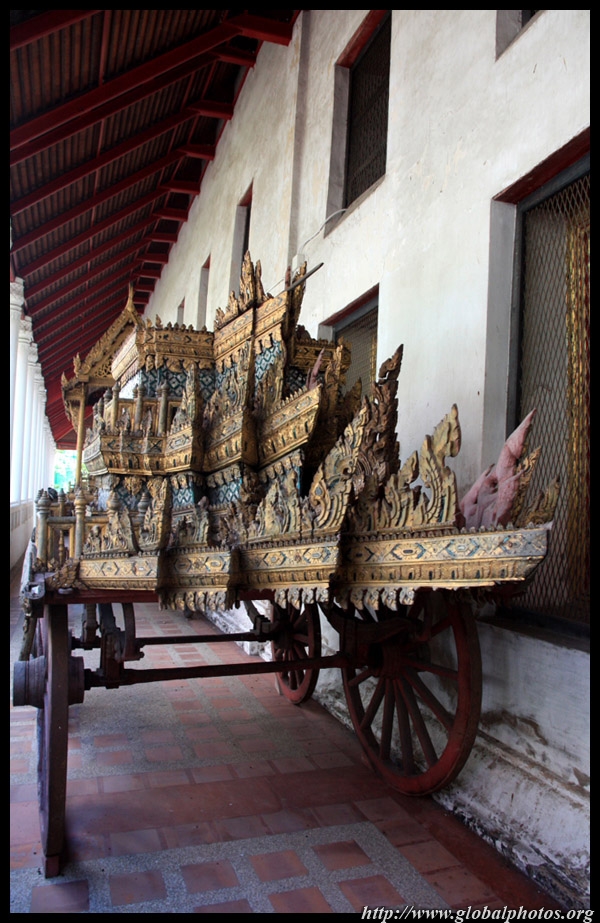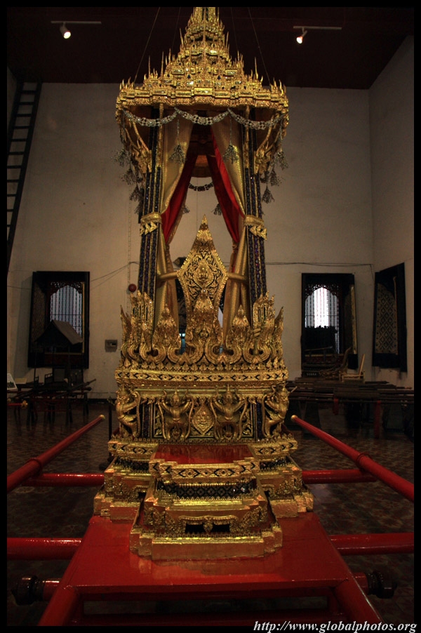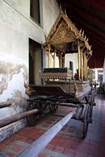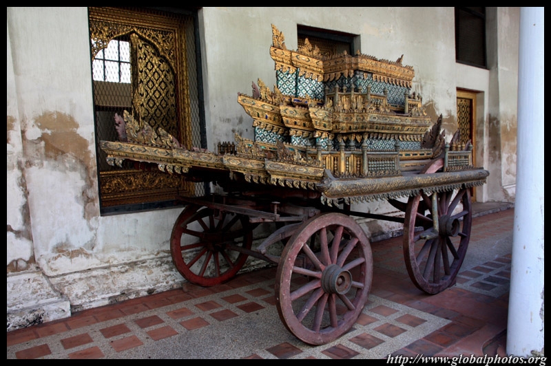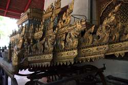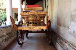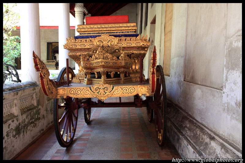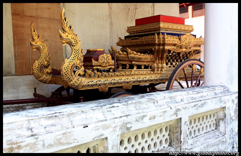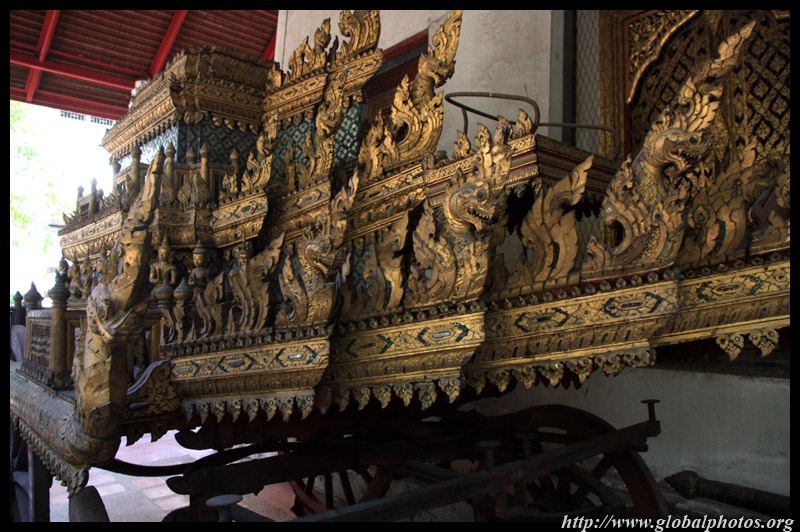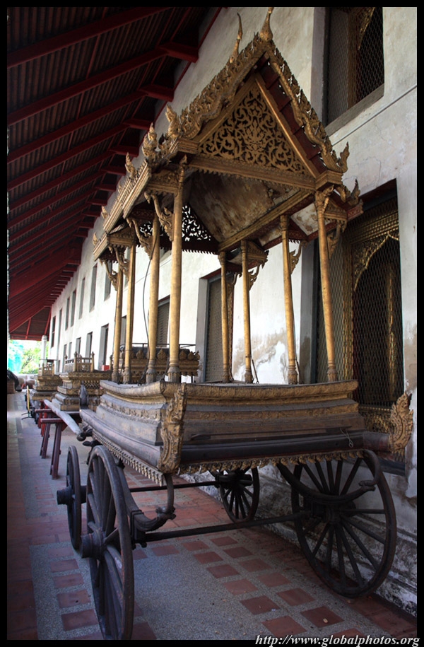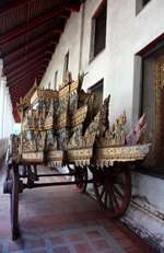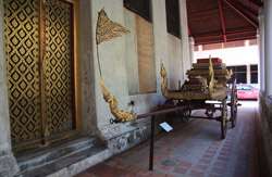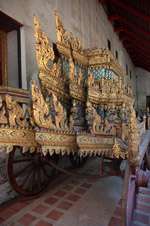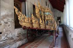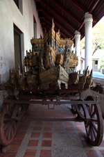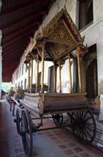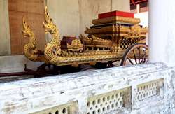 The royal funeral chariots are lined outside along one of the buildings, decorated in typical gold colours.