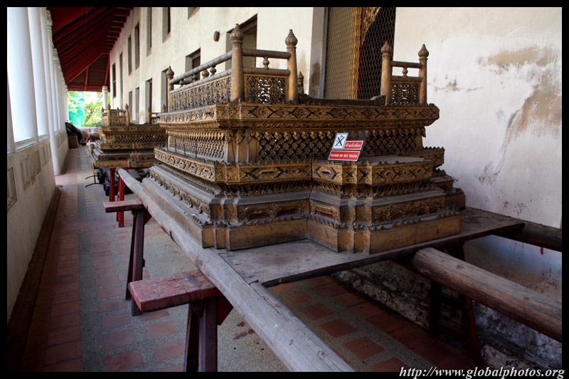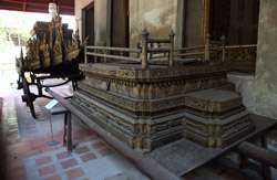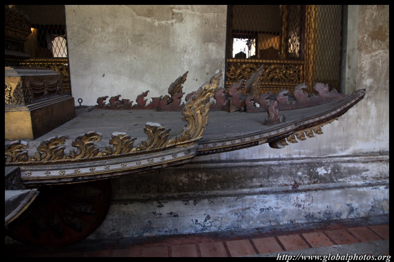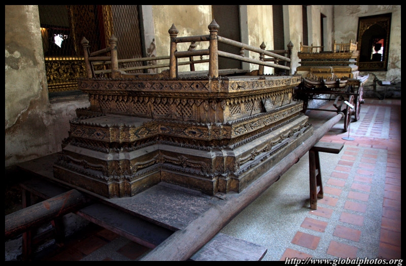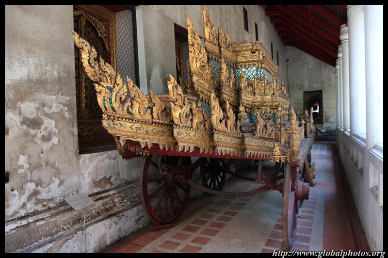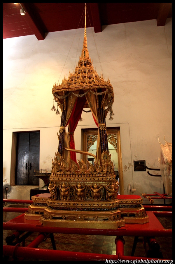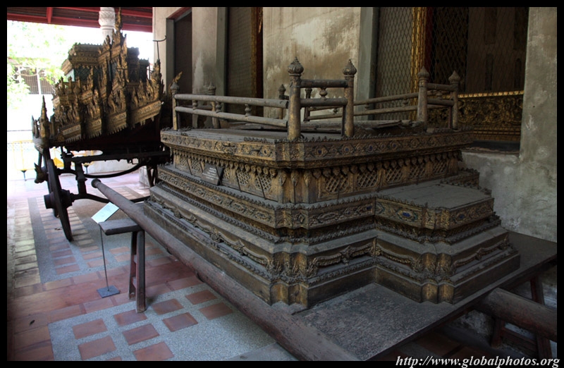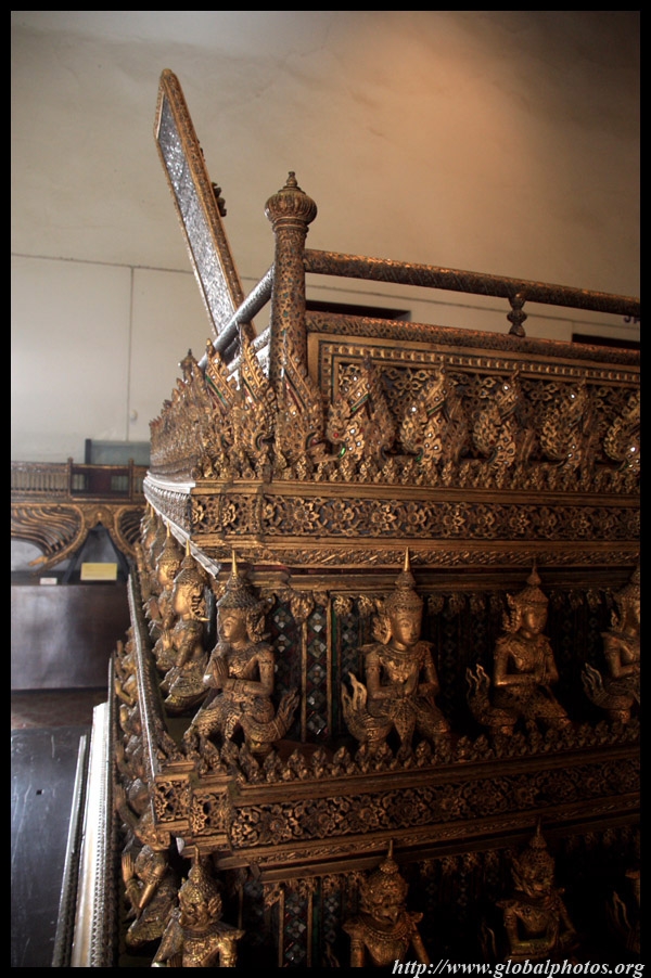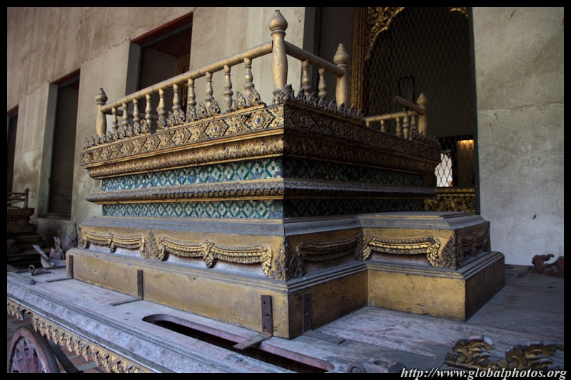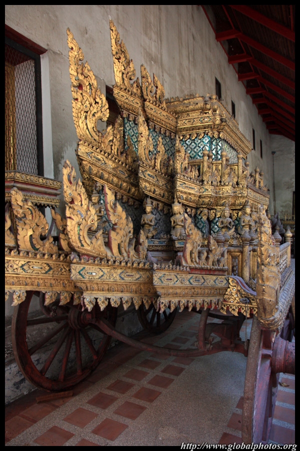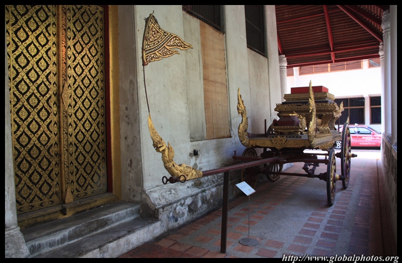 The royal funeral chariots are lined outside along one of the buildings, decorated in typical gold colours.