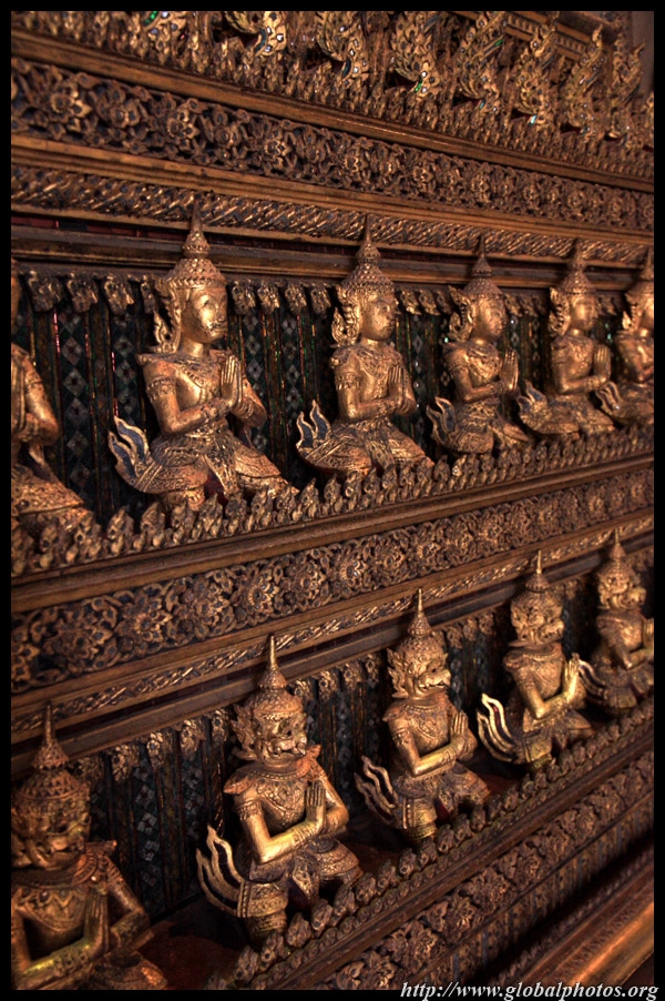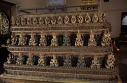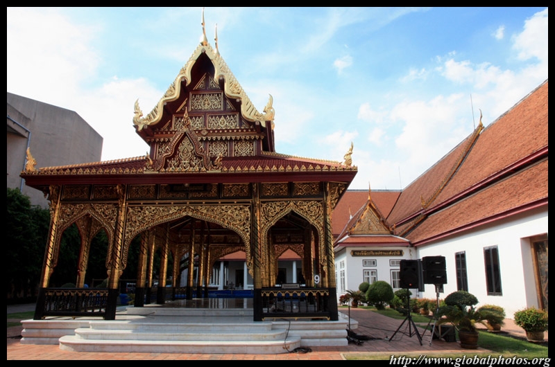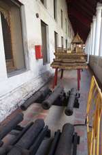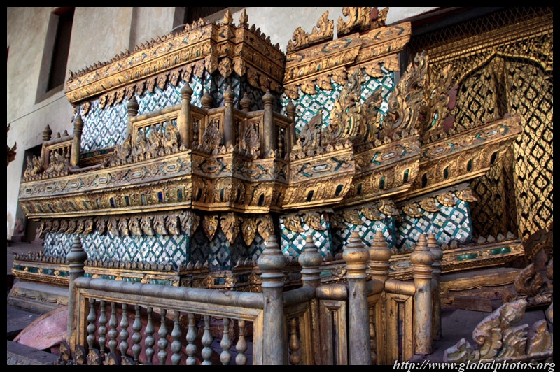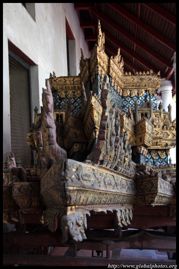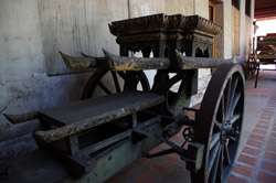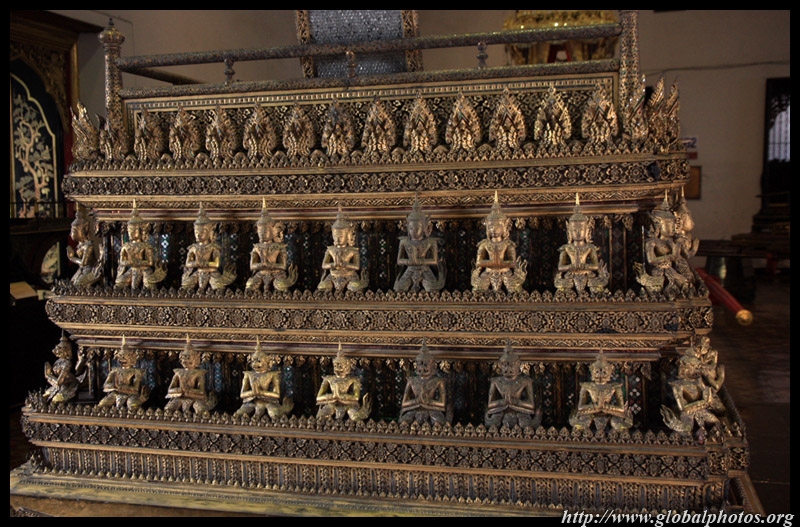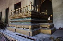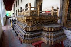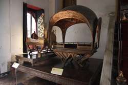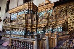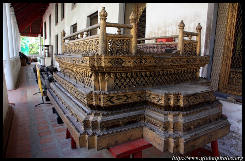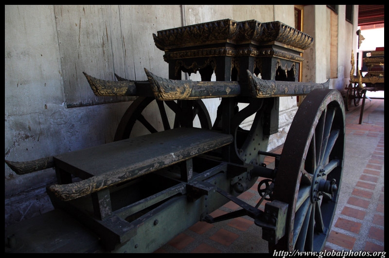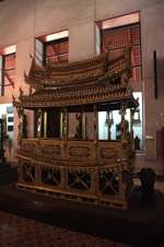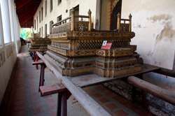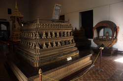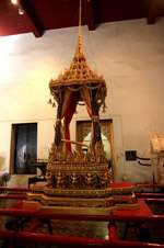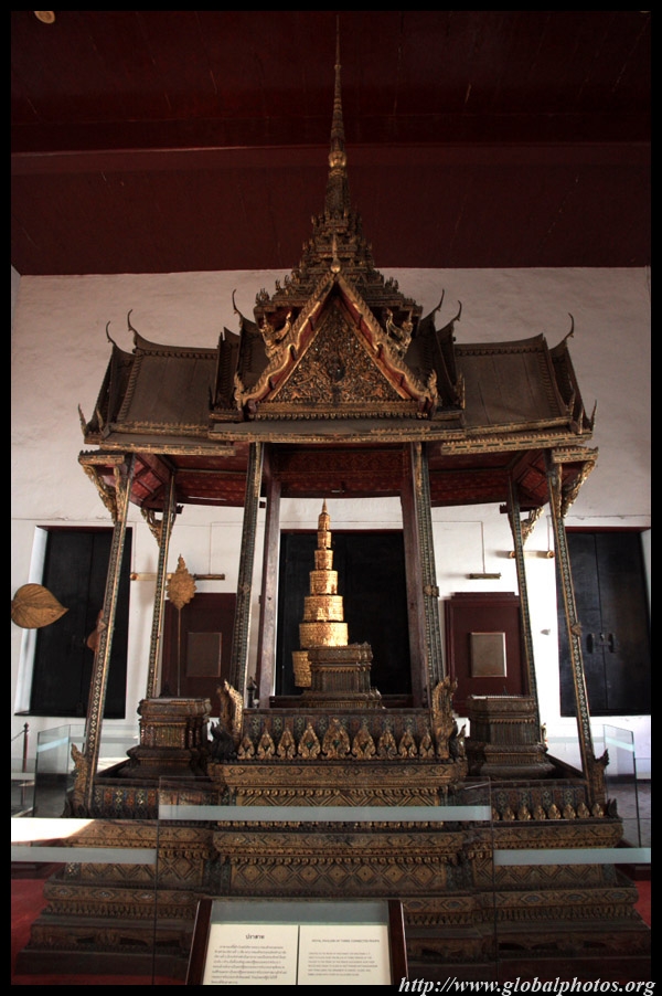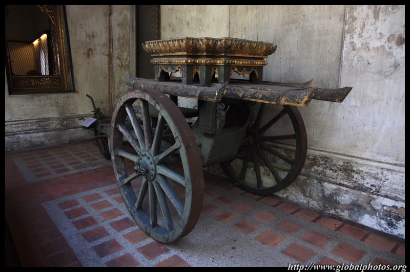 The royal funeral chariots are lined outside along one of the buildings, decorated in typical gold colours.