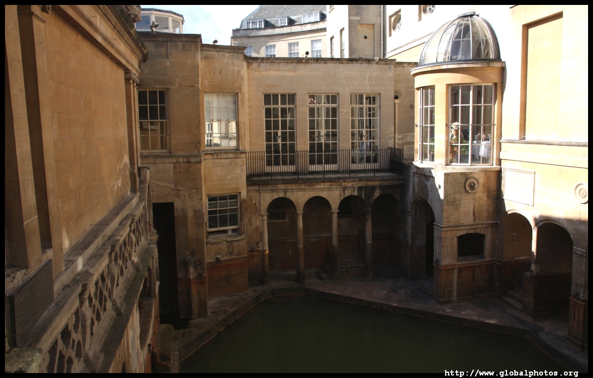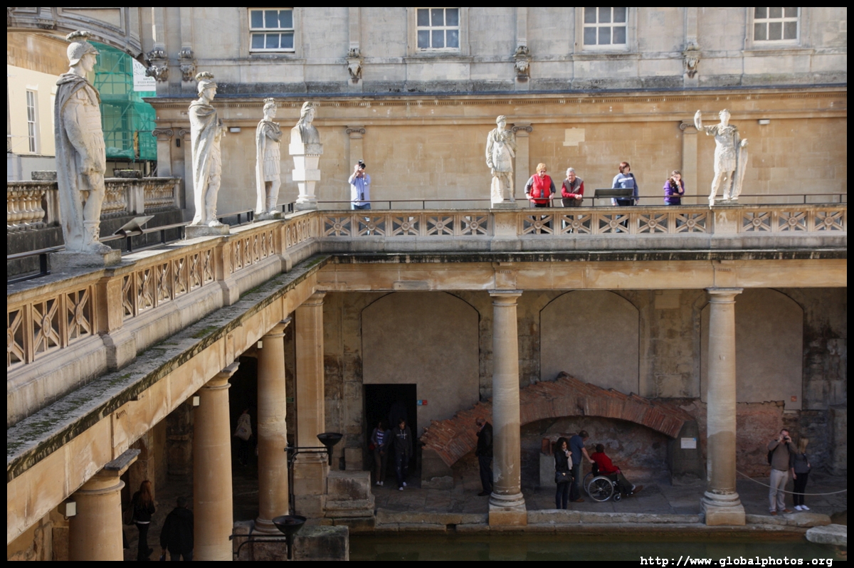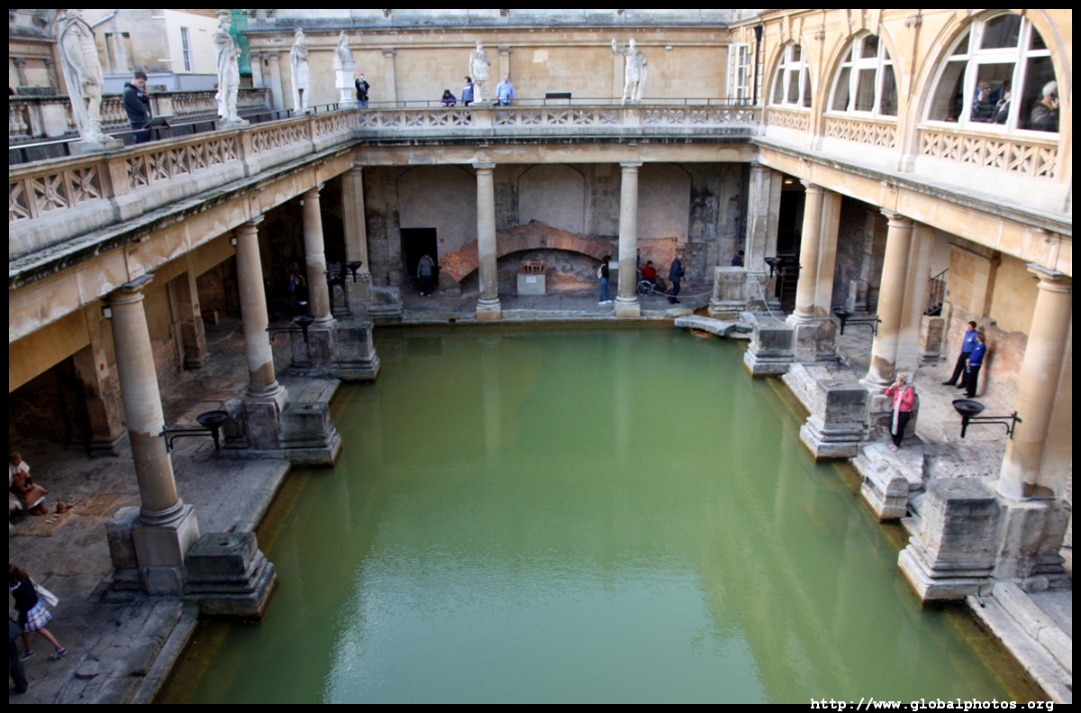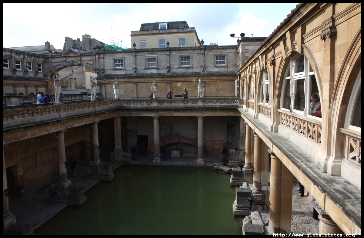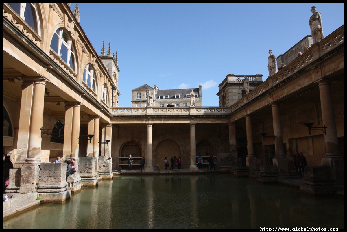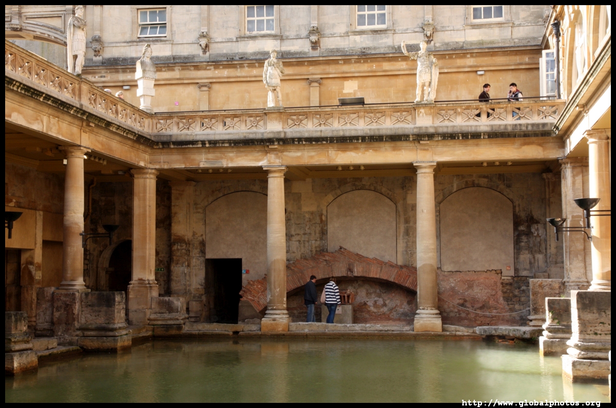 The Great Bath was originally covered but now is open to the elements with a good view of the Abbey. In the 19th century, pillars, terraces, and statues were added.