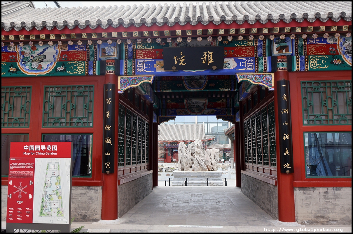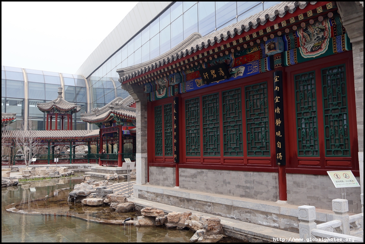 The China Garden at the end of the international pier features traditional architecture with water features to relax before boarding.