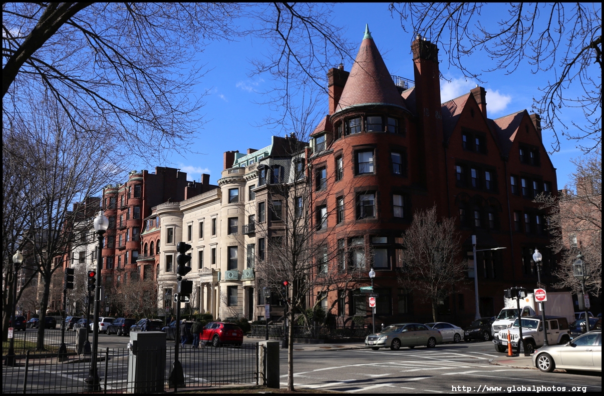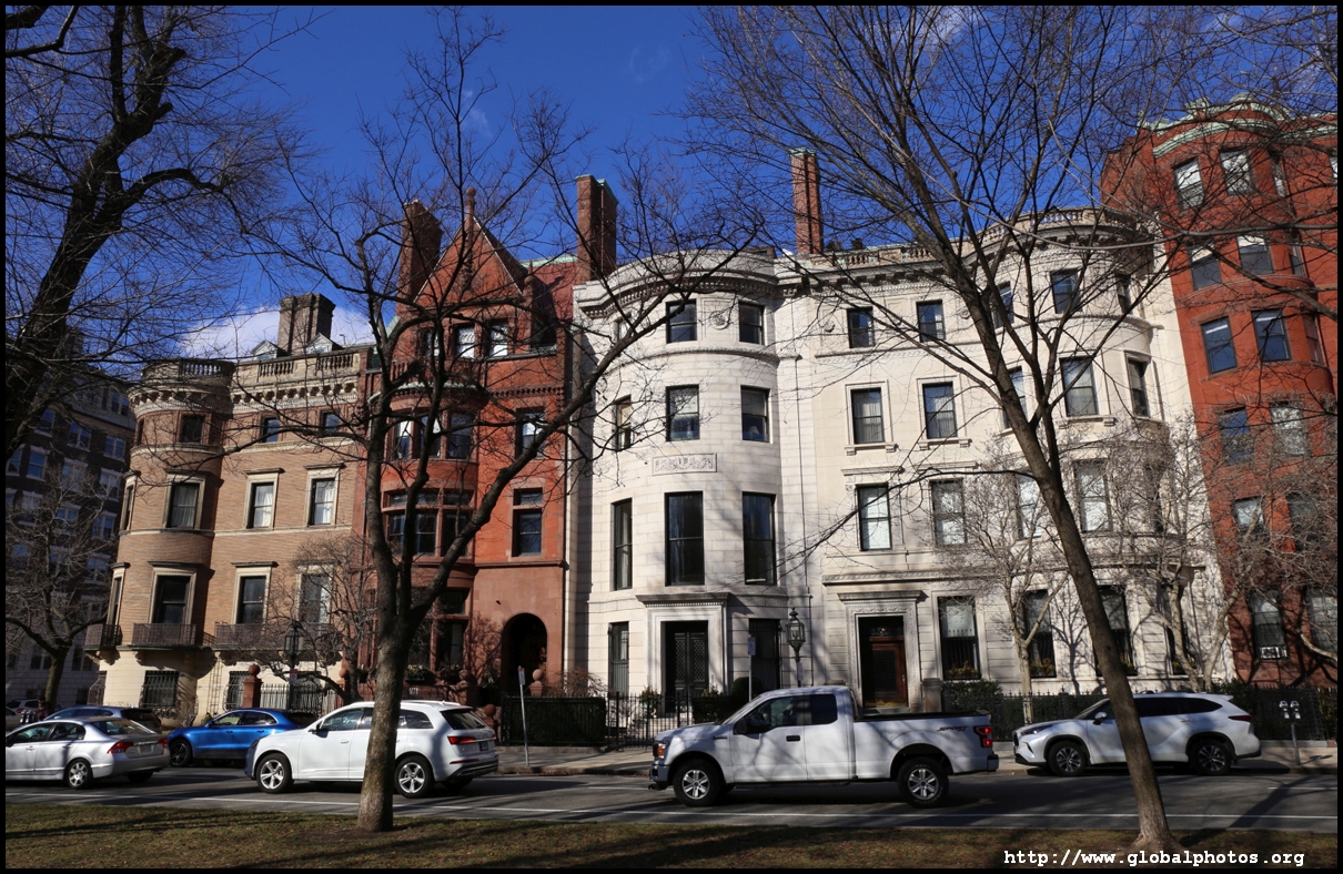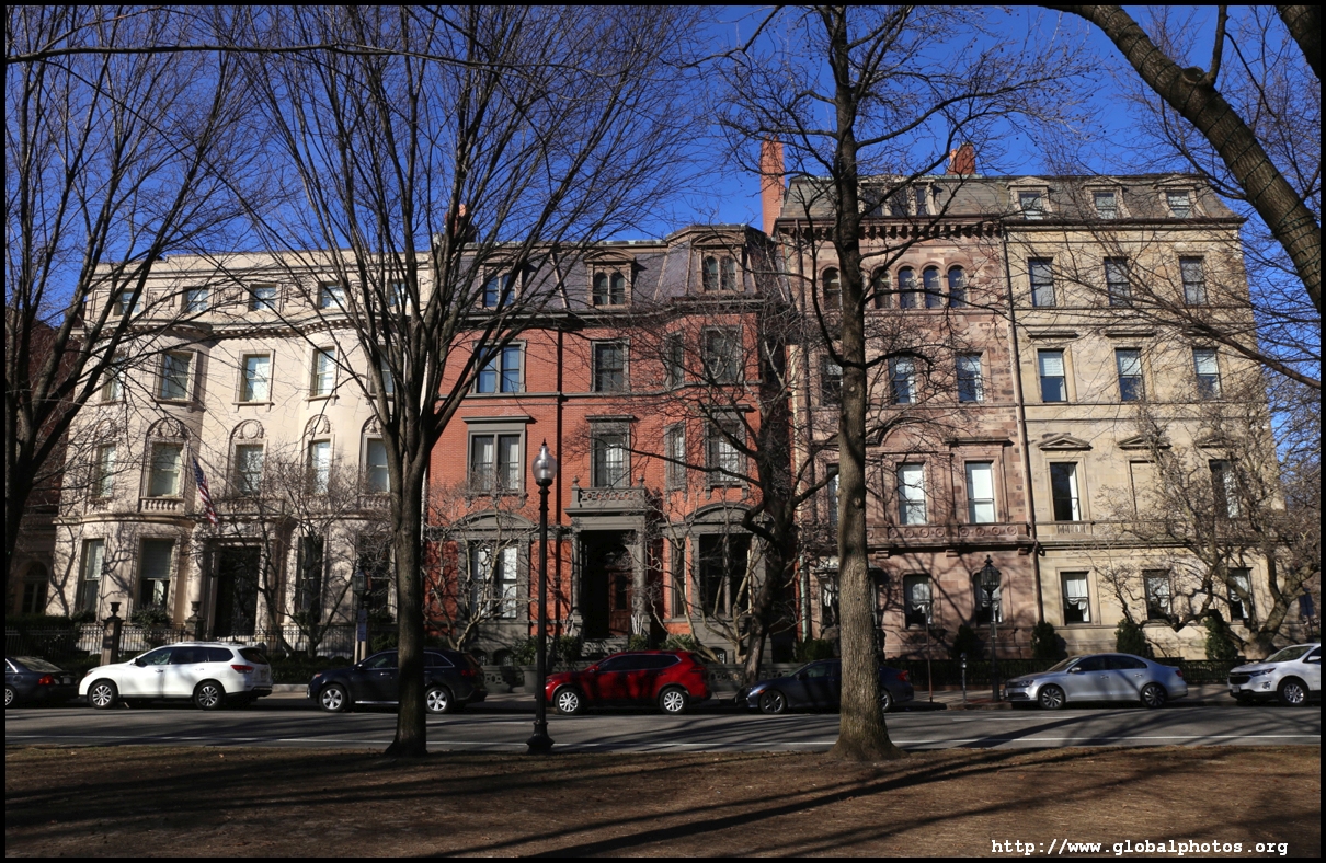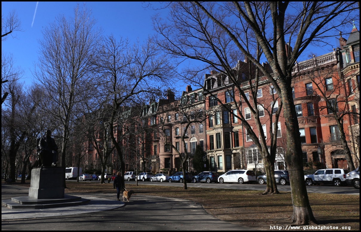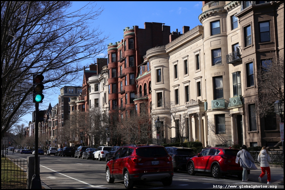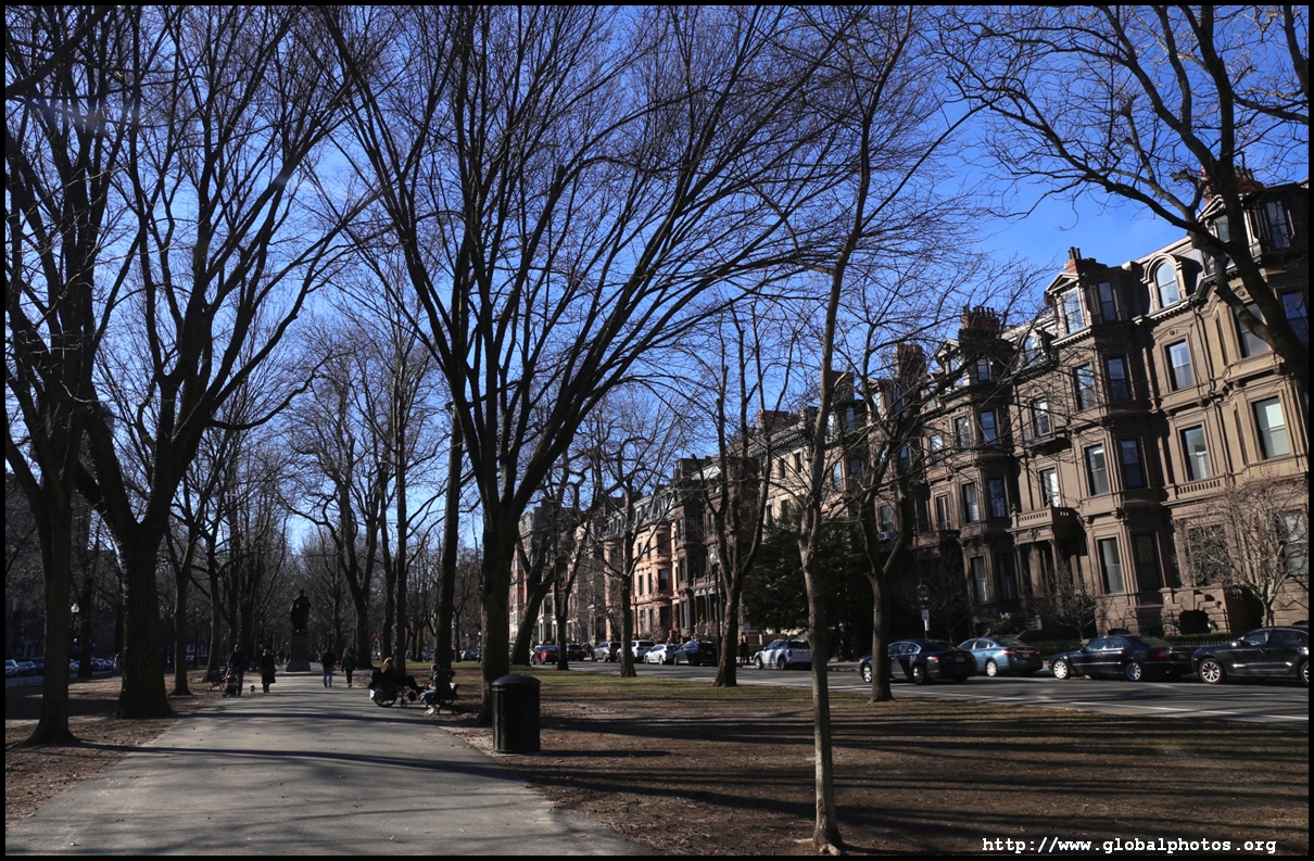 This section of Commonwealth Avenue has a wide park between its traffic lanes, offering a nice green space for residents to take a stroll. Modeled on the Parisian boulevard, it is 200 feet wide with many leading American architects showcasing their talents on both sides of the street.