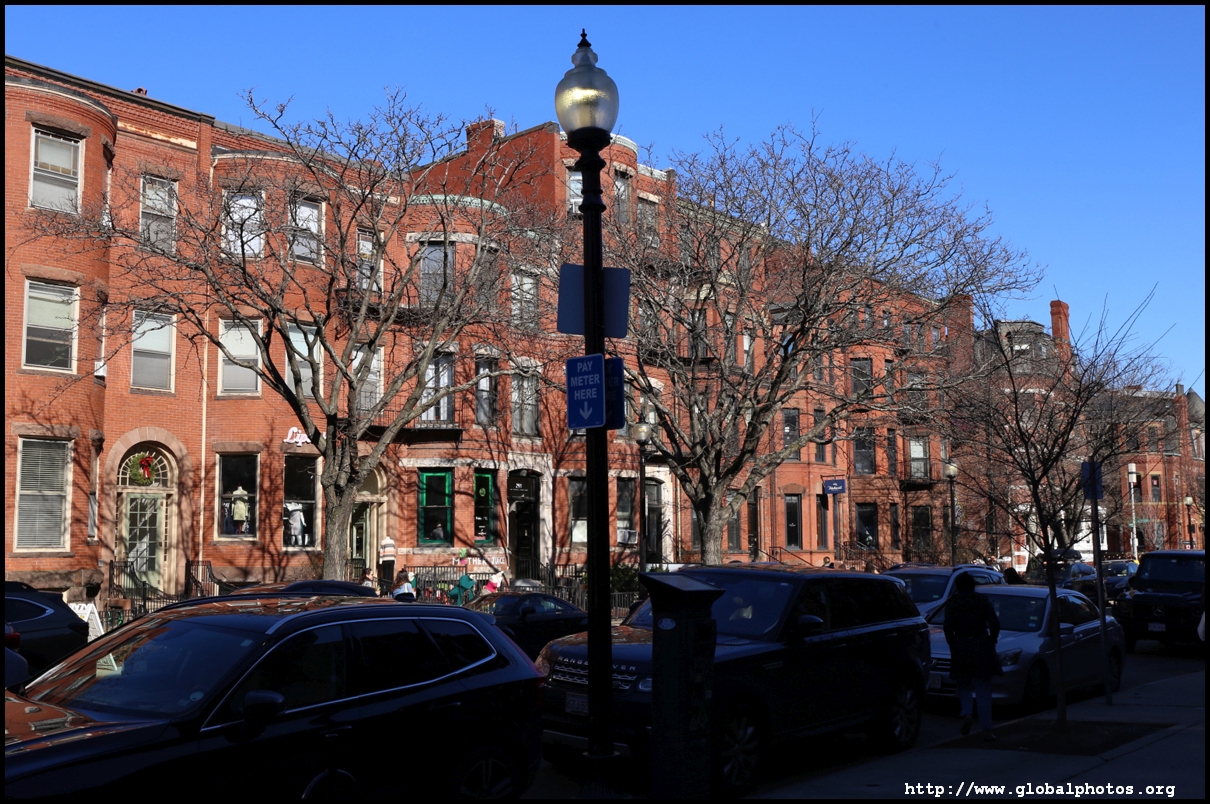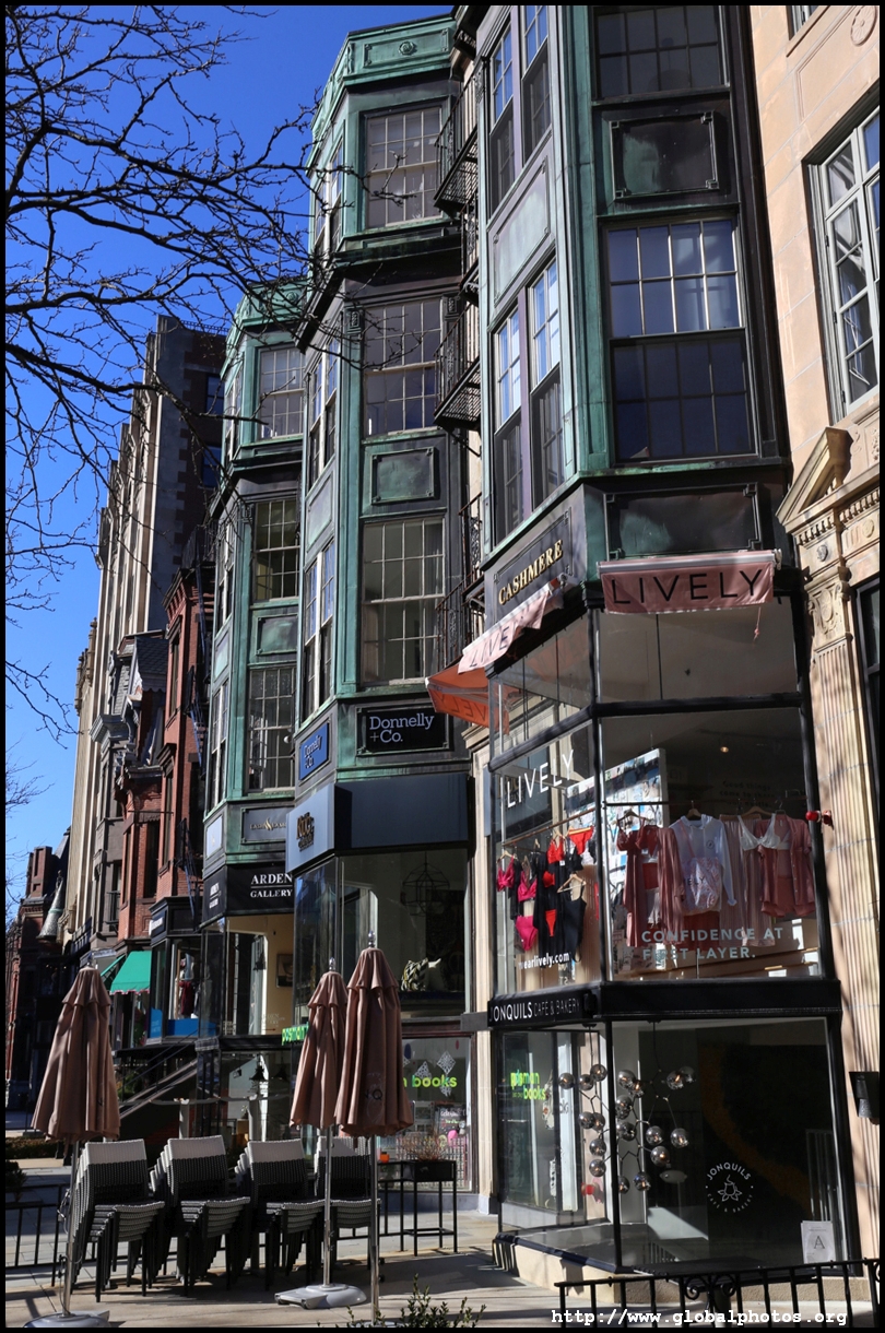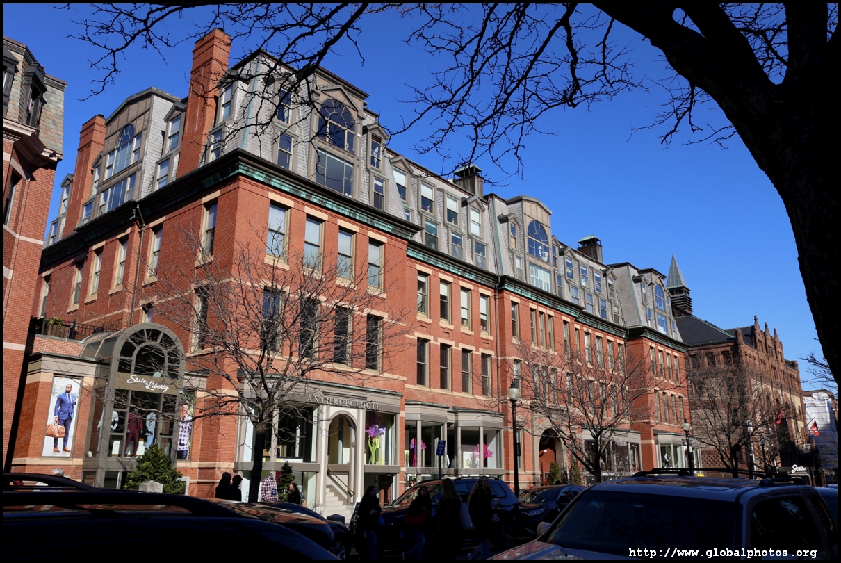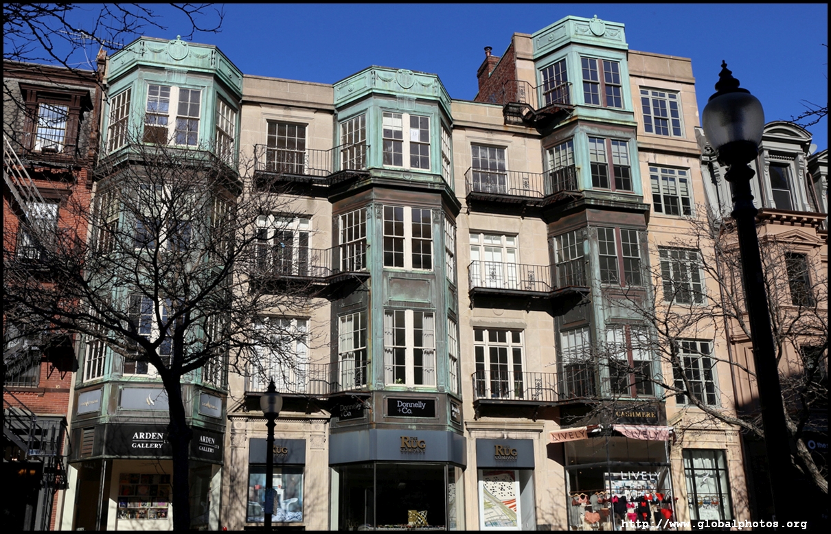 Newbury Street is Boston's equivalent of 5th Avenue, with upscale brands and other fancy stores where you can't afford to shop everyday. Most of the buildings were originally constructed as townhouses, and by the 1880s the area had eclipsed Beacon Hill as the best area to live in the city. However, the ground floors have changed purpose into commercial use today.As Back Bay was filled up block by block in the mid-19th century, the land was sold to different builders block by block, hence while we see some uniformity within each block, they differ on the next block. An old map showed horse and carriage rental services were offered on this street. The street's first building was Emmanuel Church at #15, which still stands today. MIT also was based here between 1865 and 1916.