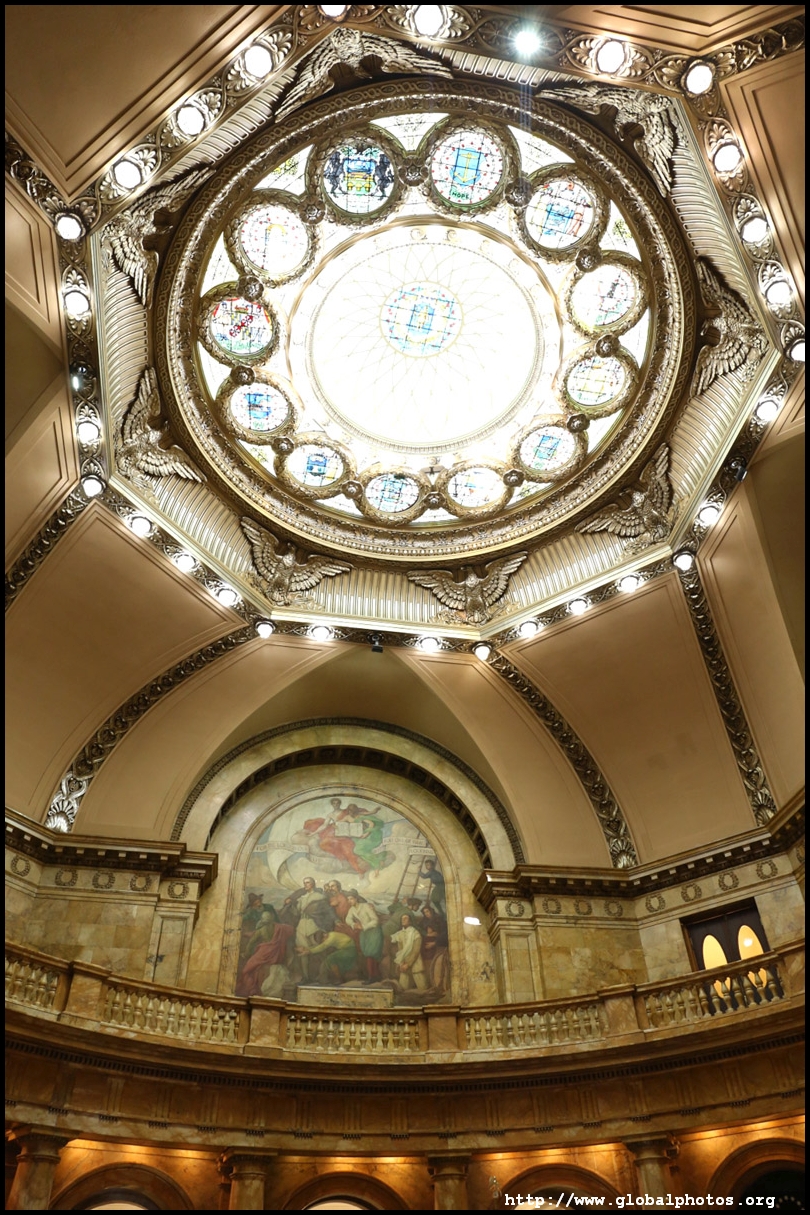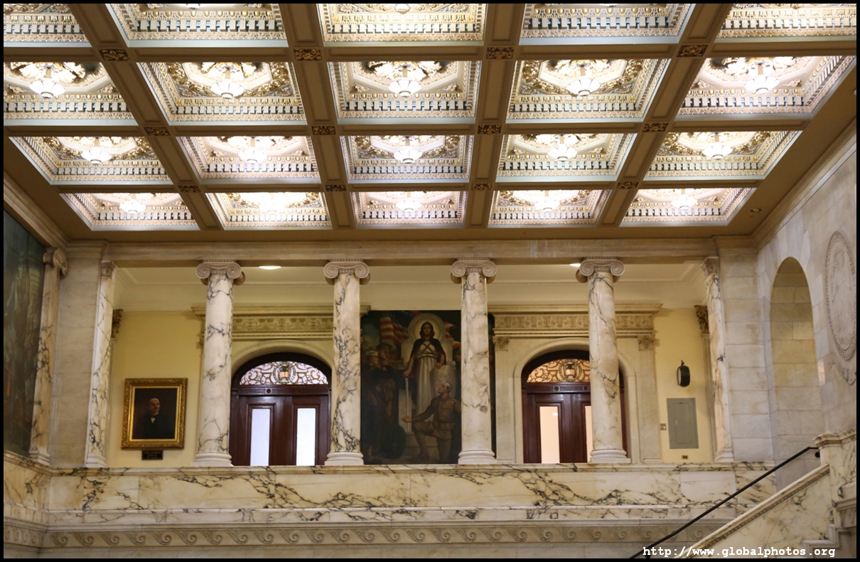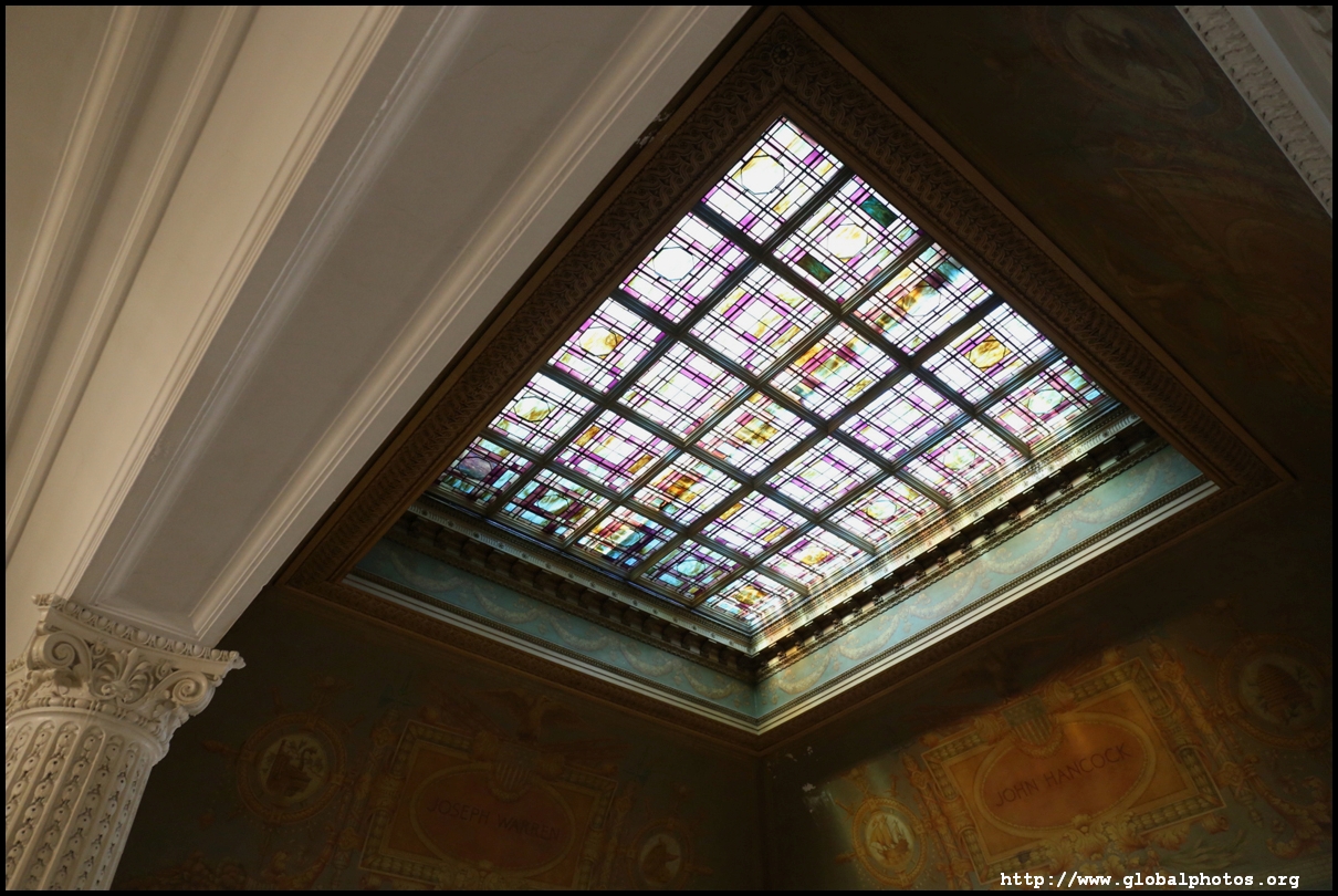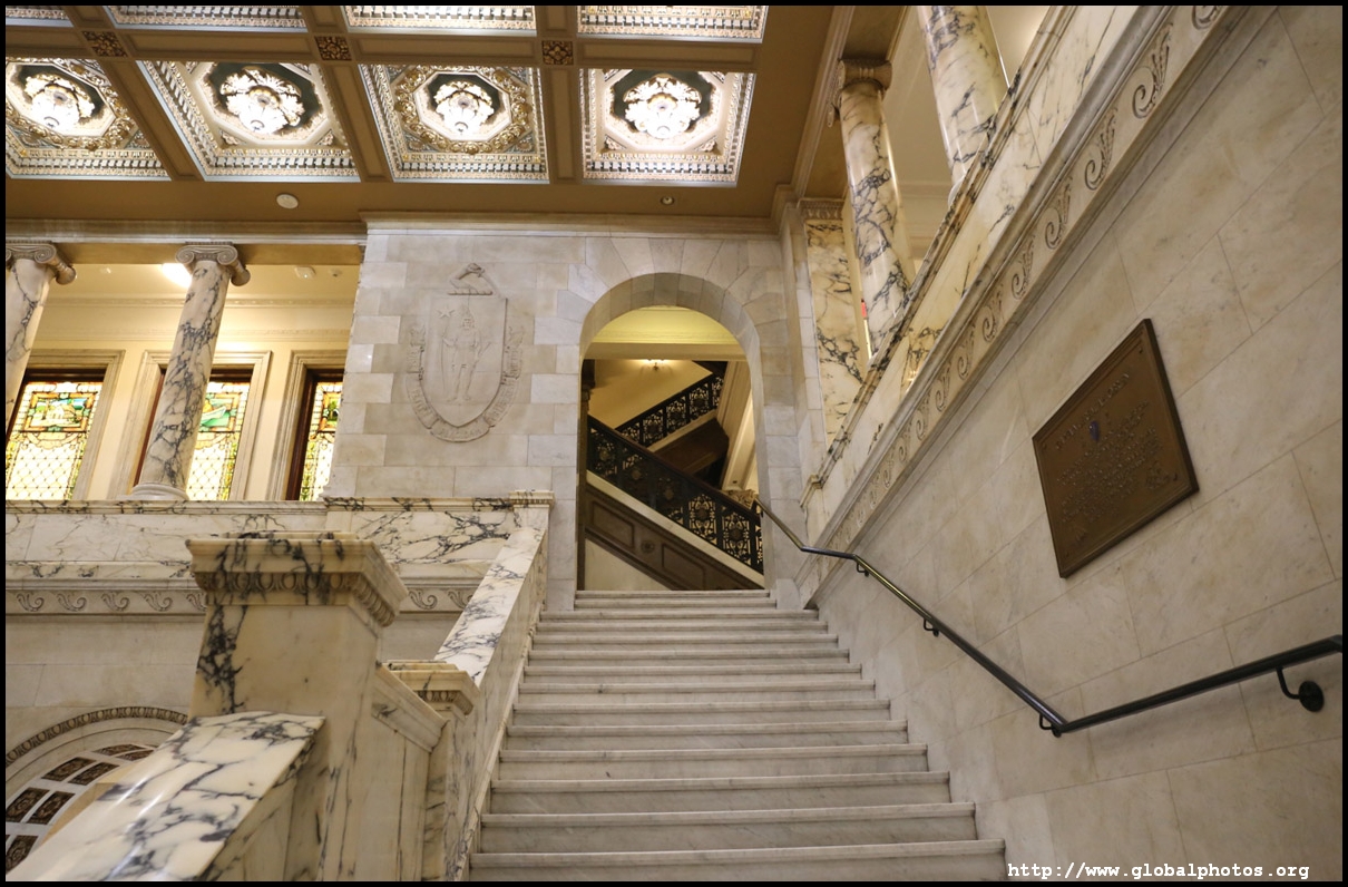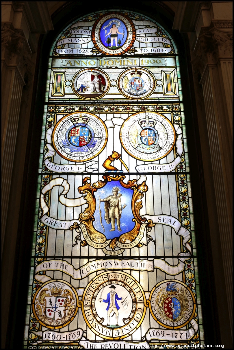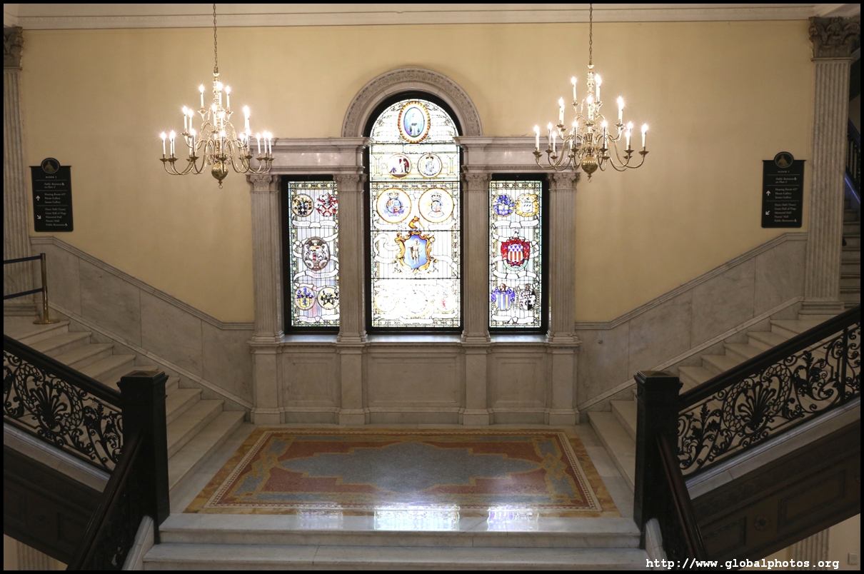 The stained glass window on the Grand Staircase depicts the state's early seals, with the oldest being a 1629 design. The window panels showcase the personal coats of arms of the provincial governors.