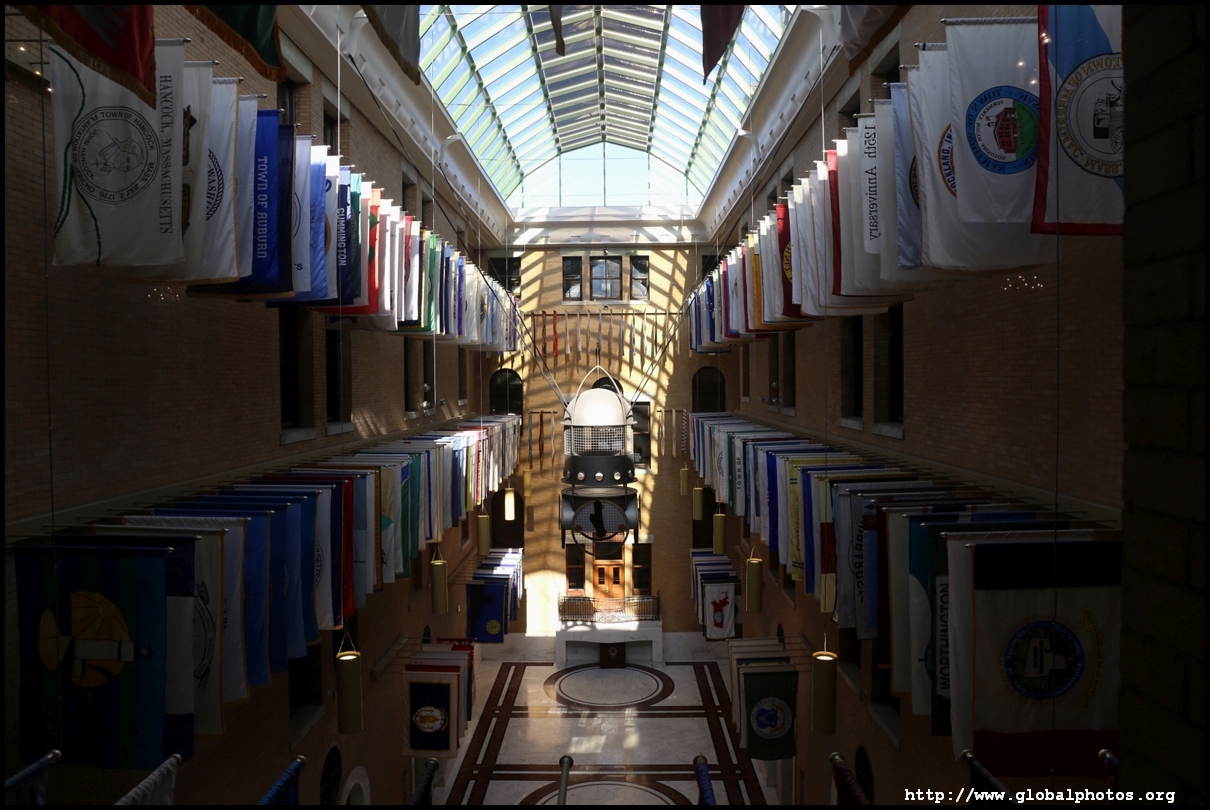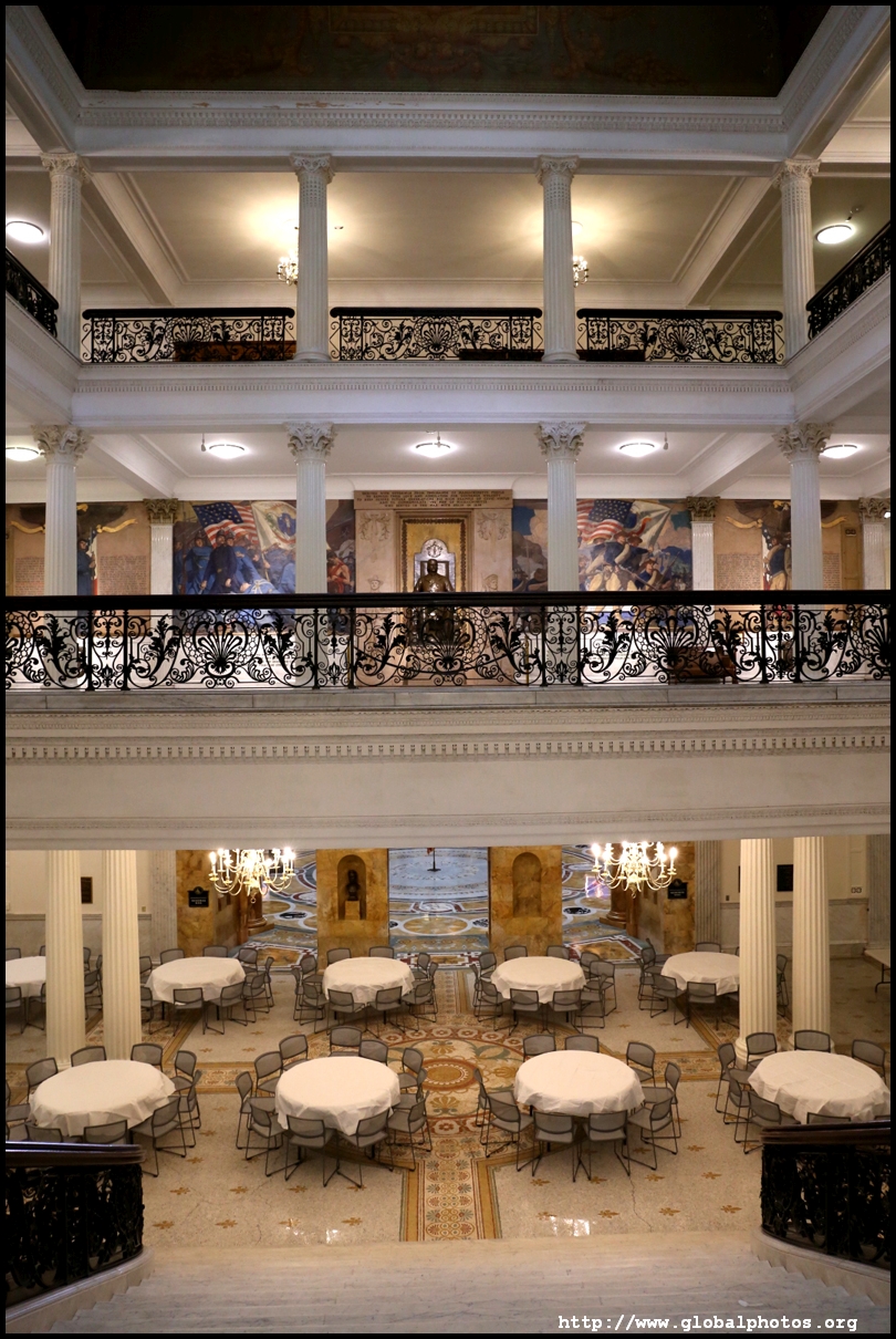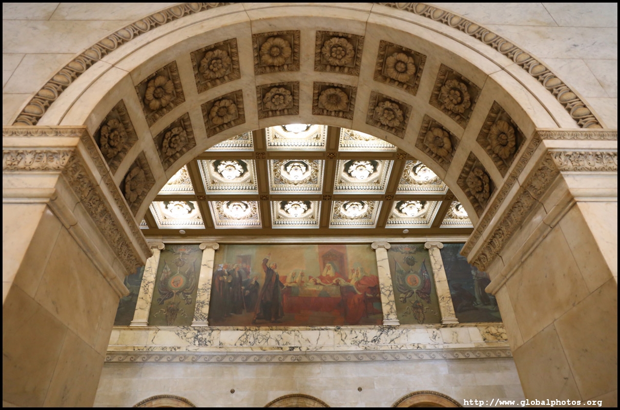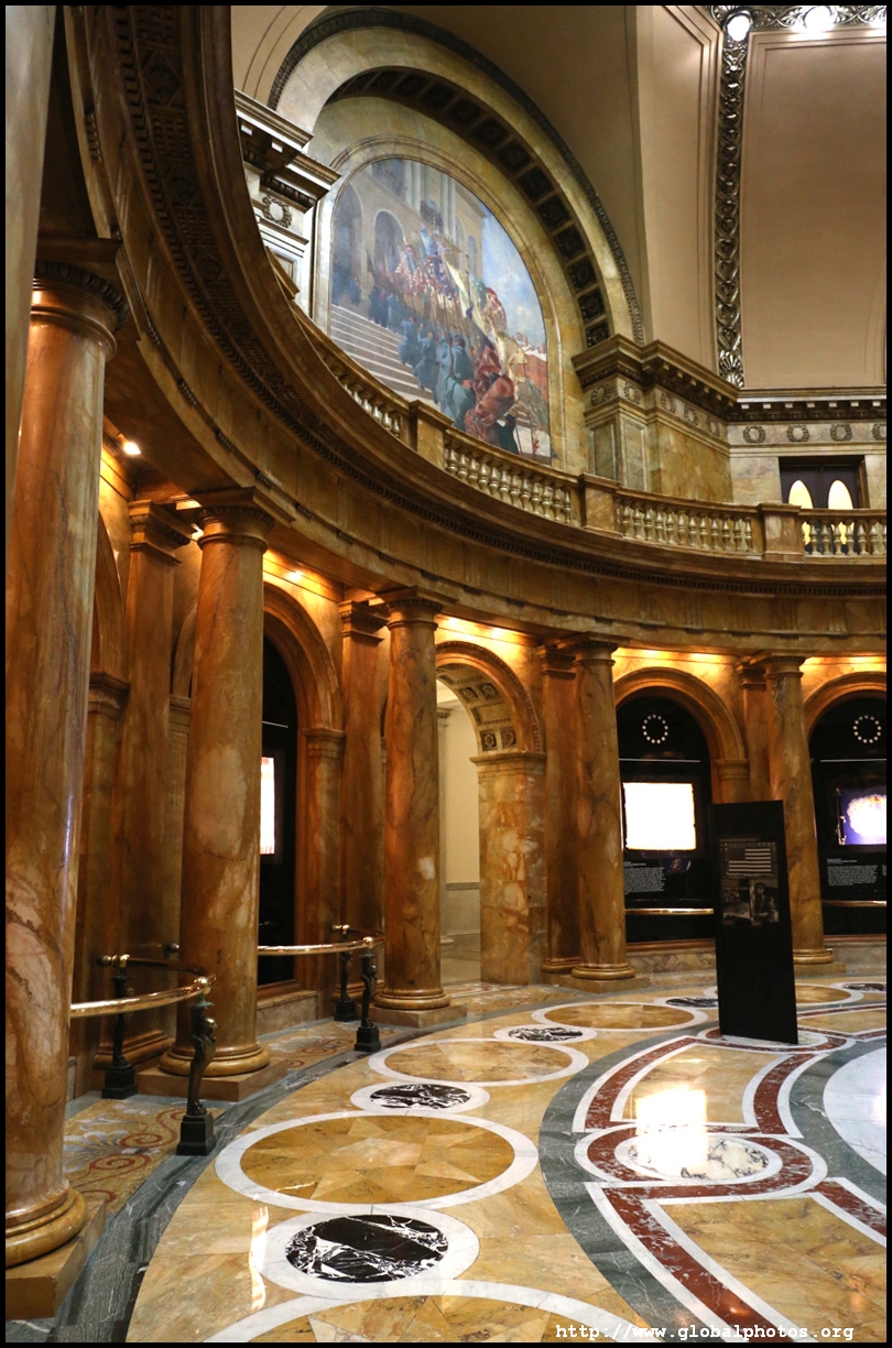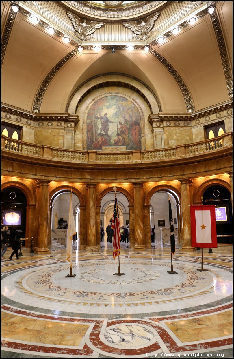 The stained glass window on the Grand Staircase depicts the state's early seals, with the oldest being a 1629 design. The window panels showcase the personal coats of arms of the provincial governors.