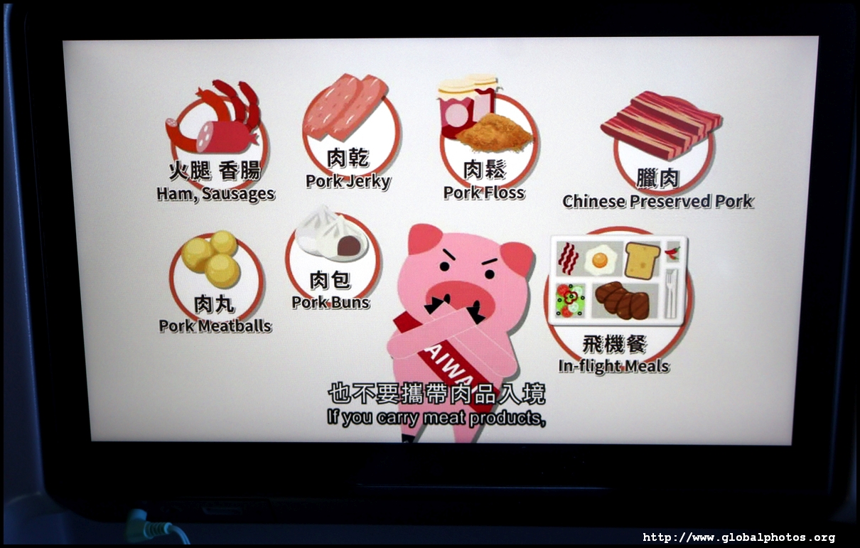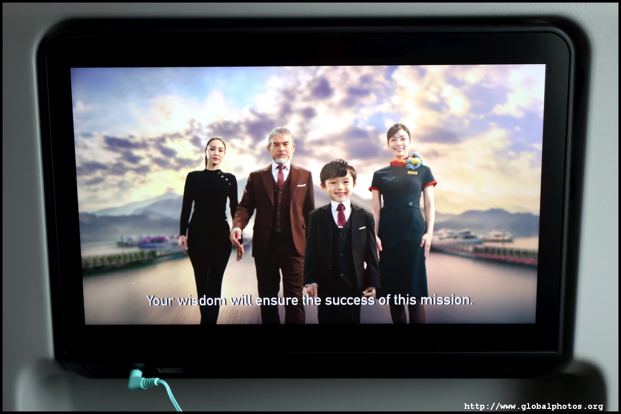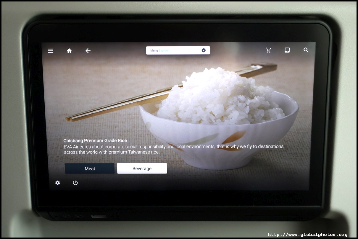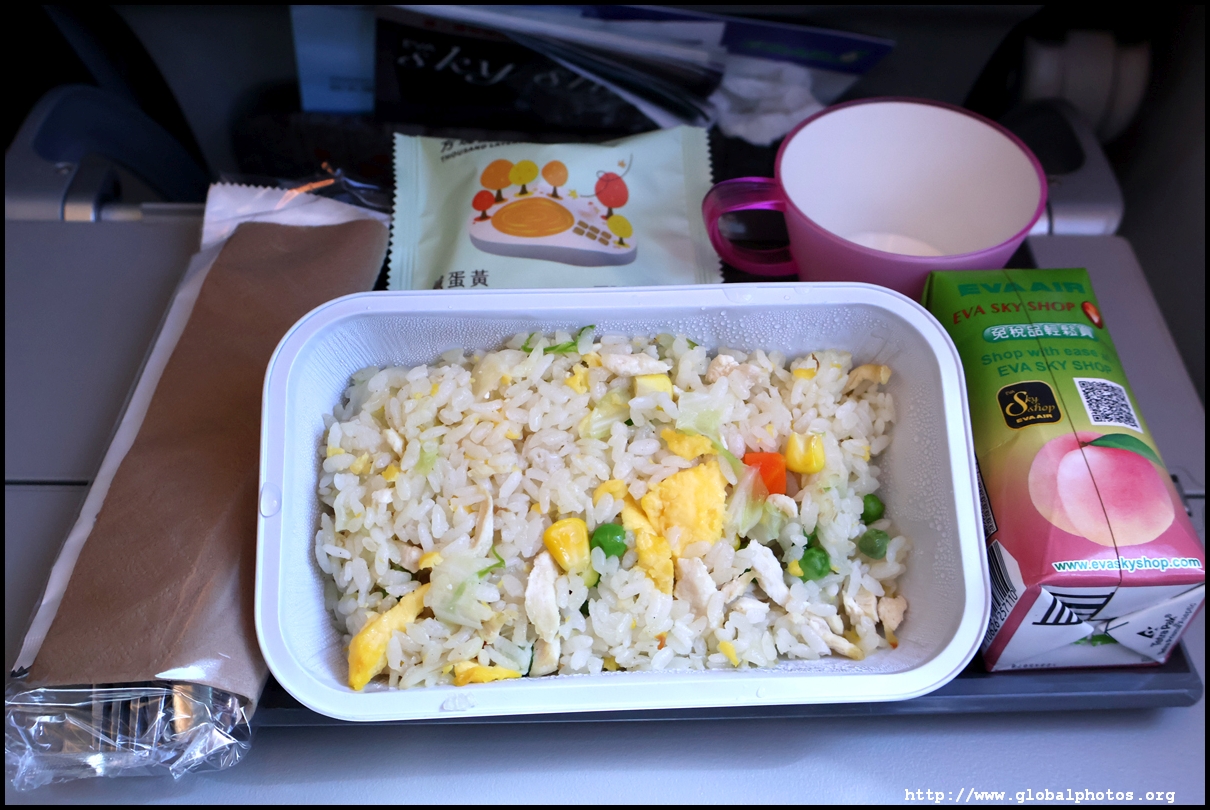 An enthusiastic set of crew welcomed us on board and I soon settled into my window seat in Economy just behind the wing. It had surprisingly good legroom and I feel it would be very comfortable for long-haul. Unfortunately, even though we all settled quickly, we sat on the ground for a bit and the cockpit updated us twice about the delay due to ground operations. I wasn't sure what that meant though - is there a repair being done, is the luggage still loading, or we're looking for a missing passenger? So during the wait, I fiddled with the IFE system to see what they've got. There is plenty to keep me entertained on this short flight. Over the years, I've heard good reviews about them especially on long-haul, and they've had a fairly clean safety record. I stumbled across the duty-free catalogue and looked for some unique airline merchandise. Airlines seem to be re-investing in their safety video nowadays and adding a lot of jazz and bling to it. EVA's had a Mission Impossible feel to it. We eventually pushed back late at 10:57am and took a long taxi to the other end of the airport to take-off 14 minutes later. It's a cloudy day today so there wasn't much to see as we entered the clouds soon after wheels up. I couldn't see the city today. With just a little over an hour flight time, the crew sprang into action. The seat belt sign never came off but they distributed a hot meal to everyone. There is no choice - just a chicken rice, and it came along with a pastry and a peach tea tetra pack. They also announced due to the short flight time, they will adjust the temperature of drinks. I found a few spots of chicken in the rice but it was nothing to boast about. Yes, we're spoiled in this part of the world with free lunch for an hour-long flight.