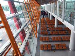 Passengers exited to the top level for the long walk to the immigration counters.