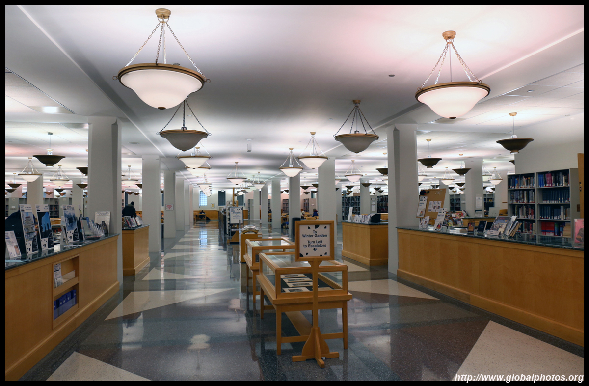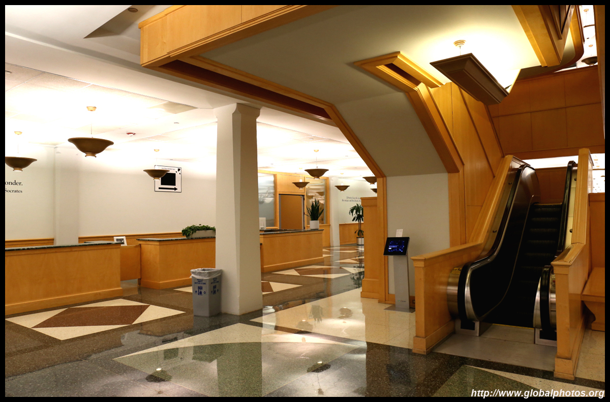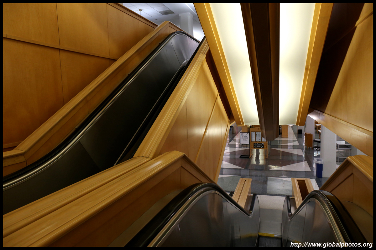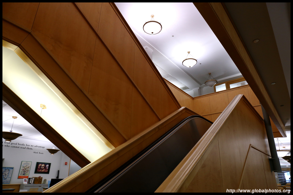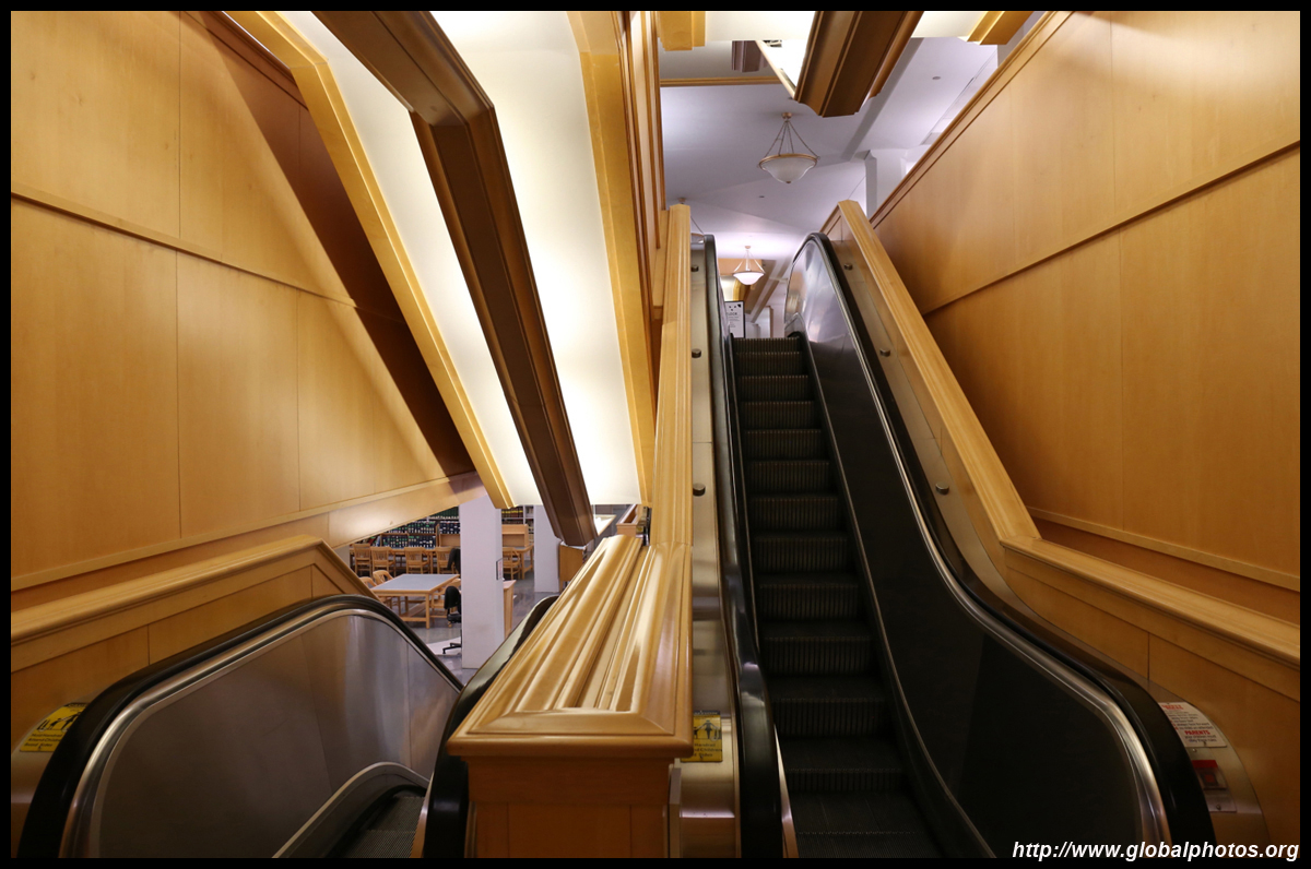 The Harold Washington Library Center is a huge new library with simple interiors, a nice escalator with wood finishing, and topped by a glass atrium at the top.