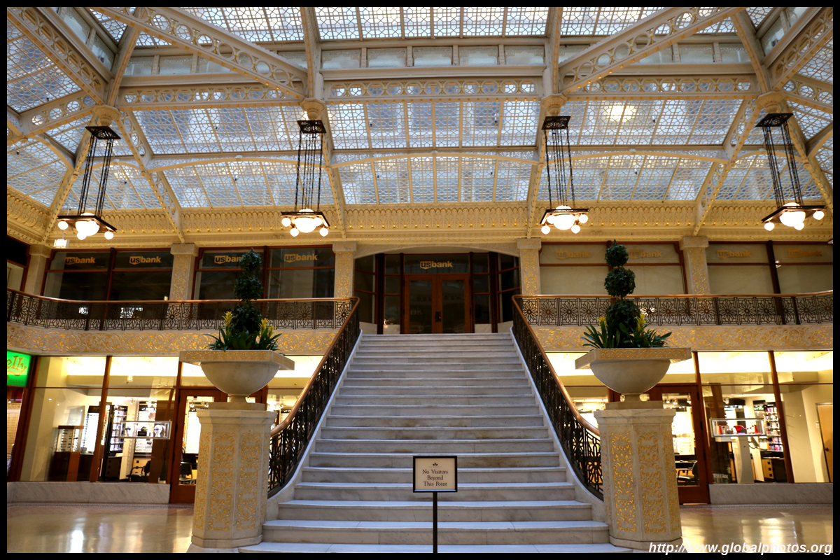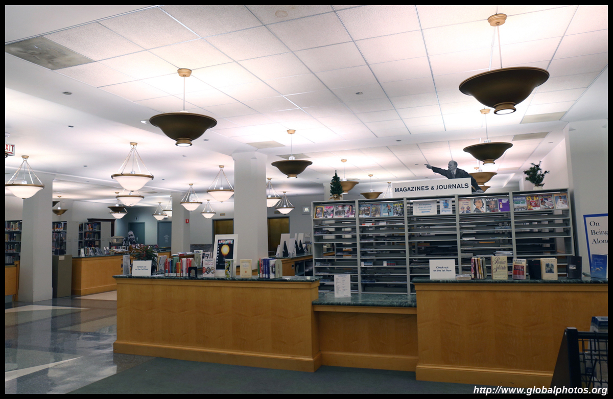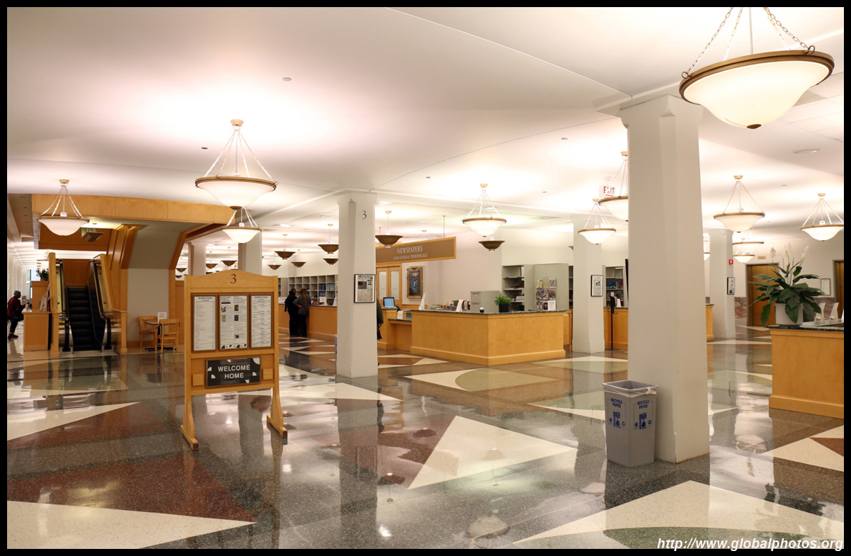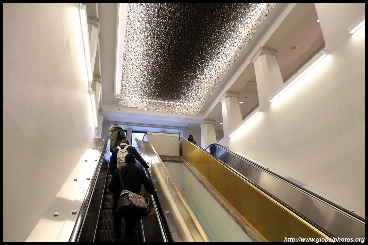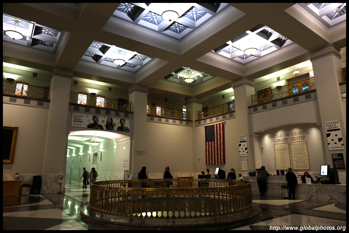 The Harold Washington Library Center is a huge new library with simple interiors, a nice escalator with wood finishing, and topped by a glass atrium at the top.