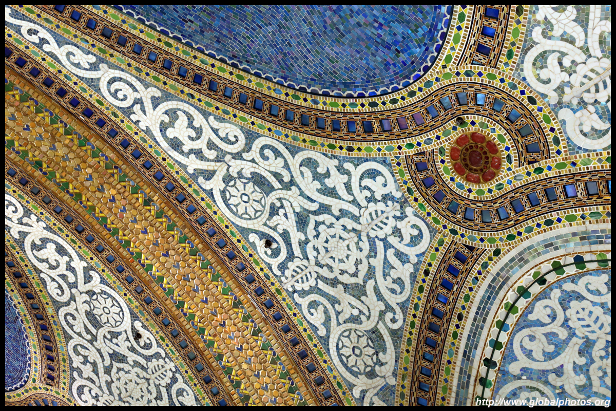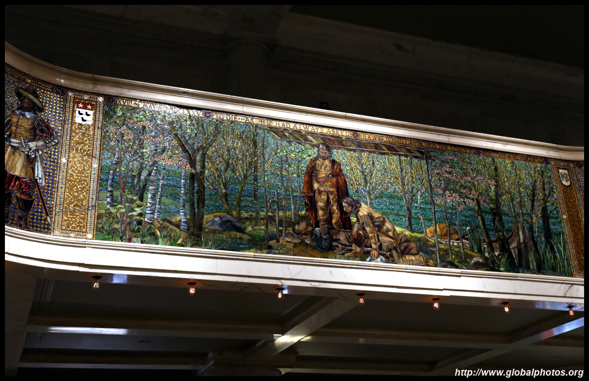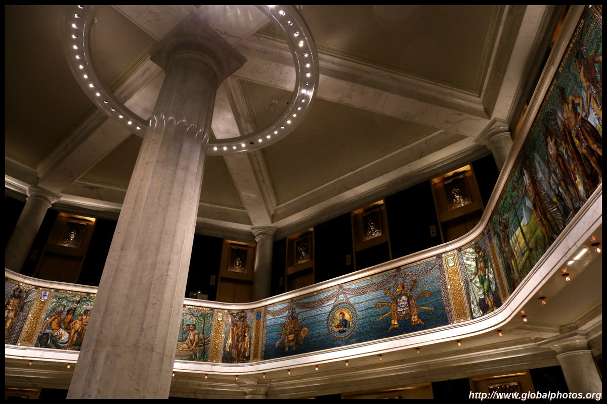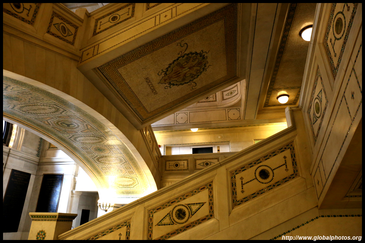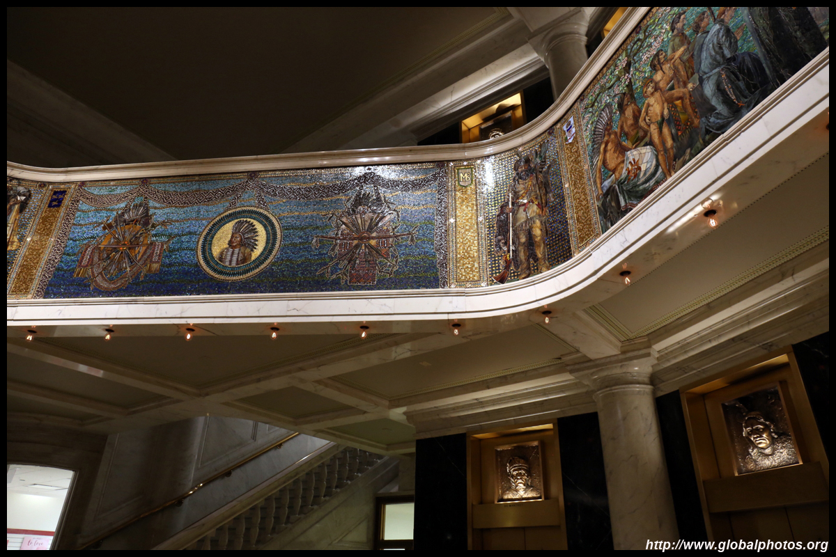 The Marquette Building's lobby has an abundance of sculpted mosaics depicting French explorer Jacques Marquette's journey.