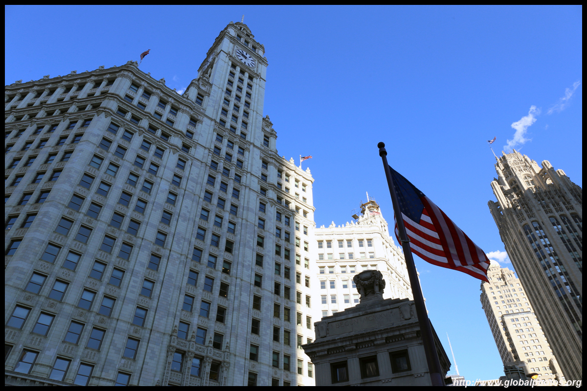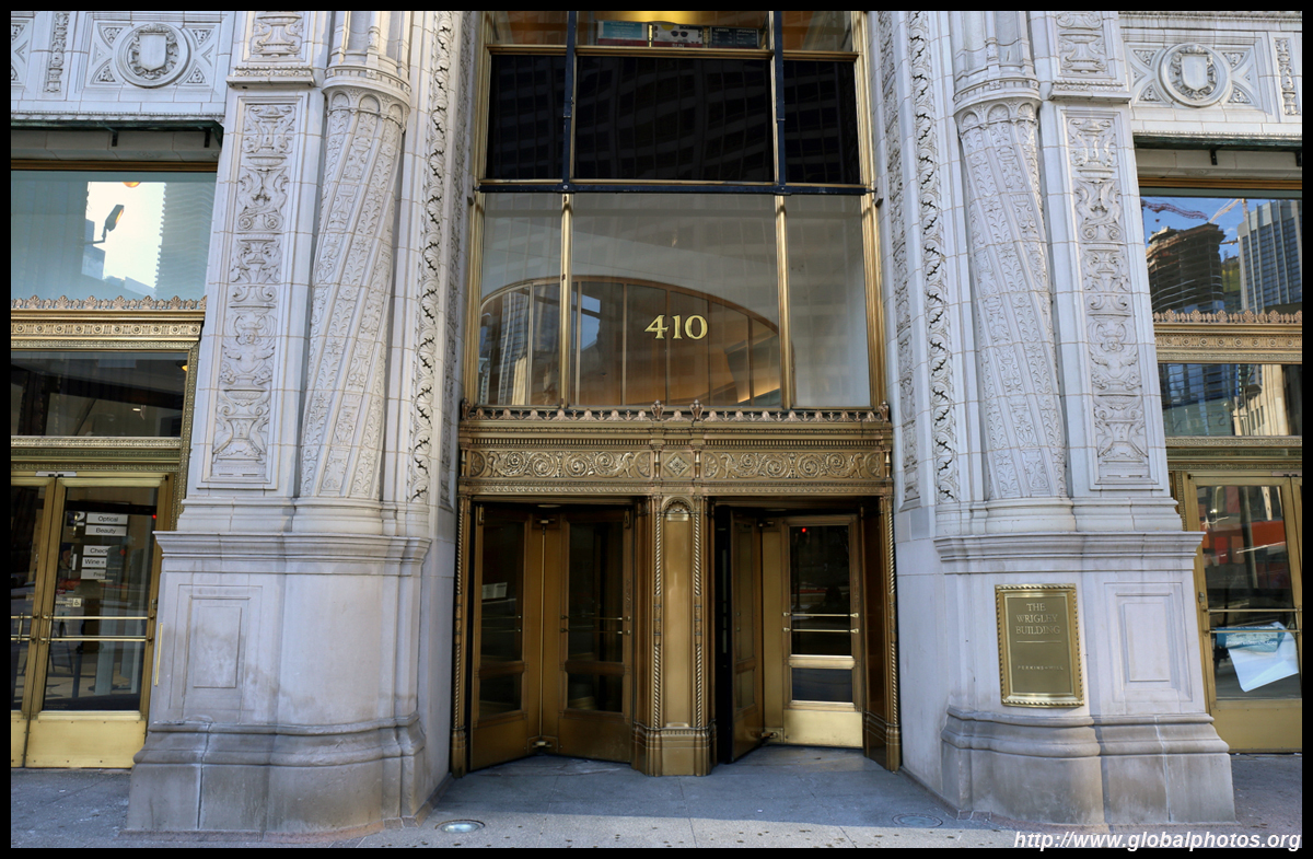 The Wrigley Building was constructed between 1921-24 and consists of 2 towers of 27 and 18 stories, with the clock tower inspired by Seville's cathedral.