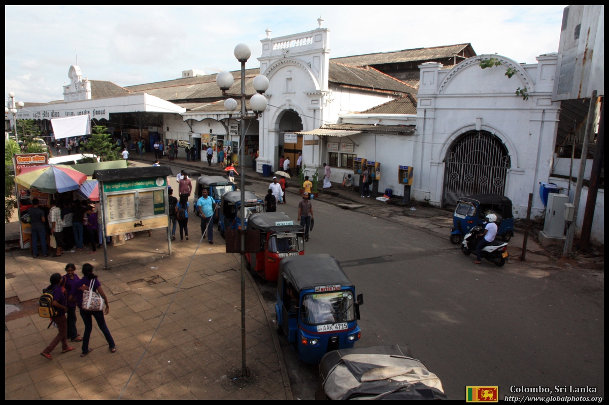 The Fort's railway station is busy with buses, tuk tuks, and people.
