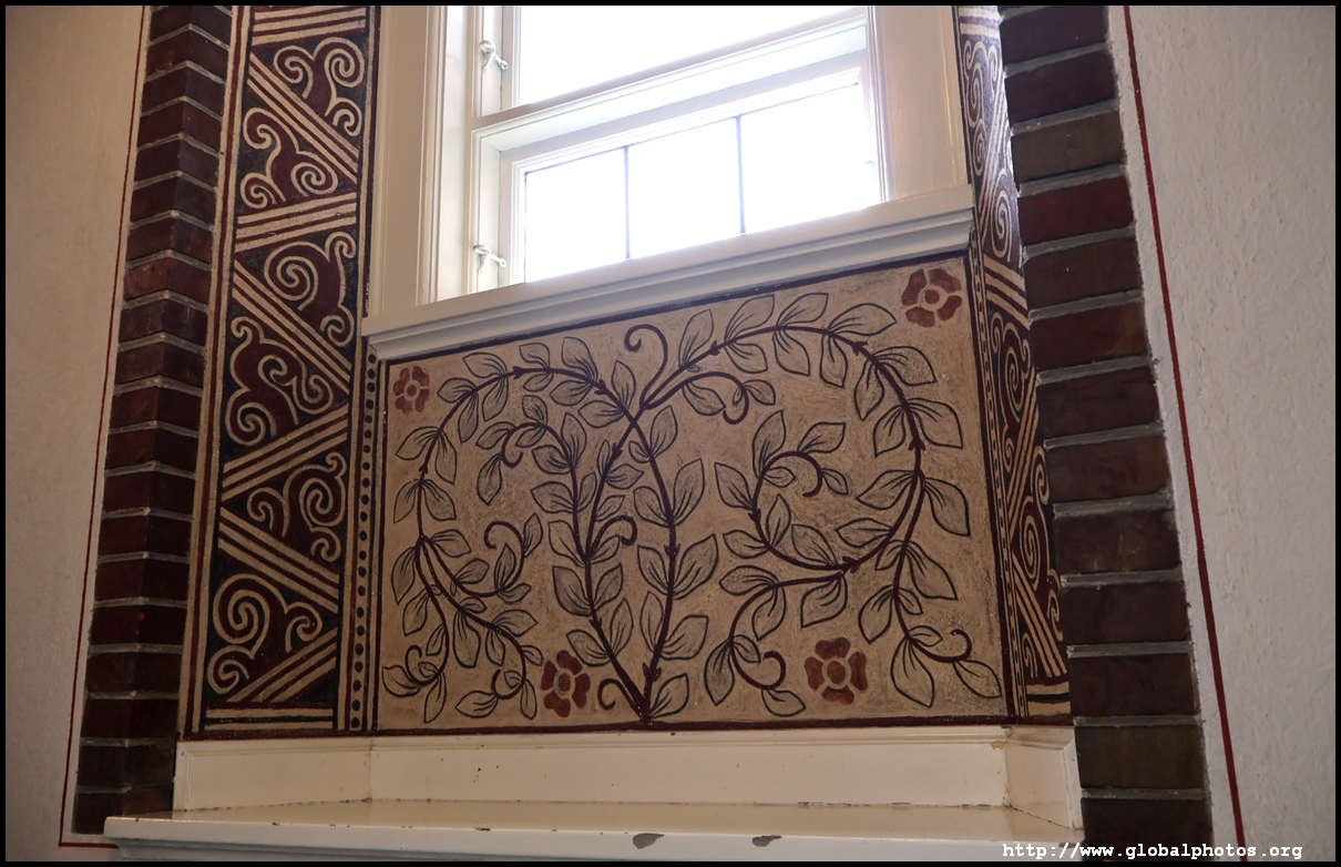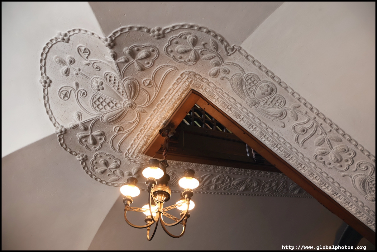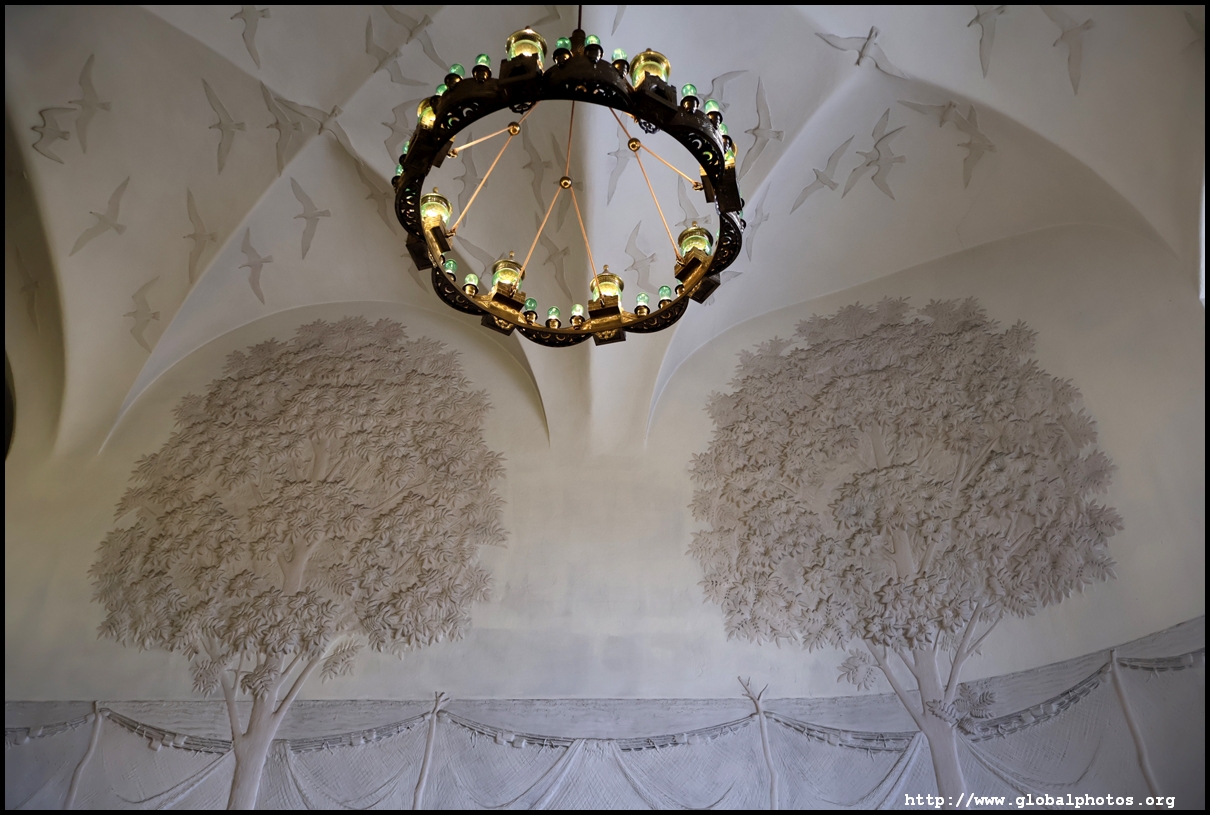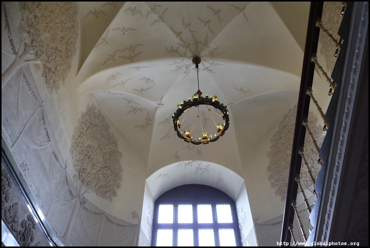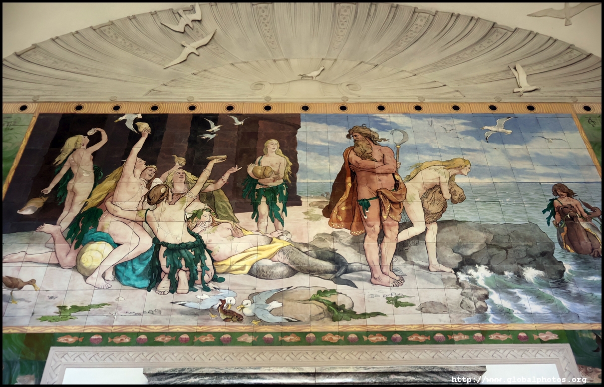 The ceiling's ceramic frieze features seagulls flying out the window.