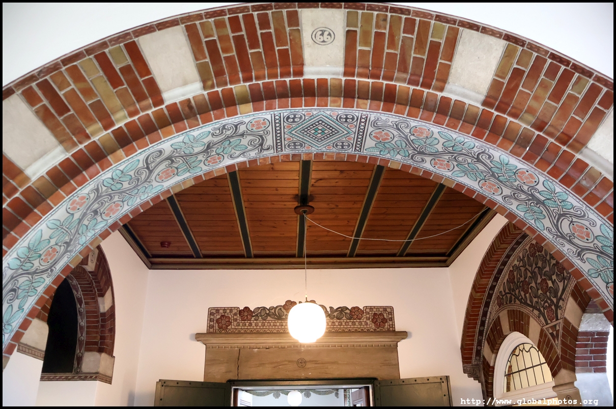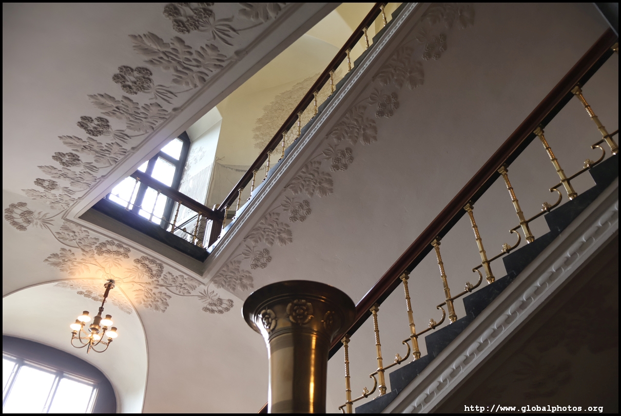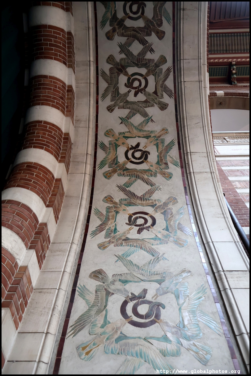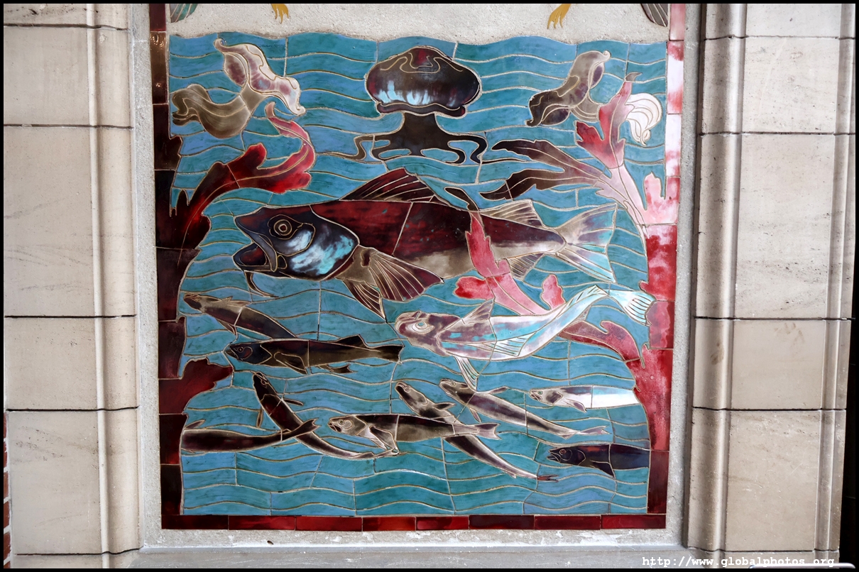The ceiling's ceramic frieze features seagulls flying out the window.