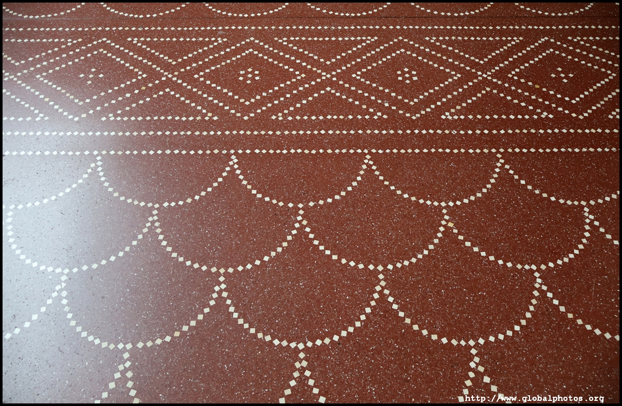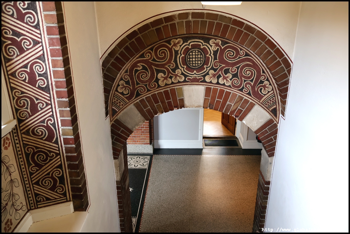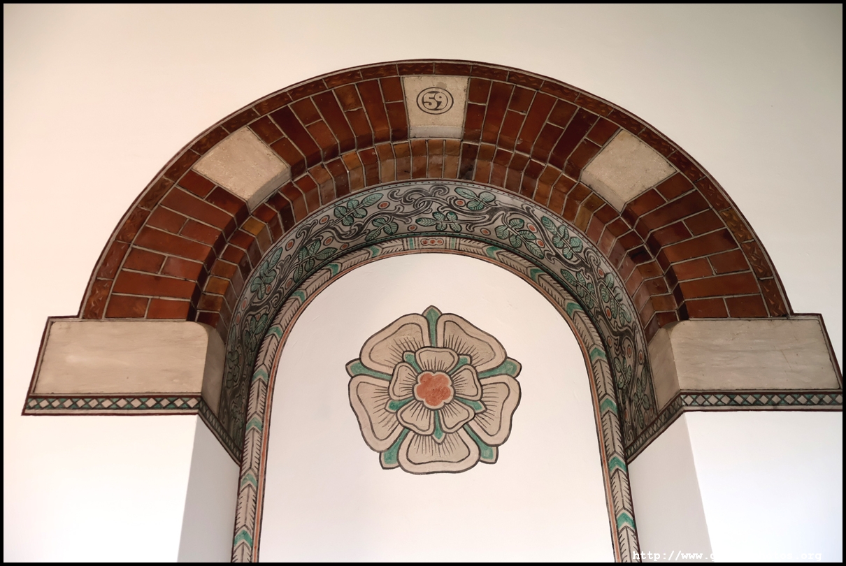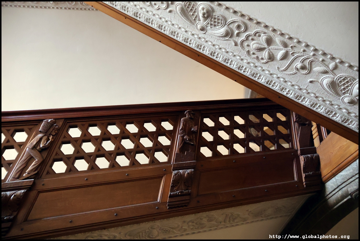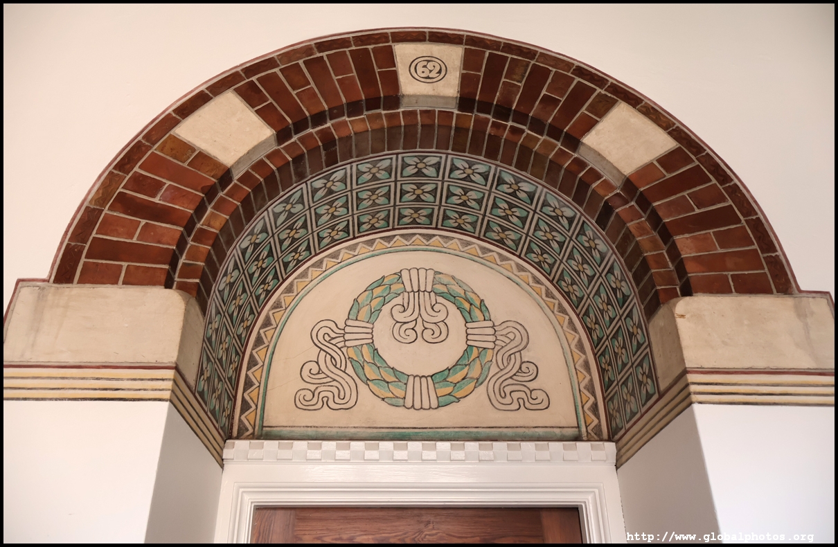 The ceiling's ceramic frieze features seagulls flying out the window.