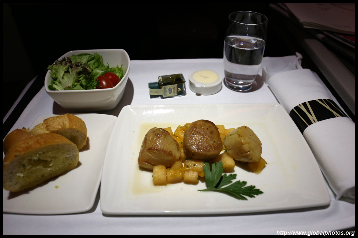 I wasn't full from lounge food but I don't like to stuff myself excessively in the air. The seared scallop and seasonal salad starters were quite good. I ended up getting scallops and prawns for the main as well.