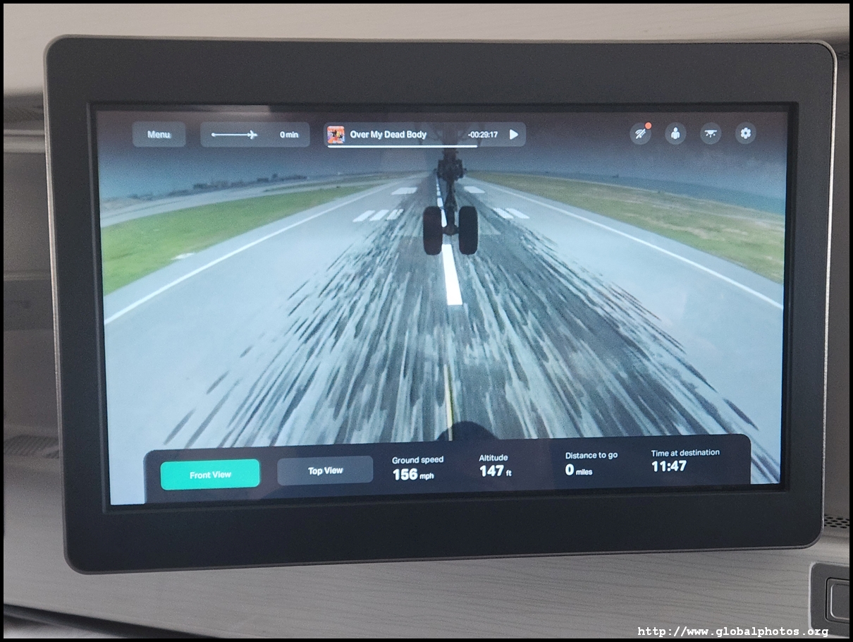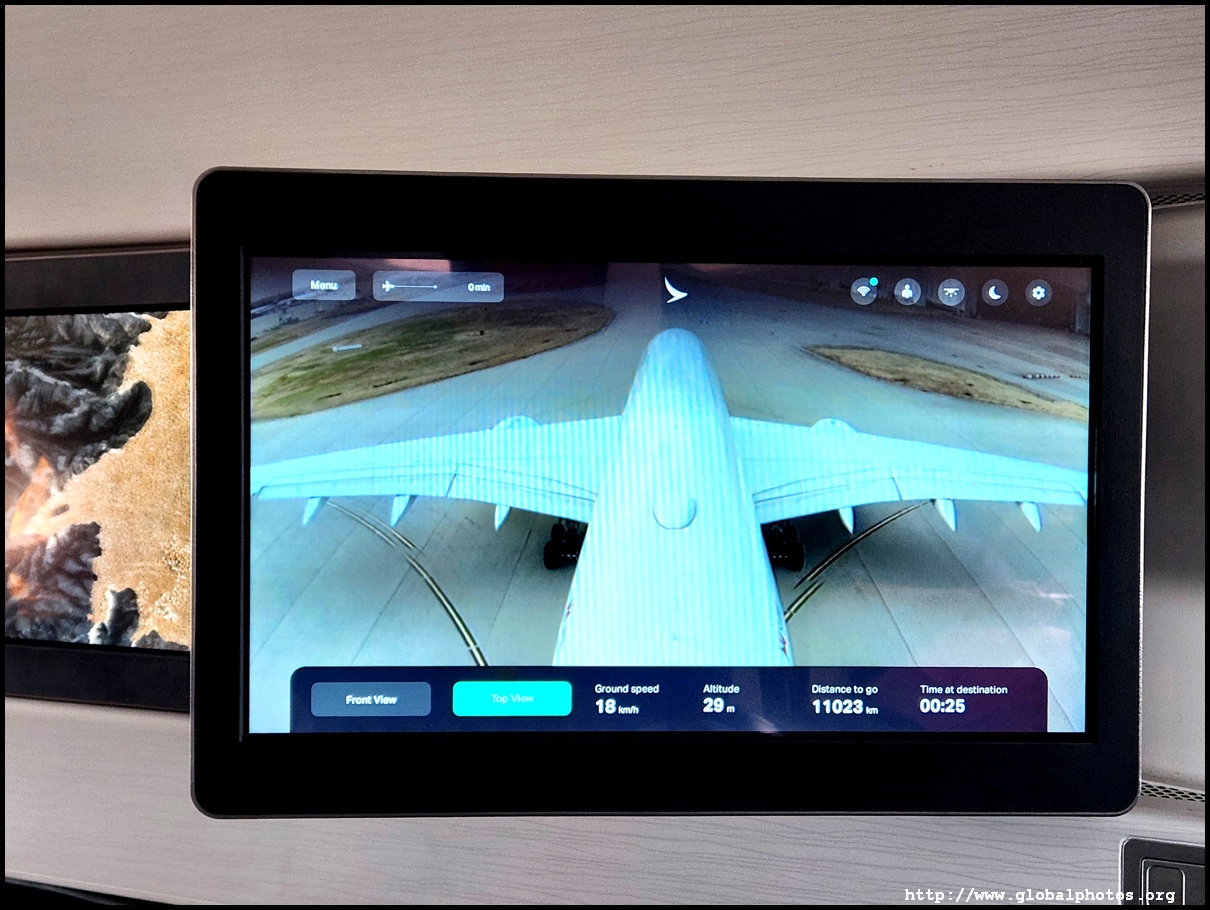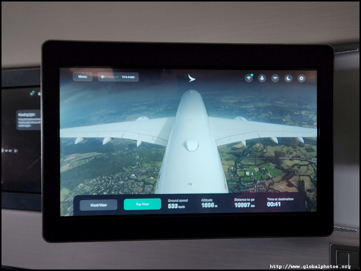We pushed back just 14 minutes late, which is quite remarkable given how late boarding started. We taxied for a while and took off just after 5:30pm. Without a window, I turned on the plane's camera for a bird's eye view of the scenery as we bid farewell to London, taking off towards the west then looping around southeast to cross the English Channel. There are 2 cameras available - one beneath the belly and the other on the tail.