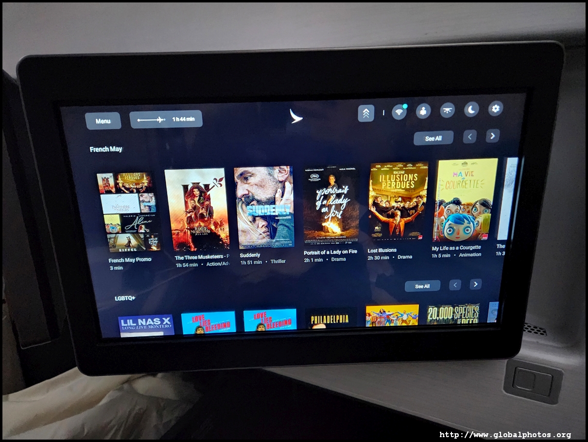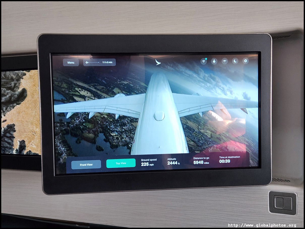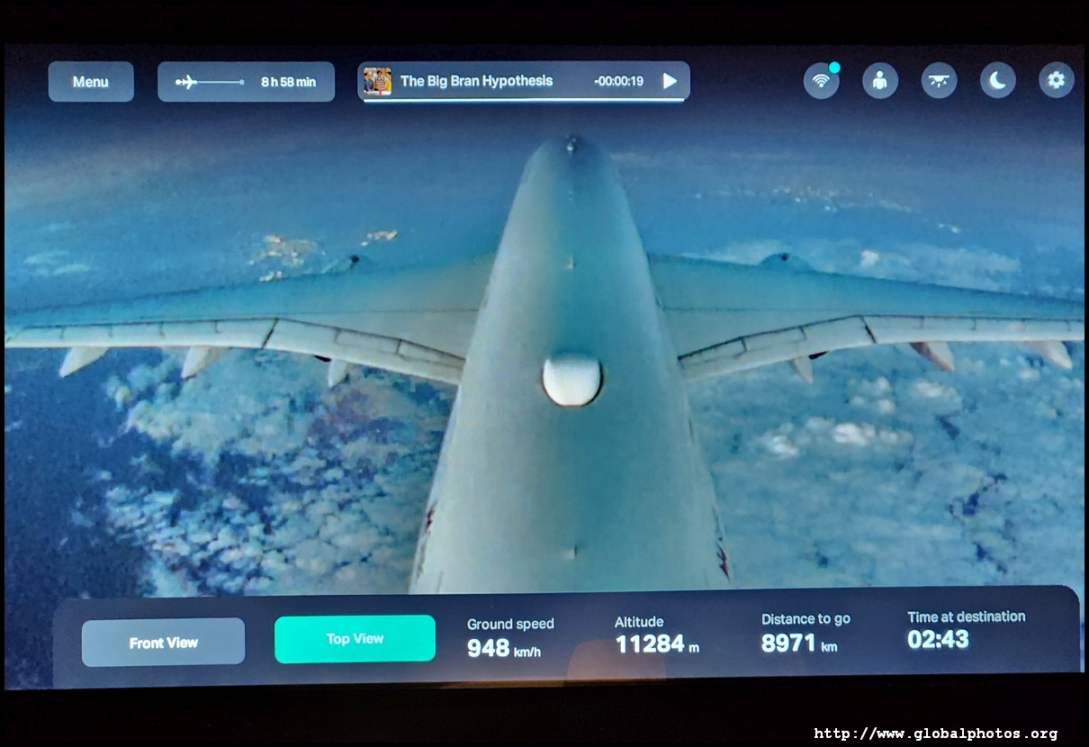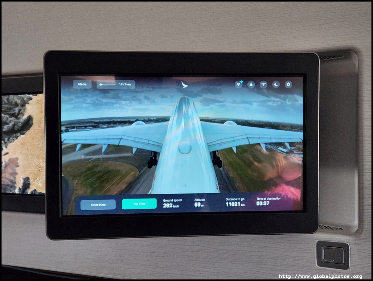 We pushed back just 14 minutes late, which is quite remarkable given how late boarding started. We taxied for a while and took off just after 5:30pm. Without a window, I turned on the plane's camera for a bird's eye view of the scenery as we bid farewell to London, taking off towards the west then looping around southeast to cross the English Channel. There are 2 cameras available - one beneath the belly and the other on the tail.