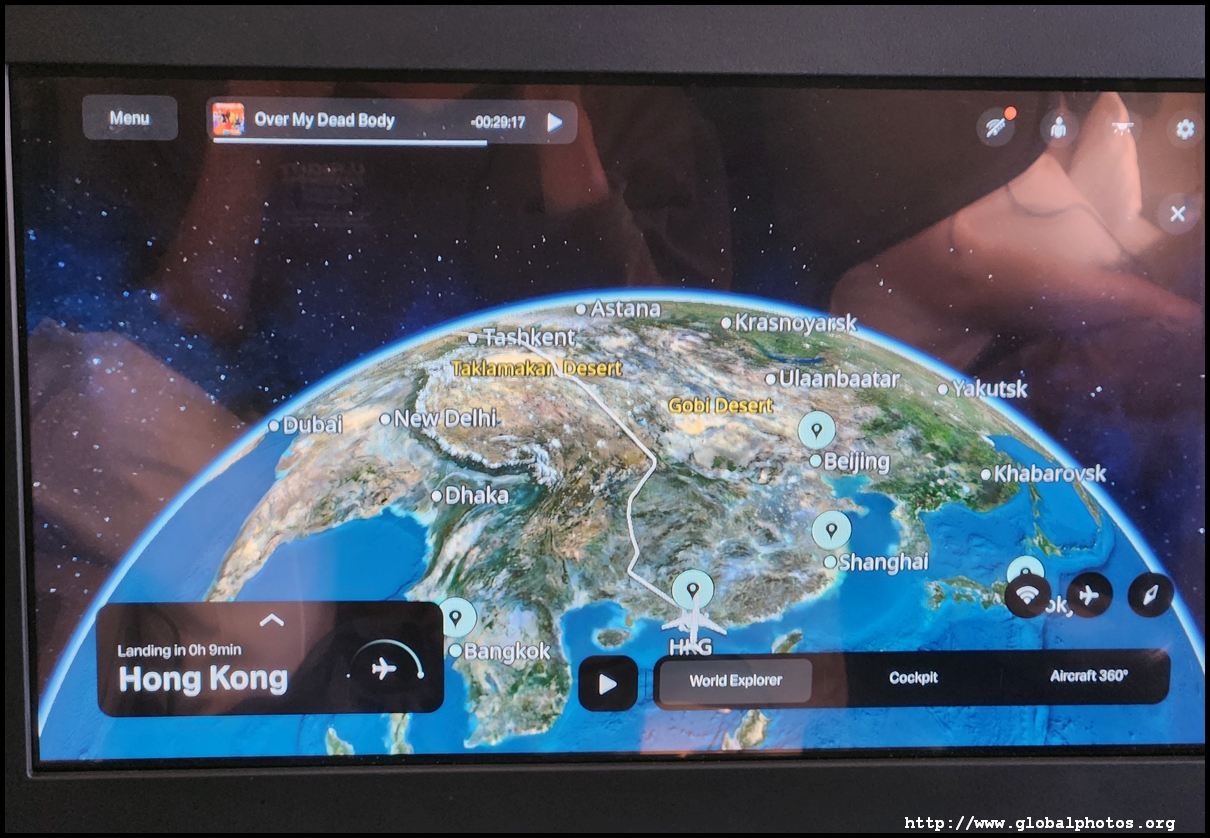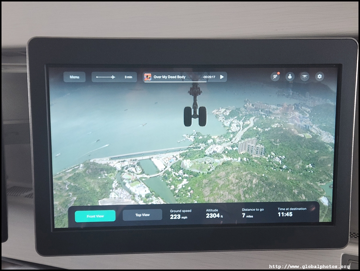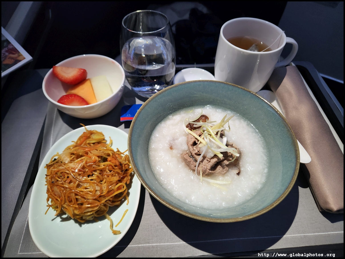 As we neared Hong Kong, it was time for breakfast. The selection was quite similar to Economy Class - a noodle, dim sum, or a congee. I guess you can't spice up the breakfast menu so much compared to the other meals. However, the portions and presentation are much better in Business Class while you get a better tea bag as well. Cathay uses Jing, a fairly good tea brand and their tea menu includes a fairly wide selection to choose from.