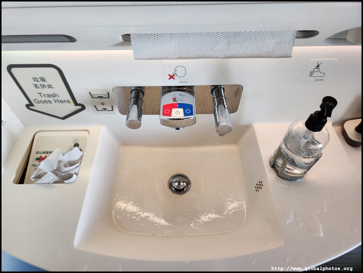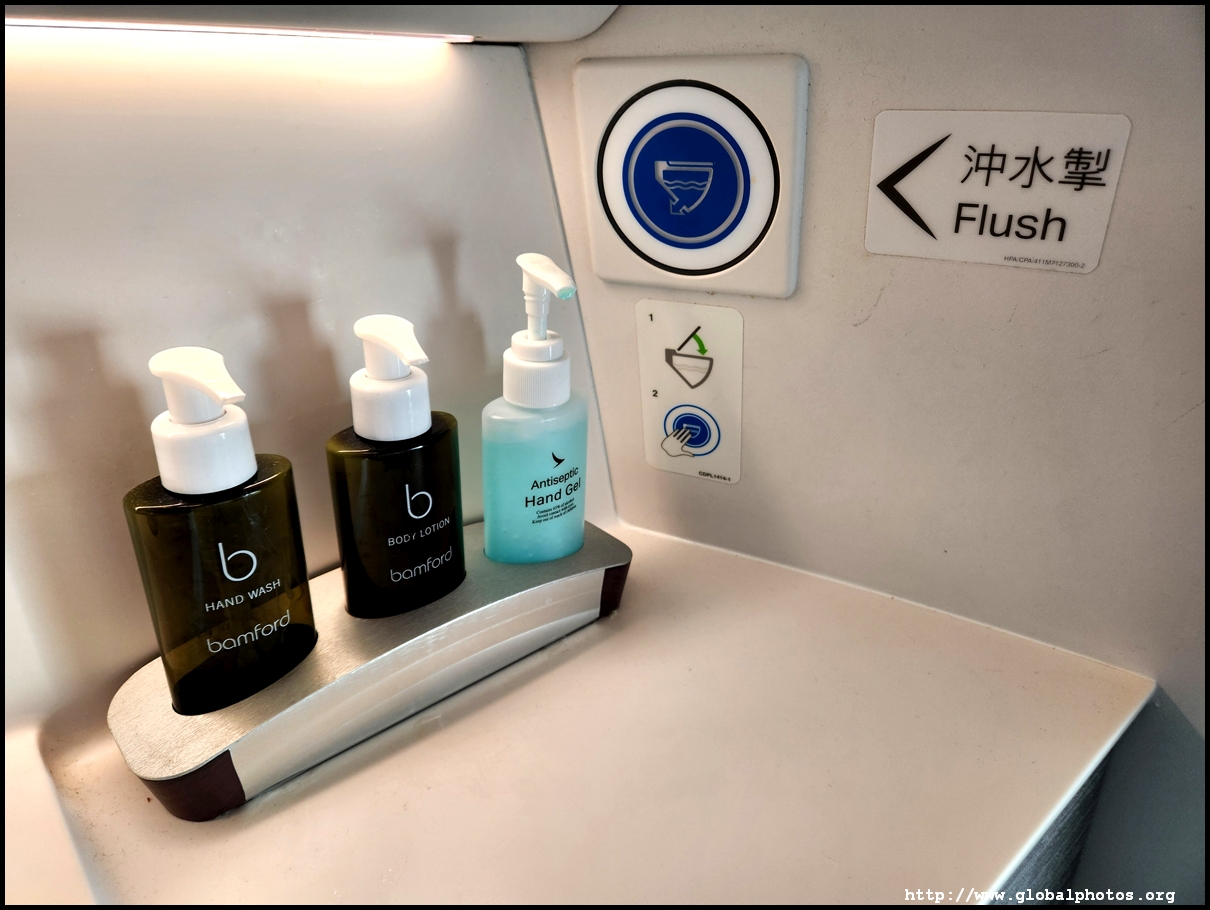 Since all Business Class seats have direct aisle access, I was comfortable to drink a lot more on board, whether it is water or tea, and visit the lavatory often to get some exercise. The A350's lavatory is quite nice with a big wide sink. I also like to use the body lotion to keep hydrated and the alcohol gel comes in handy after touching all the surfaces. The window is also a good draw to visit.