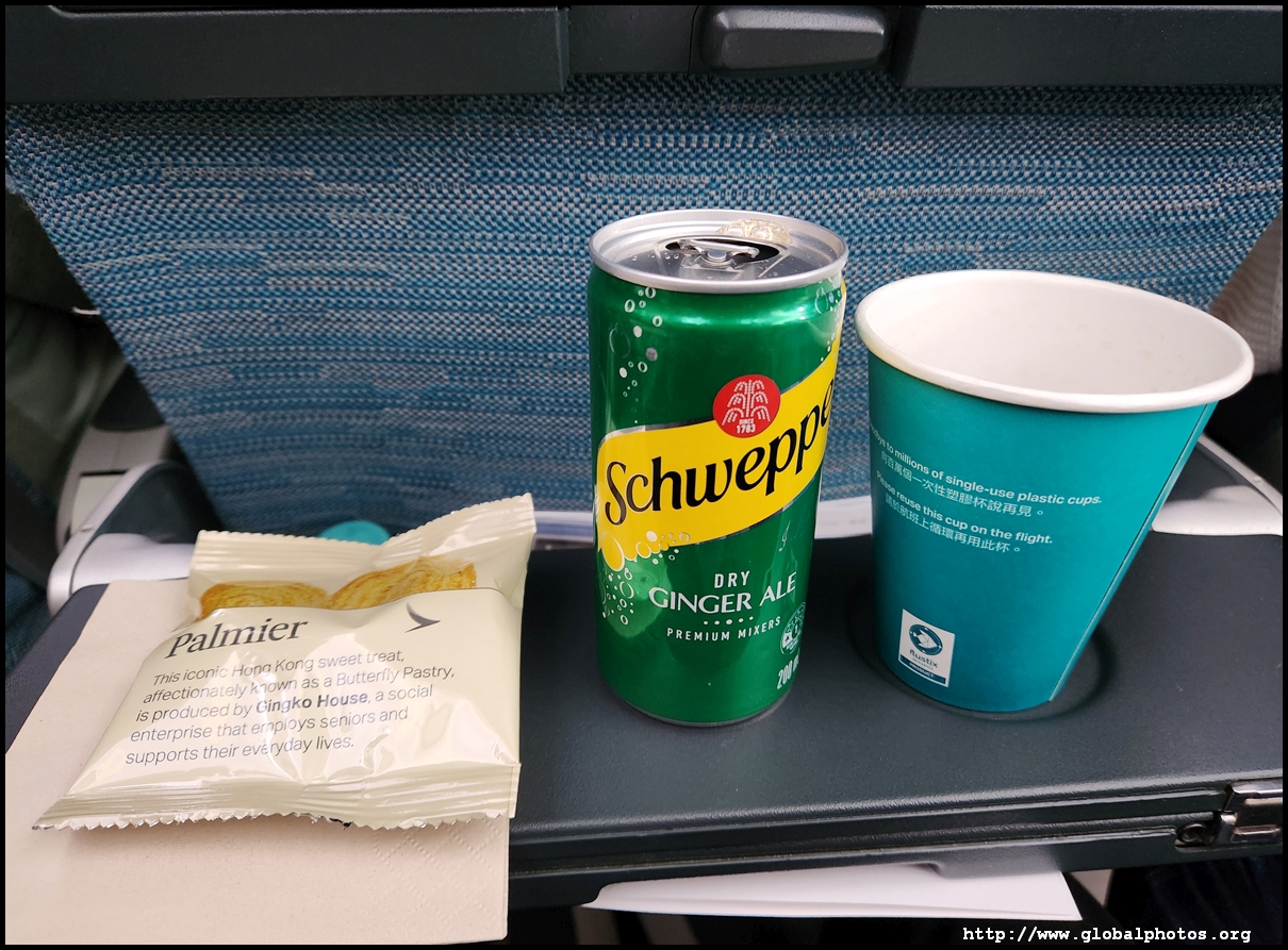 It didn't take long for the crew to serve a first round of drinks and a snack, a palmier from a Hong Kong enterprise that employs seniors. I've eaten at their restaurant before in Central's hillsides and all the waiters and waitresses were seniors at the top of their game. Service was great and it's a place I like to support with my wallet so I'm quite glad Cathay also feels the same way.