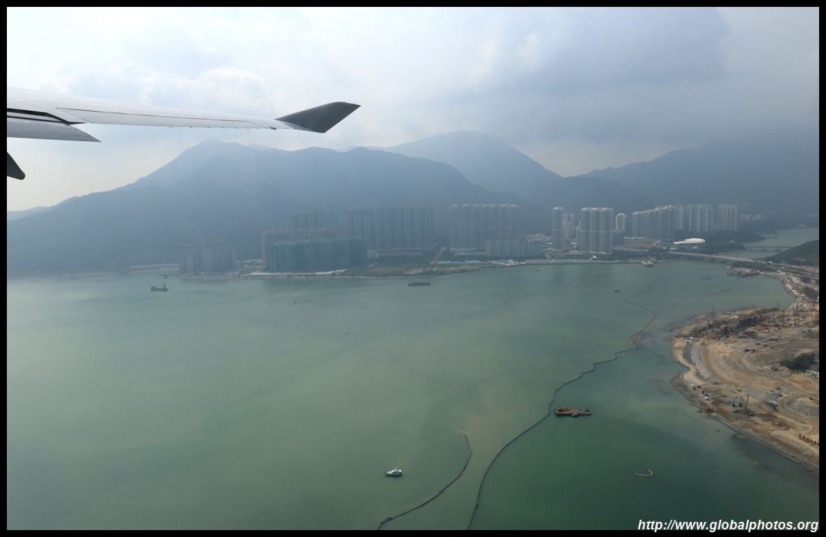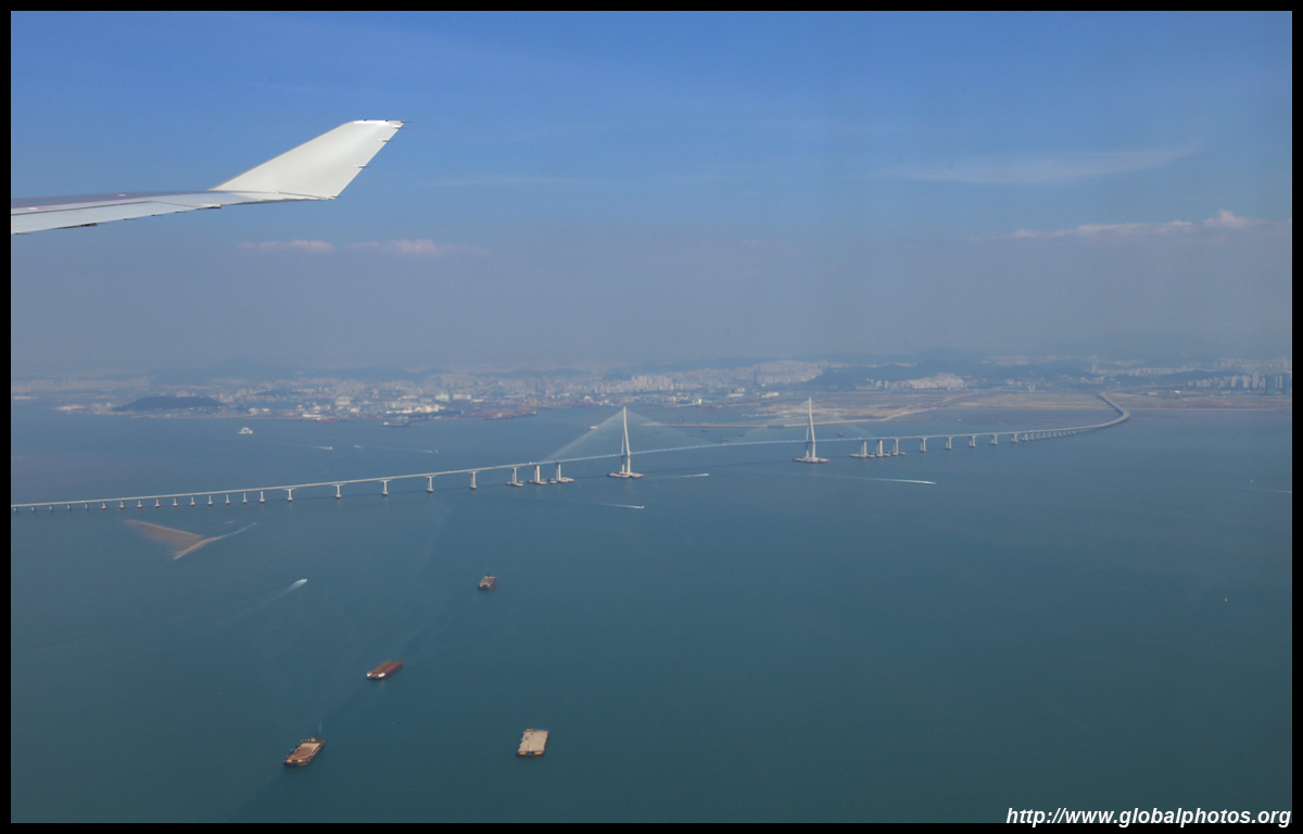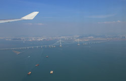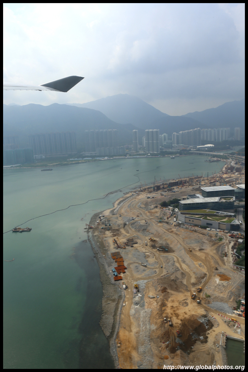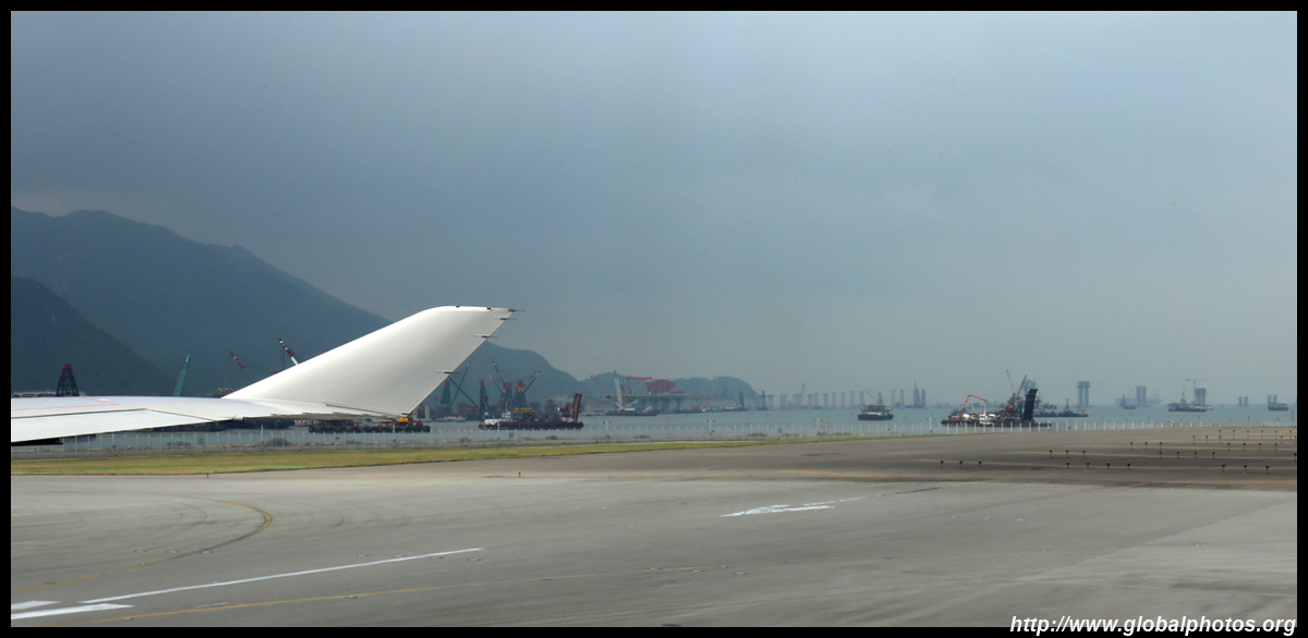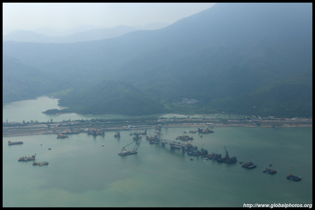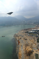Off we go. The airport island is changing rapidly with the new bridge to Macau under construction. Reclamation is under way and the new bridge pillars are clearly visible.