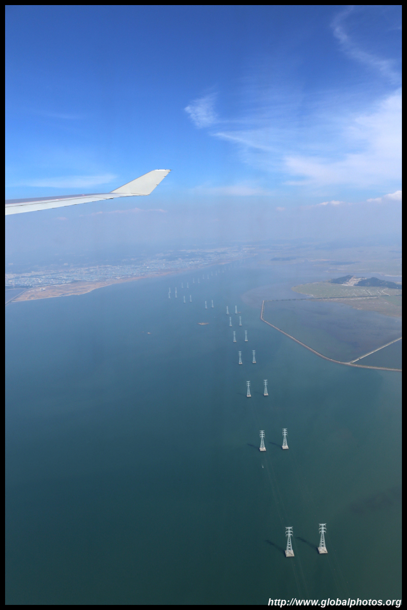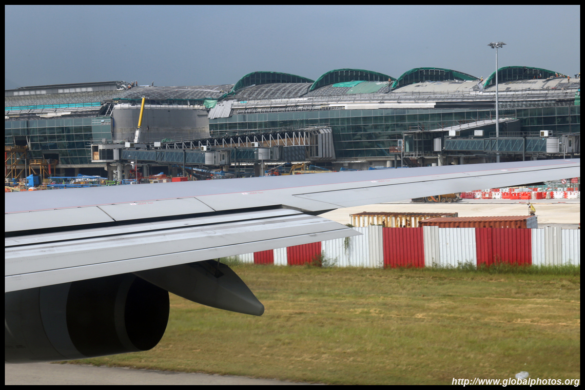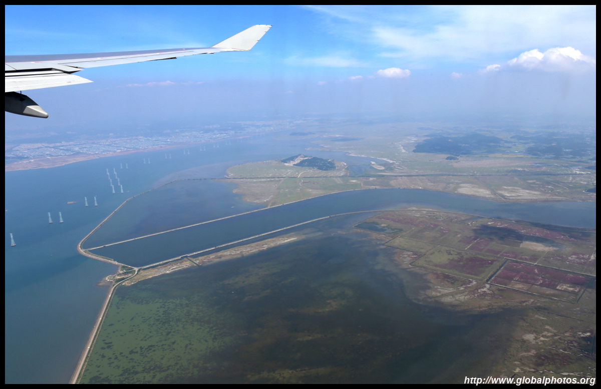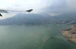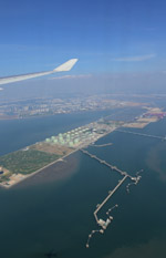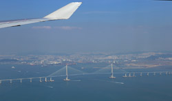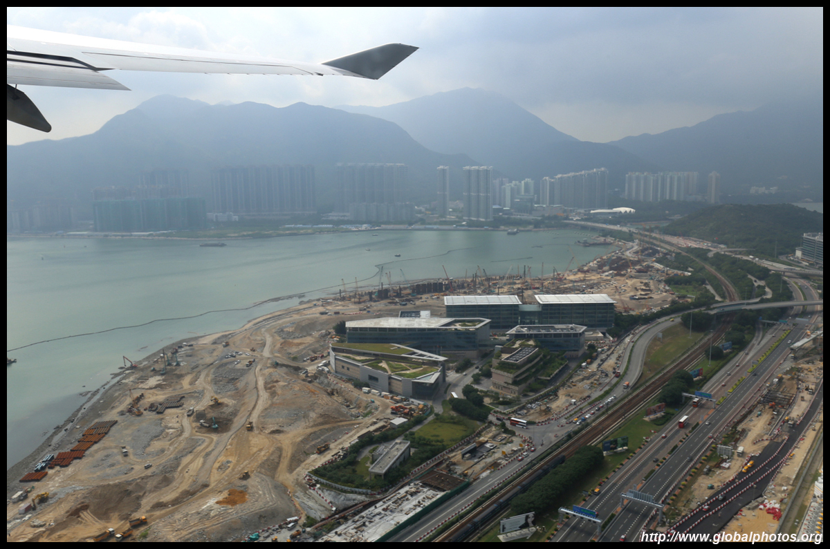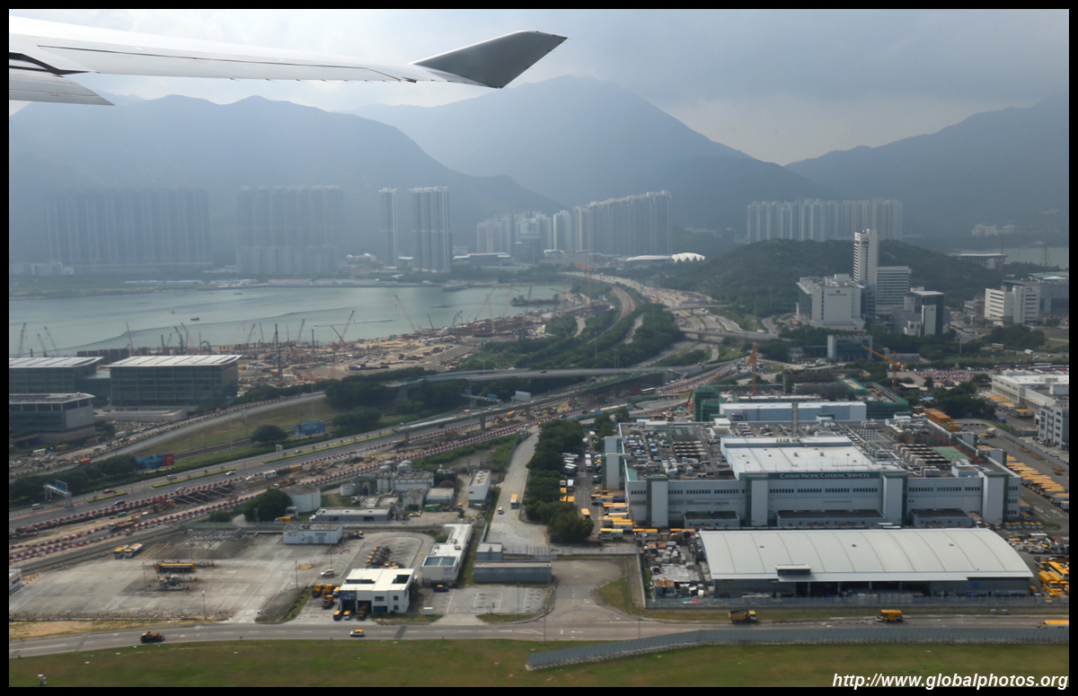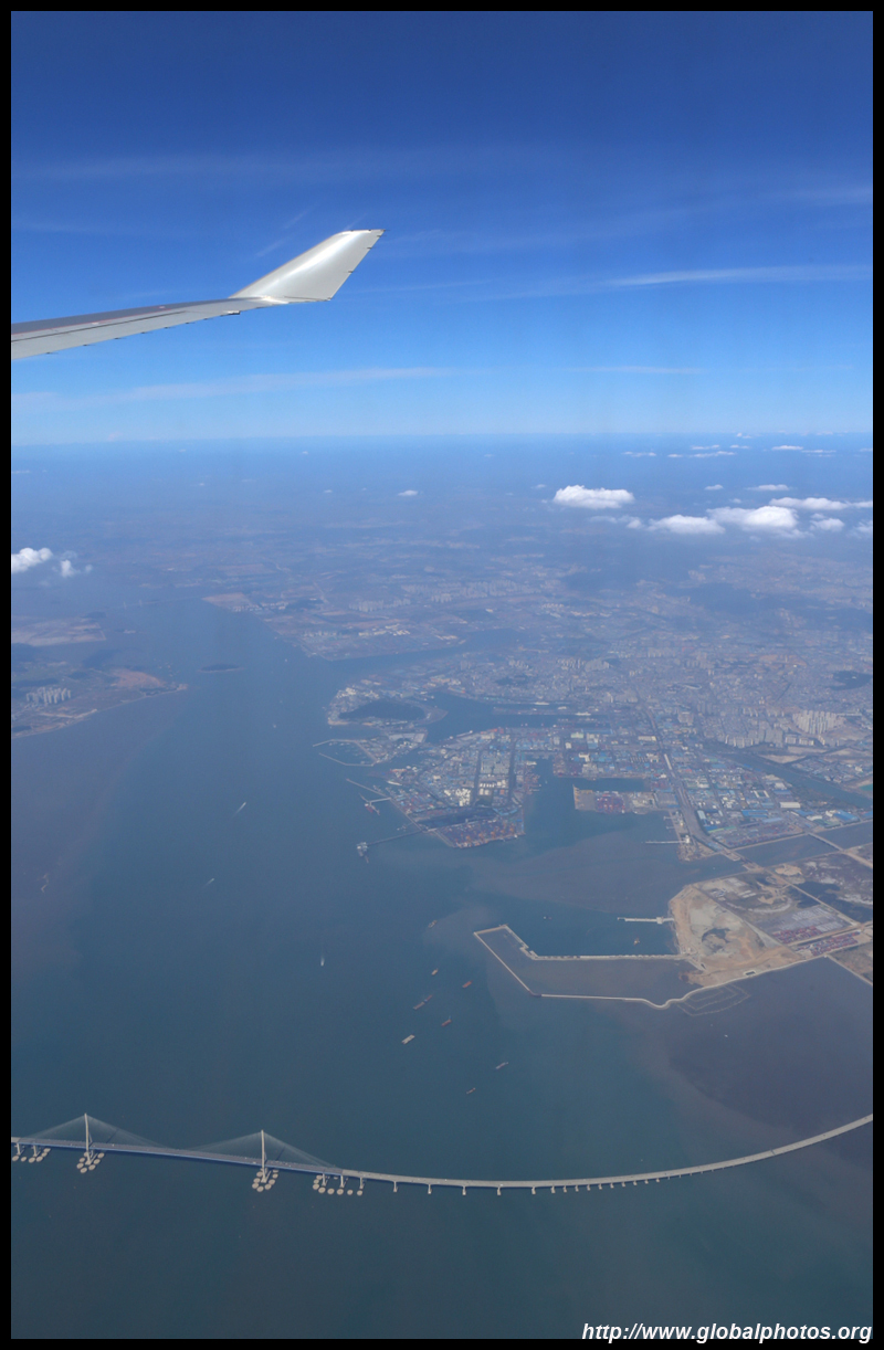Off we go. The airport island is changing rapidly with the new bridge to Macau under construction. Reclamation is under way and the new bridge pillars are clearly visible.
