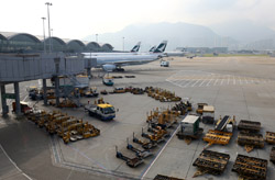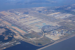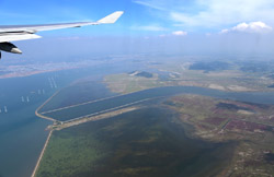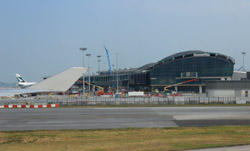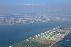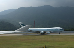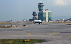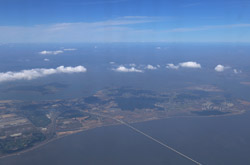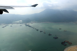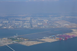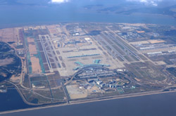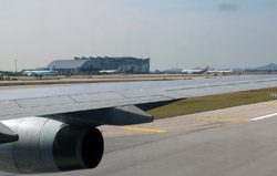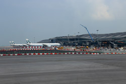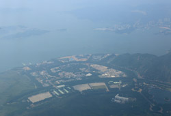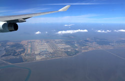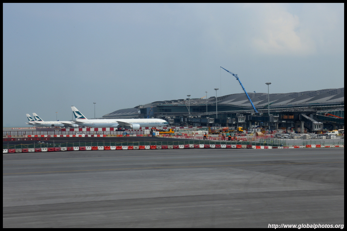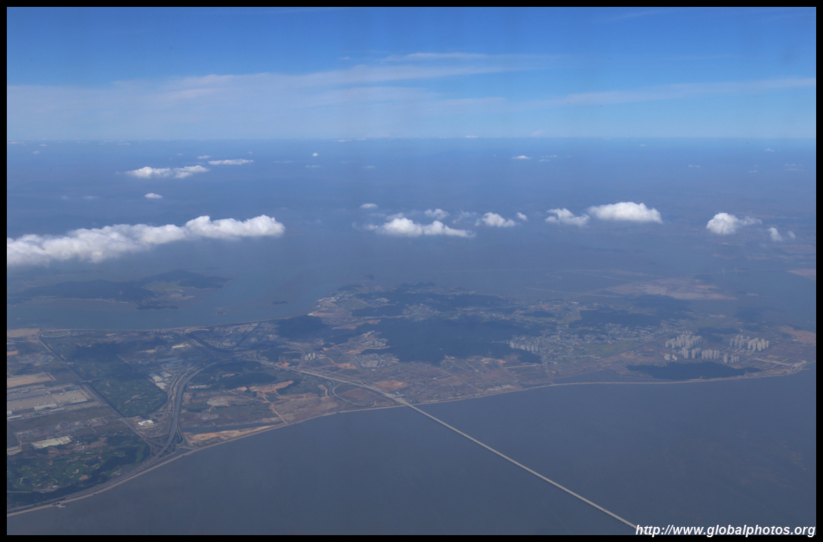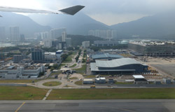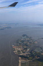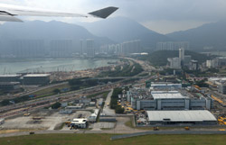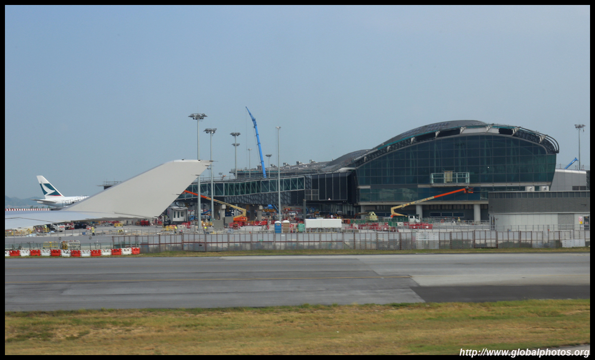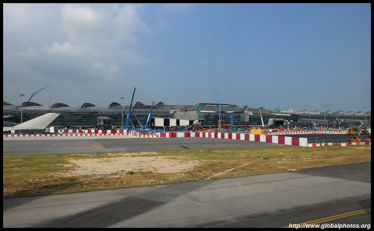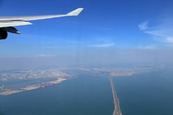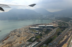 Off we go. The airport island is changing rapidly with the new bridge to Macau under construction. Reclamation is under way and the new bridge pillars are clearly visible.