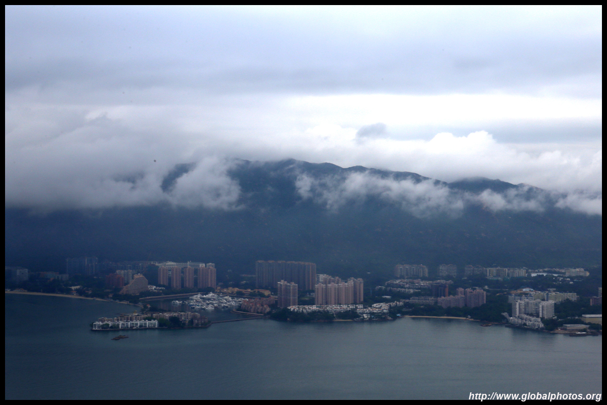 The suburb of Ma On Shan has a dense but thin corridor of residential skyscrapers facing the water.