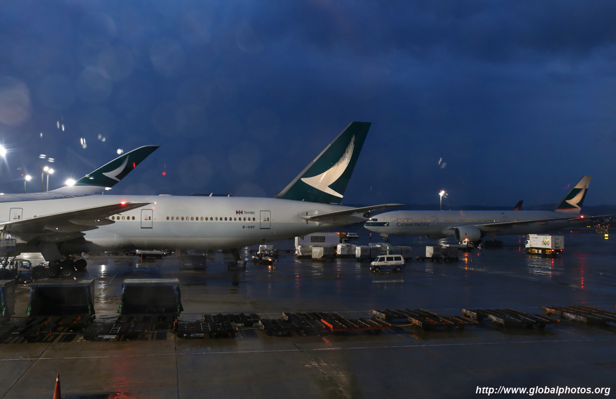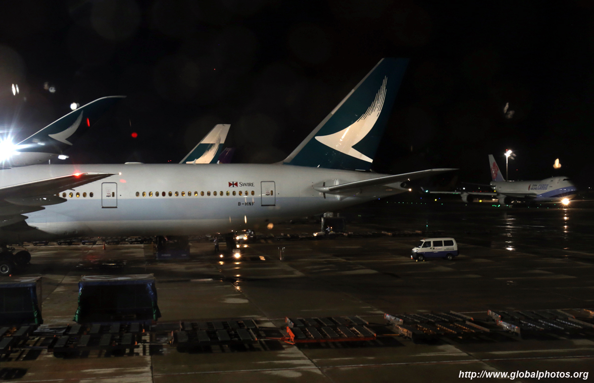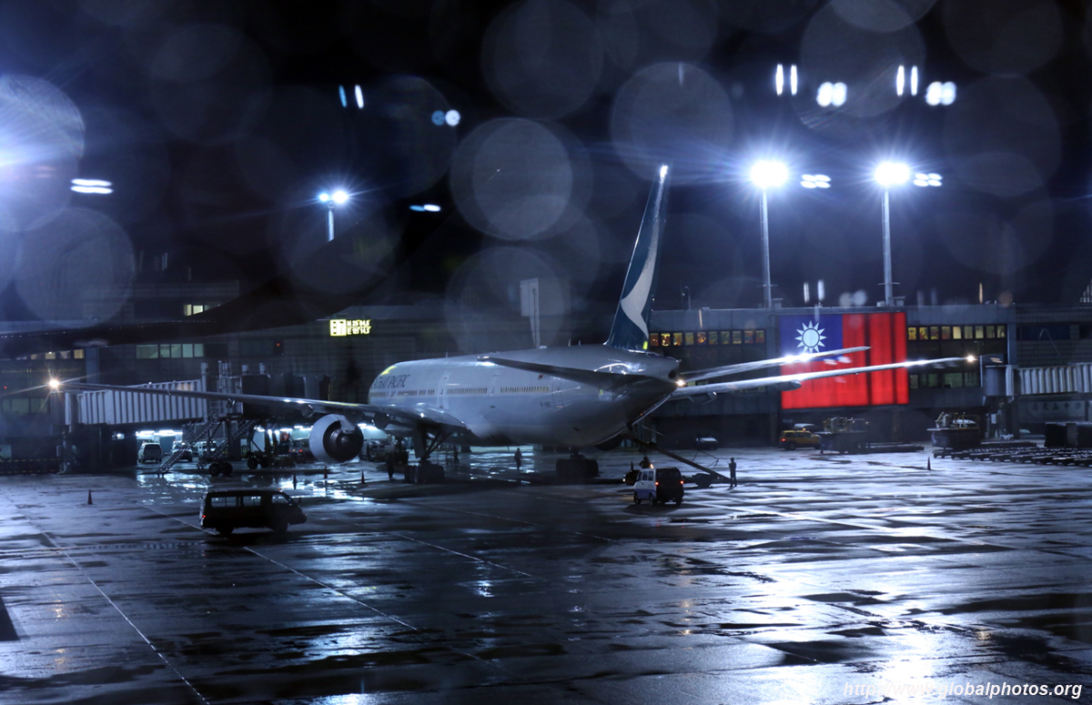 We would depart just as the sun sets and the sky lights up in a bright but dark blue hue. Although there are now direct flights between Taiwan and mainland China, Cathay continues to run frequent services between the two sides. You probably can't find as many Cathay jets parked at an outport as Taipei.