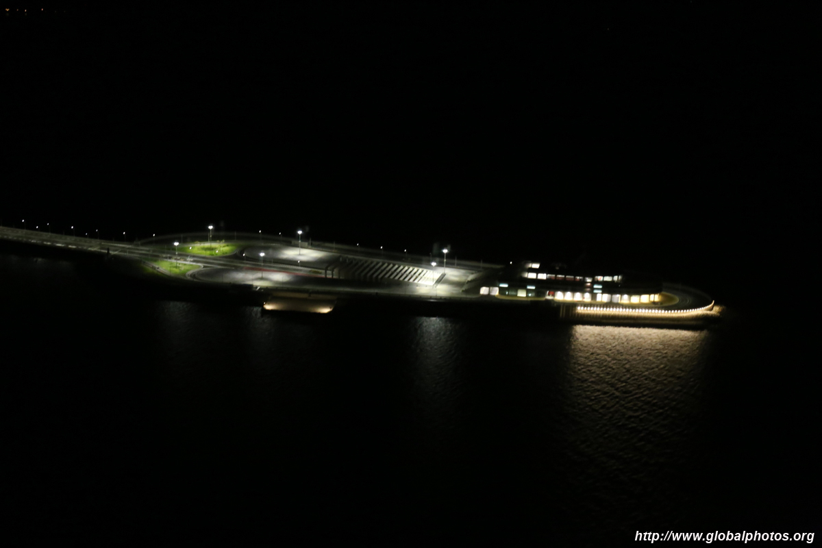 On final approach, the lit-up Hong Kong - Macau - Zhuhai Bridge and its 2 tunnel entrance islands were easily spottable.