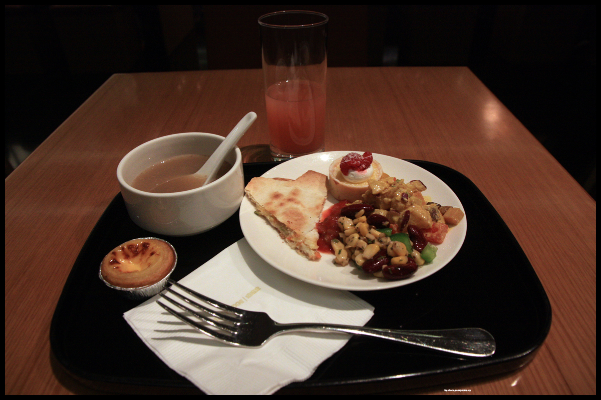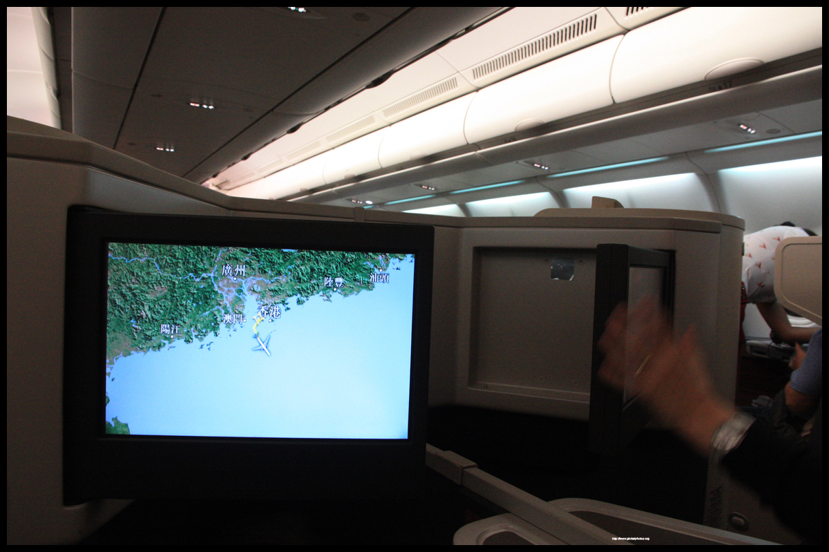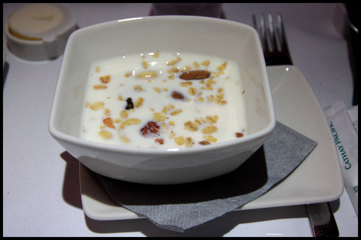 Airshow was not working properly and it kept showing 1 minute to arrival. Menu cards were distributed and we were going to be served breakfast later. Understandably, there was no drinks/wine menu. We took off towards the sea and then looped around to start our eastward journey to Hong Kong. I quickly fell asleep and awoke 2 hours prior to landing when they turned on the lights to serve breakfast. Trays were brought out individually, which I interpreted to be more discreet as many passengers were still sleeping. One crew member walked around with a bread basket and another asked whether I wanted some cereal and later, what main I would like. Service was efficient and I went back to sleep after the quick bite.