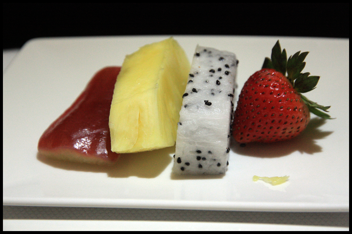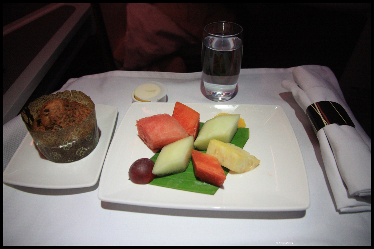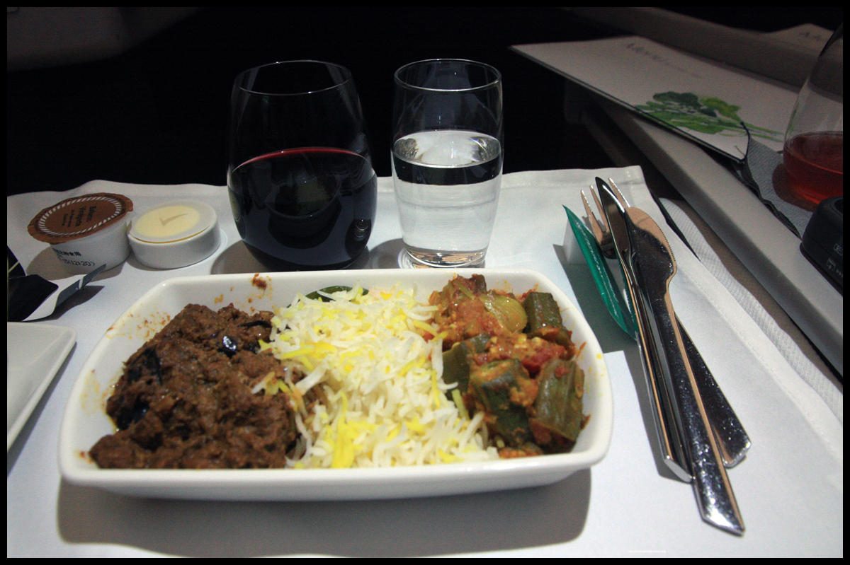 Dinner service came next about an hour after we pushed back. There were only 3 choices today, a seemingly small number, with 2 of them being Indian. The lamb dish tasted all right, but was not filling, so I had to go for fruits and cheese at the end. There was no ice-cream but cake was available. By then, I was stuffed.