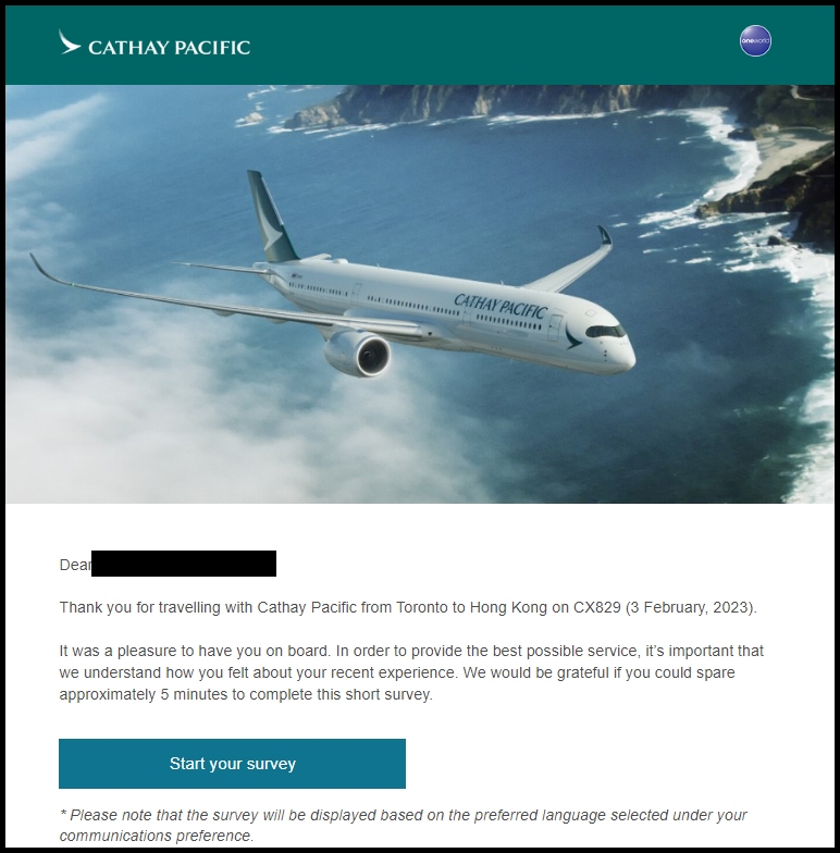 From time to time back in the old days, I would be asked to fill out a survey form on paper while on board with a free pen to keep. Things have gotten more tech-savy now. A few days later, I got an email to do a post-flight survey.
