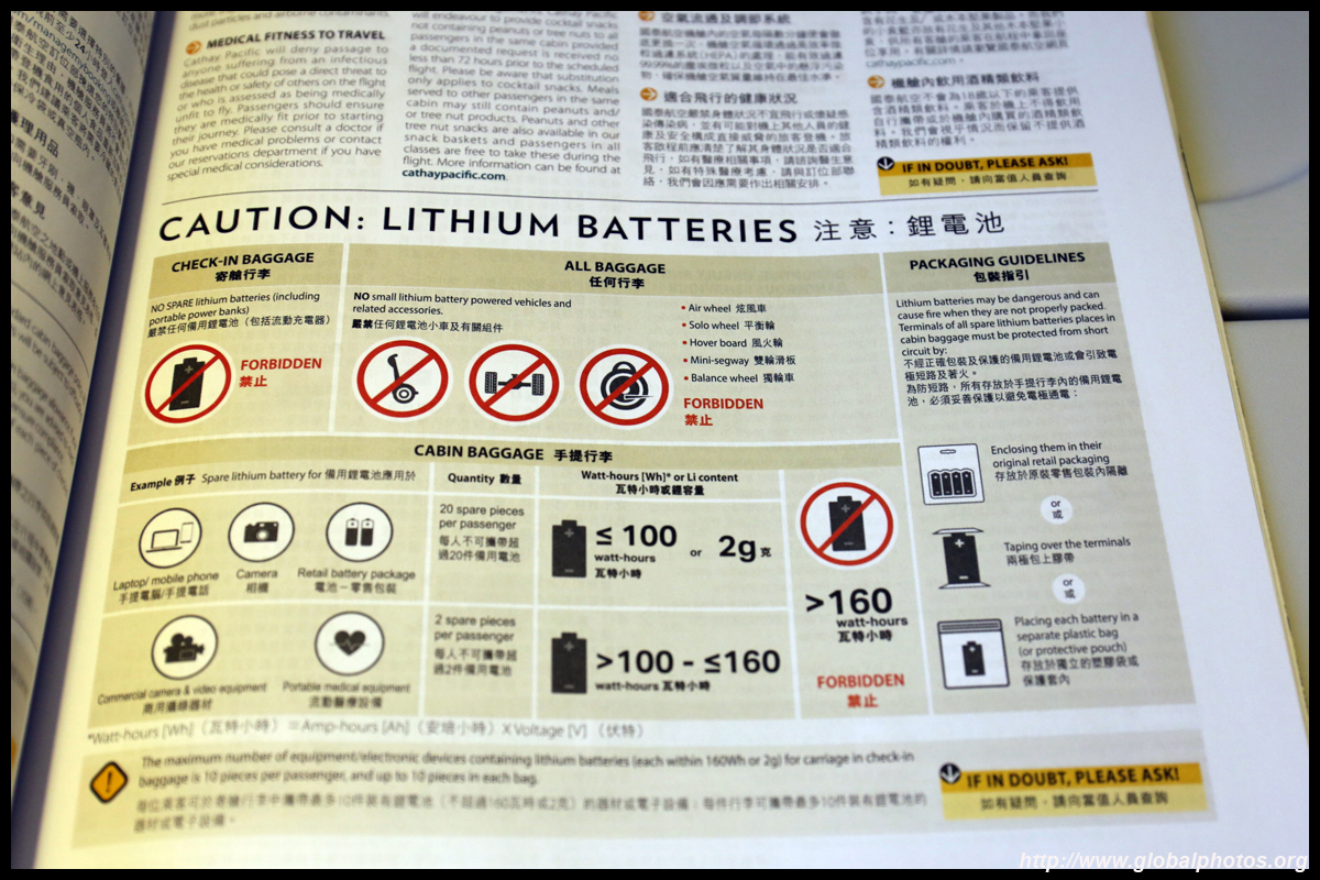 Lithium batteries catching fire on the plane has become a well-documented nuisance. Cathay forbids any litium batteries, including power banks, in checked bags. It wouldn't be nice to have a fire in the cargo hold.