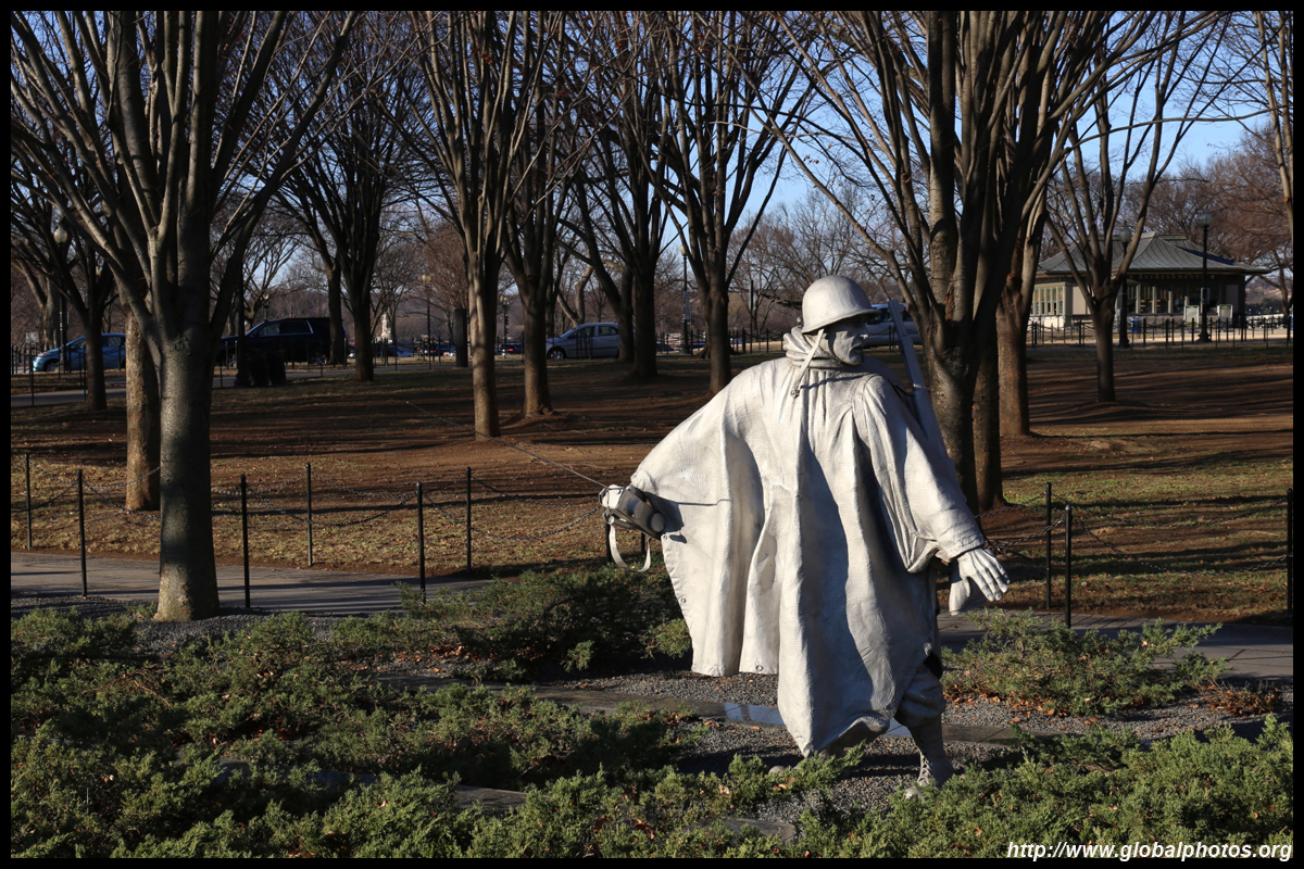 The Korean War Veterans Memorial was dedicated in 1995, 42 years after the armistice that stopped the war. 19 stainless steel statues in ponchos are seen moving towards the US flag, while the wall next to them bear images of over 2400 veterans.